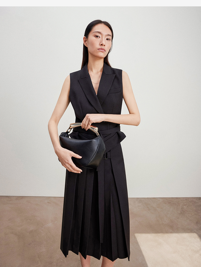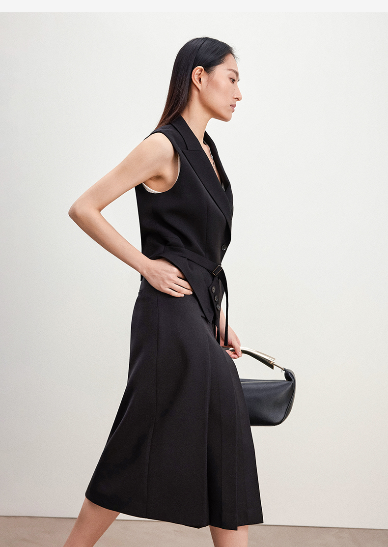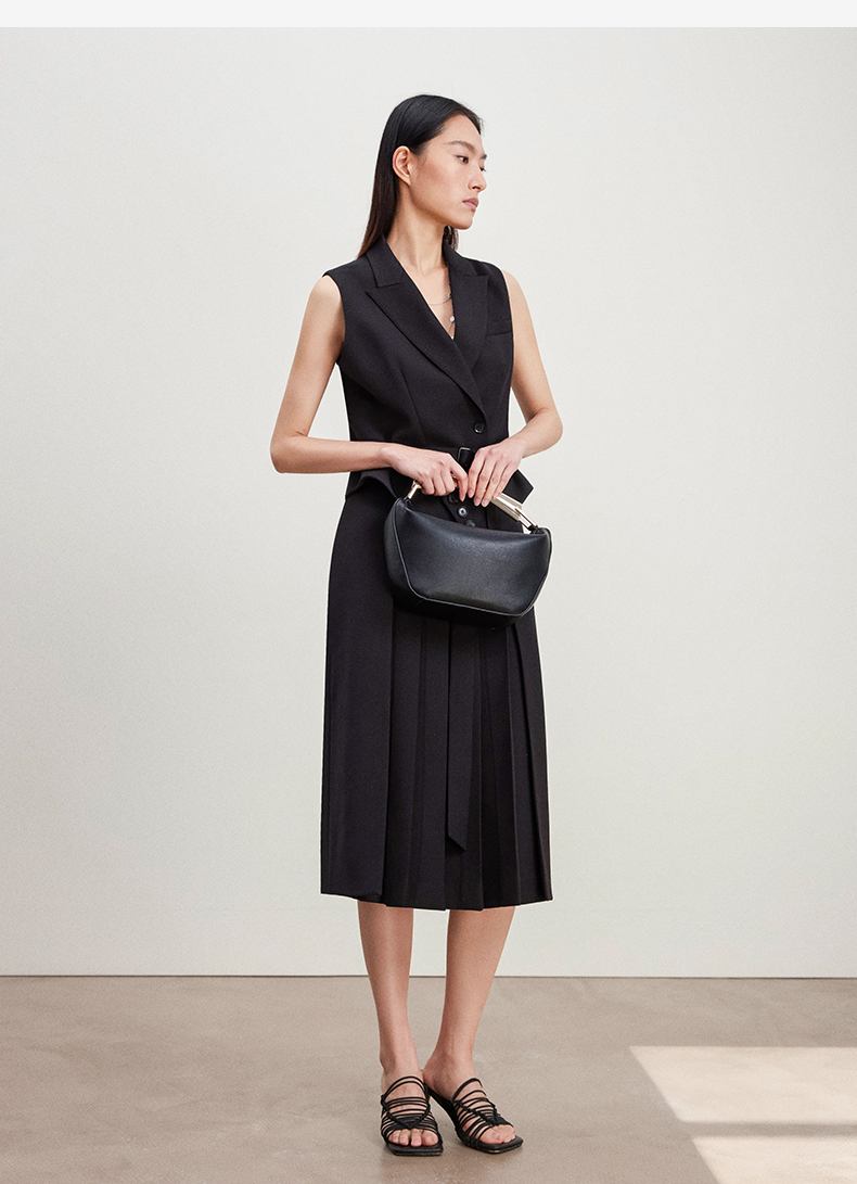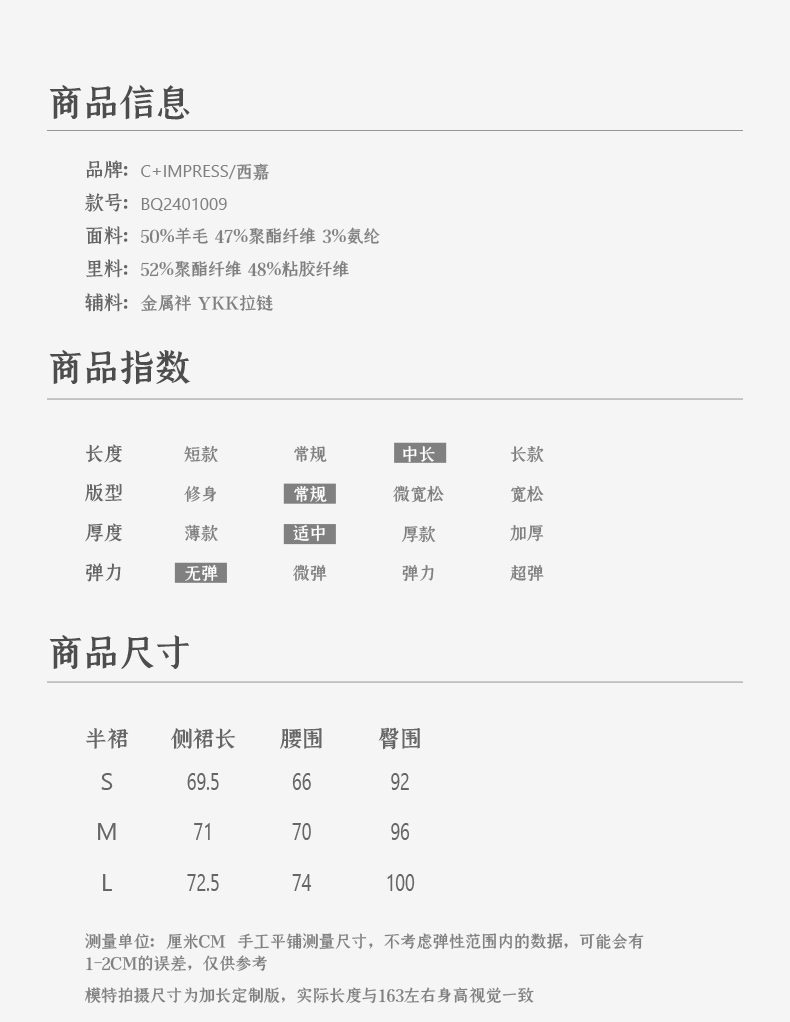 西嘉C+IMPRESS/西嘉精纺羊毛压褶黑色半身裙女春季新款设计感腰带短裙BQ2401009