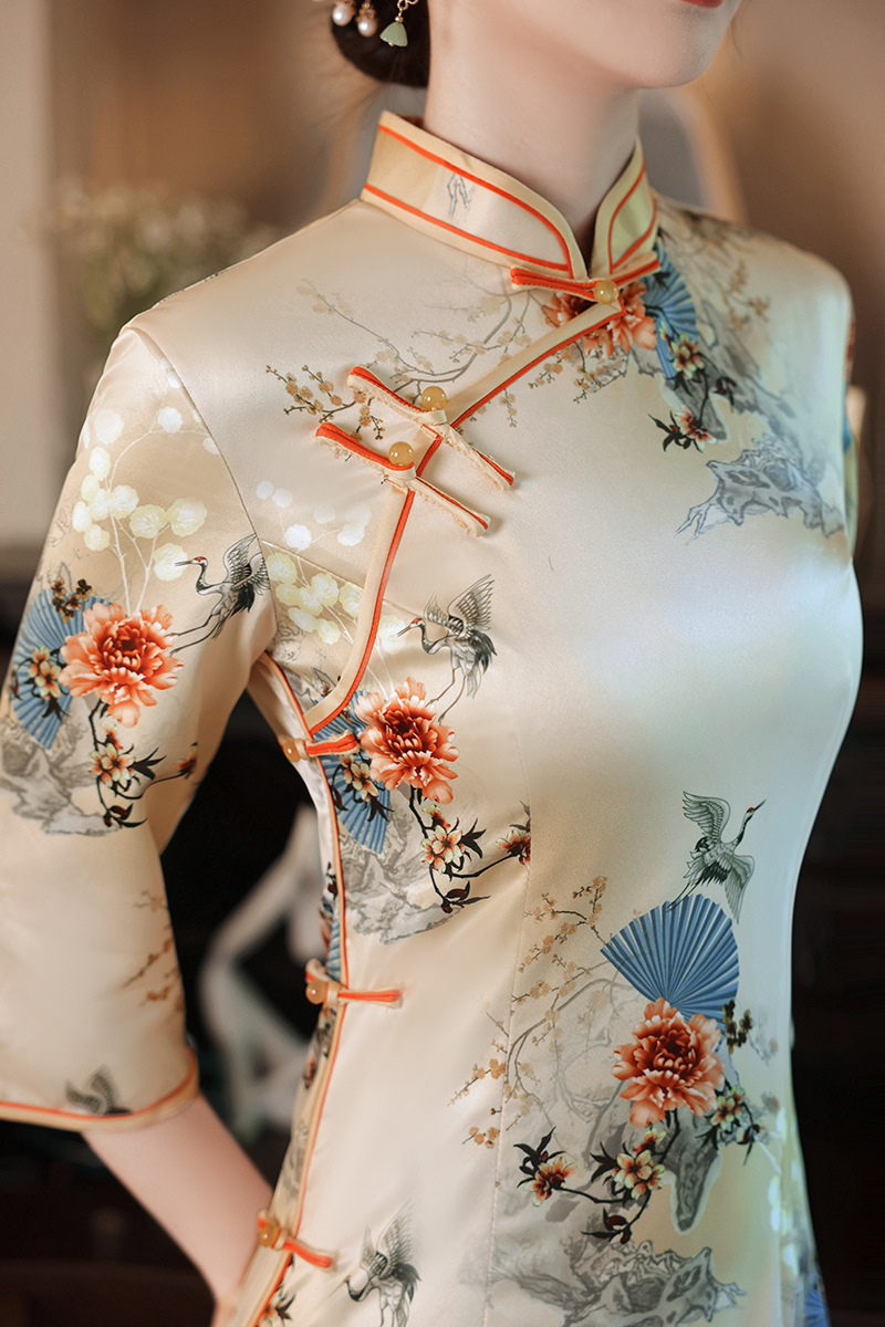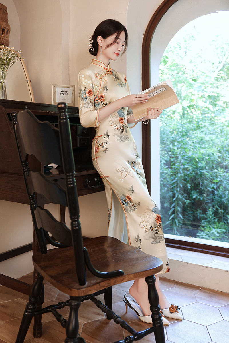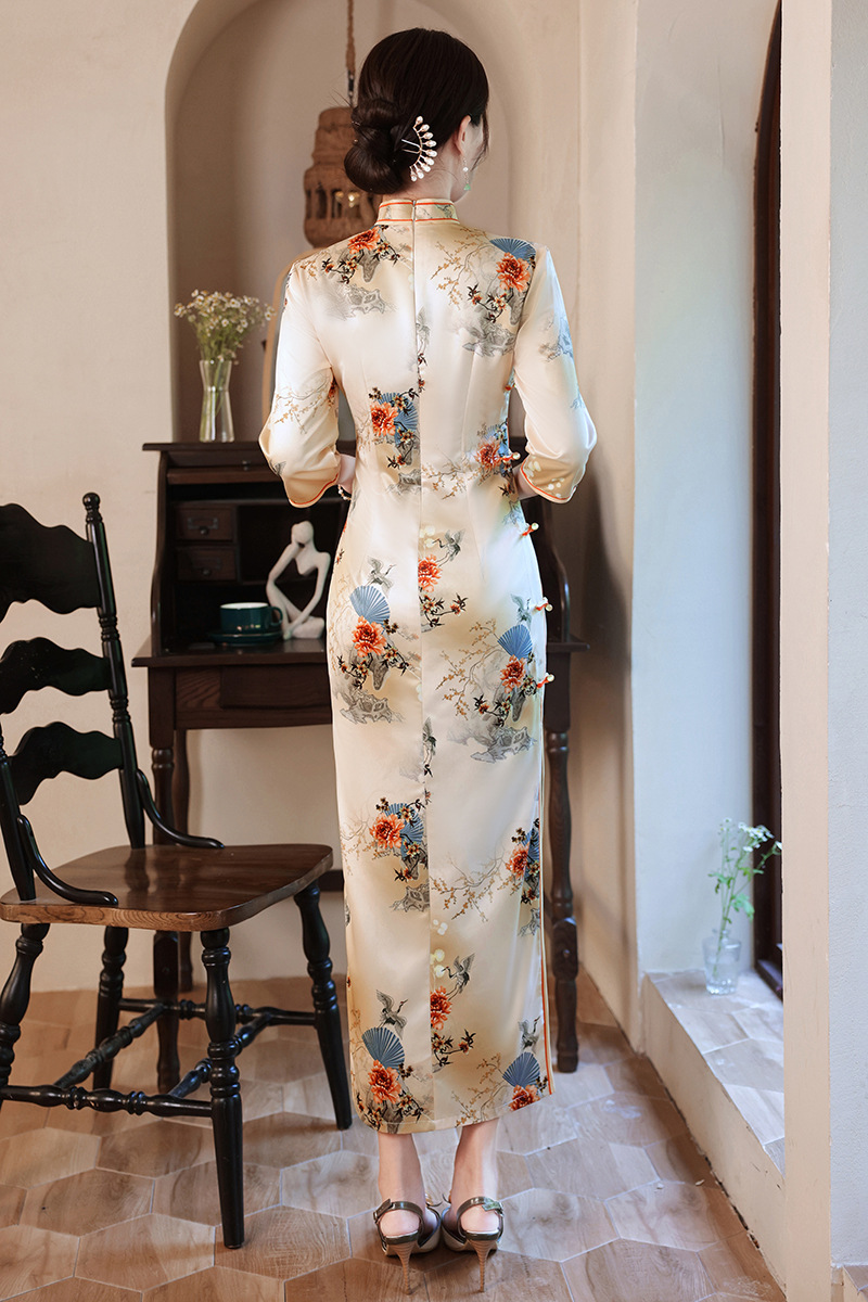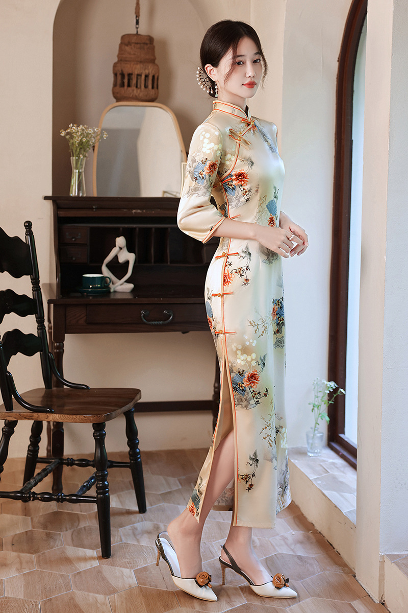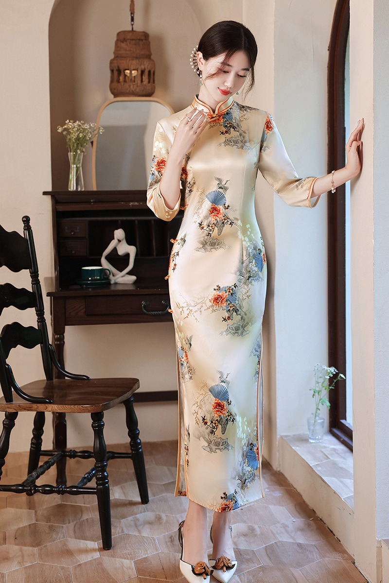 WQ2513中长袖双层长款旗袍2024新款女老上海走秀款演出服装