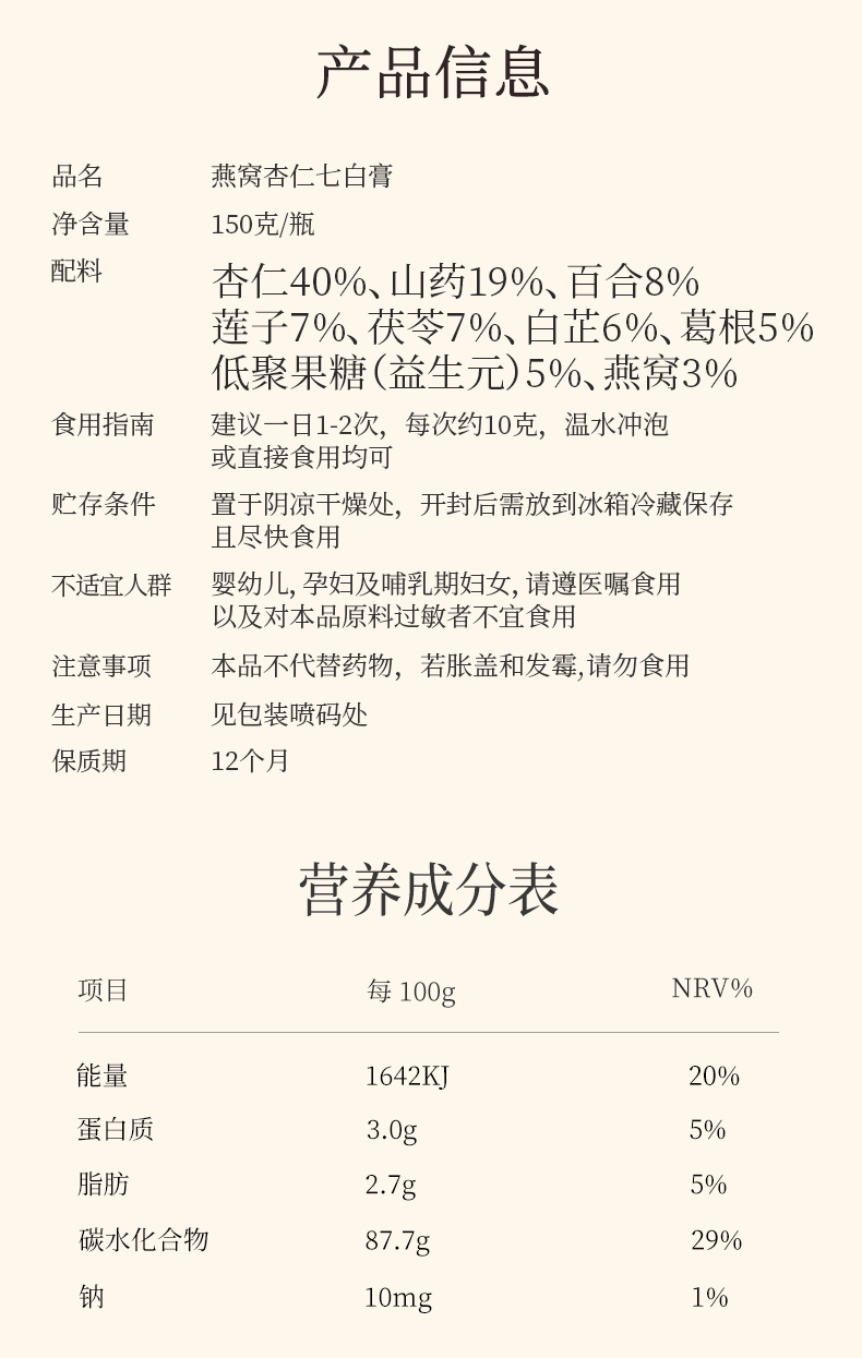 【以白养白,非遗认证】鲜百分燕窝杏仁七白膏150g,配料超干净,古方配比,甄选七位地道原材!