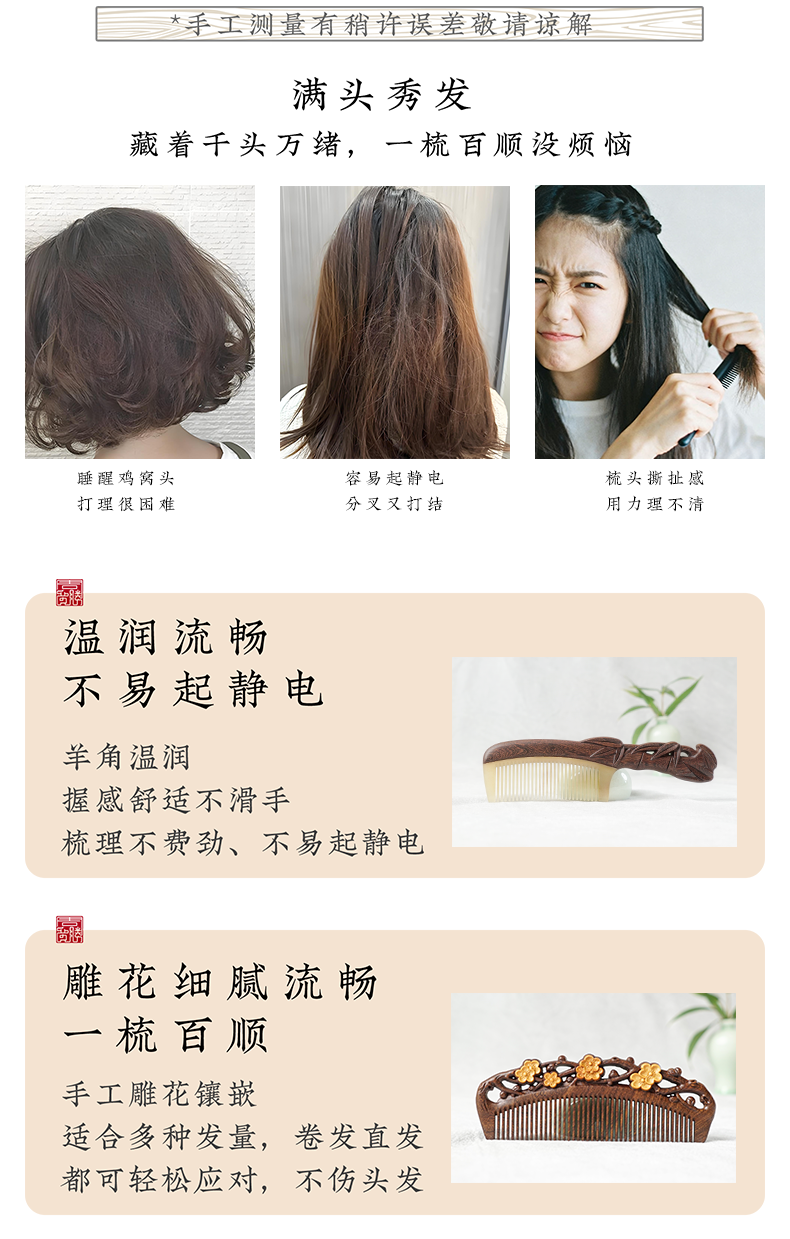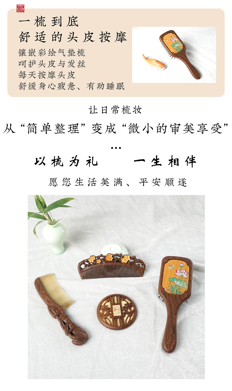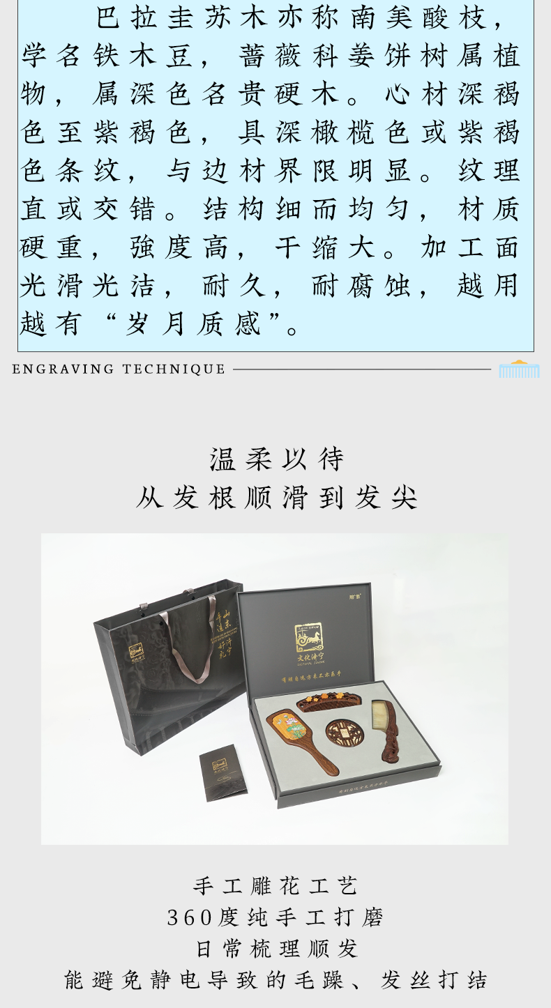 周广胜紫檀雕花珠语防静电按摩插齿梳子女士专用护发顺发礼盒