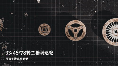 33、45、78转三档调速轮,7英寸、10英寸的黑胶唱片都能支持,覆盖主流唱片类型。