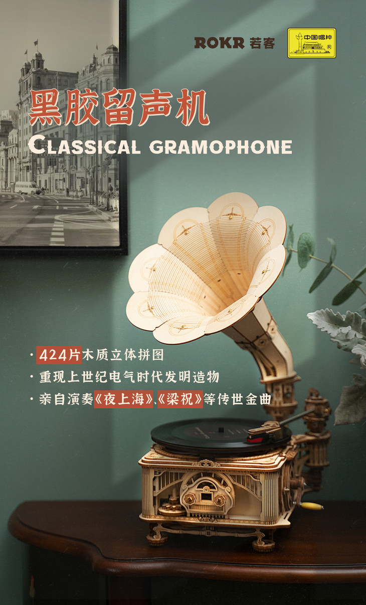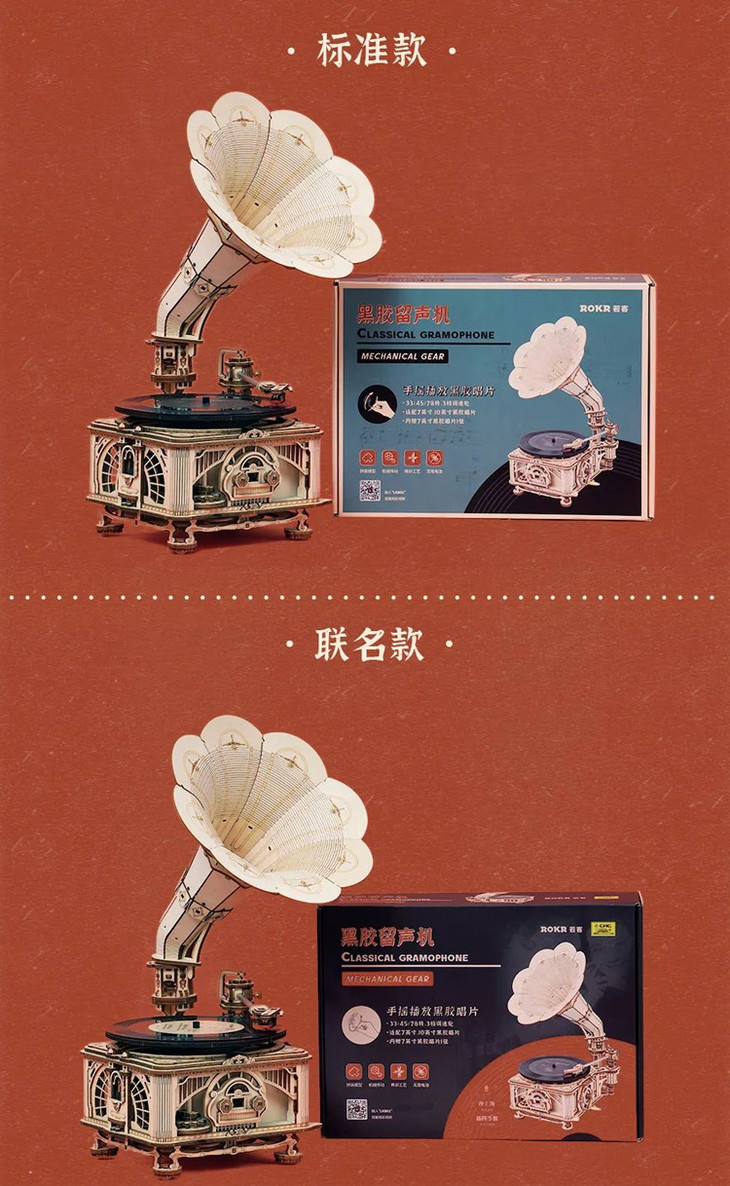 两款里的留声机零件相同,常规款的黑胶唱片为三首古典英文音乐,而联名款则惊喜收录了中国传唱百年的时代金曲:《夜上海》、《新四季歌》、《梁山伯与祝英台》、《春江花月夜》。