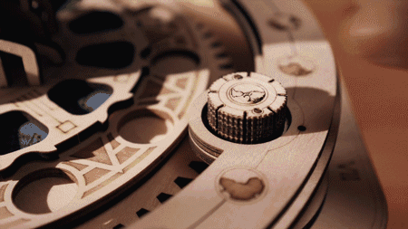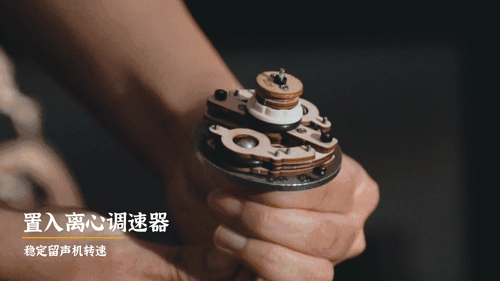 424片木质零件,采用齿轮配合以及榫卯结构打造,更从蒸汽机中获得灵感,内置离心调速器,让唱片播放速度平稳。