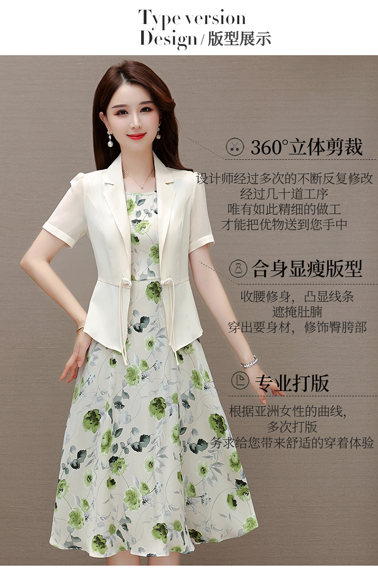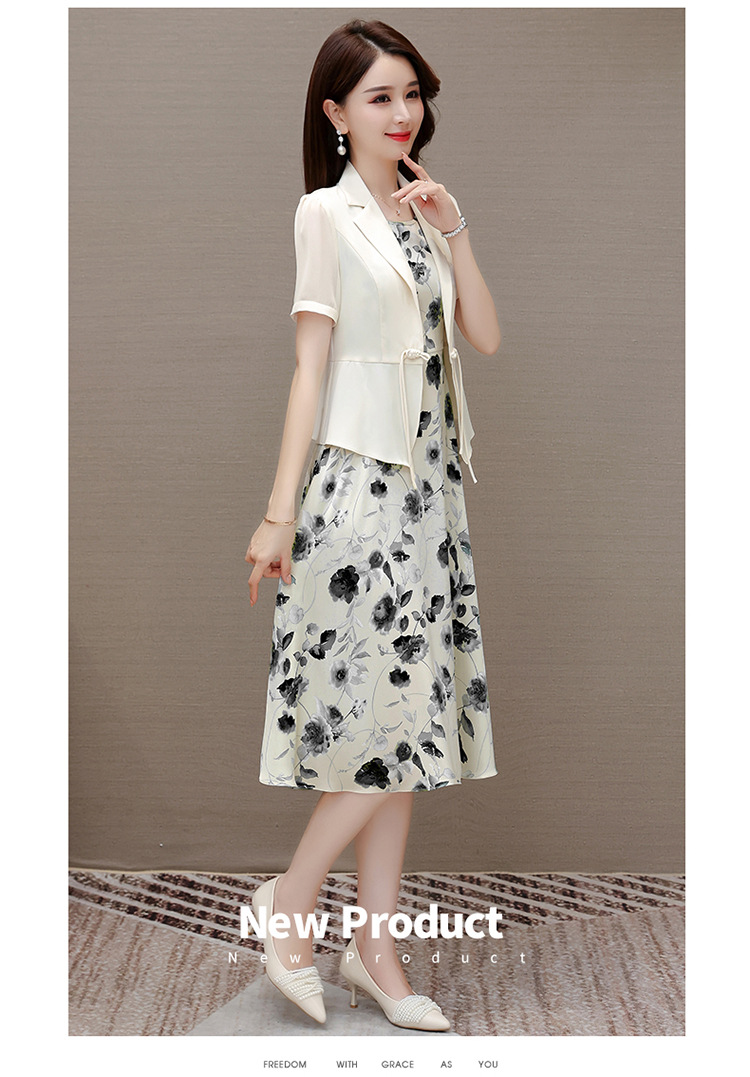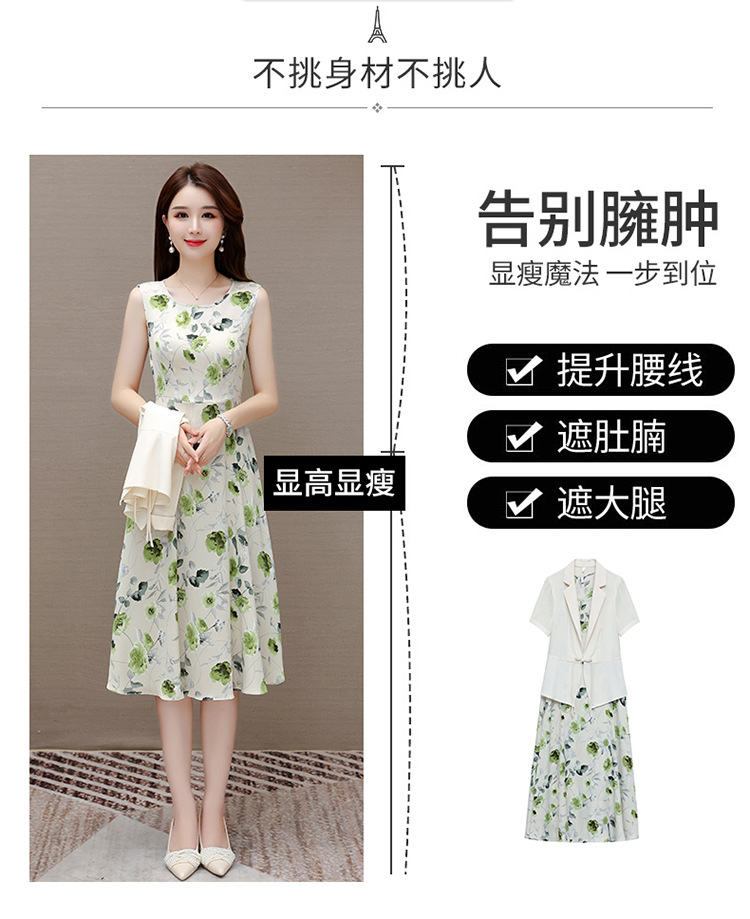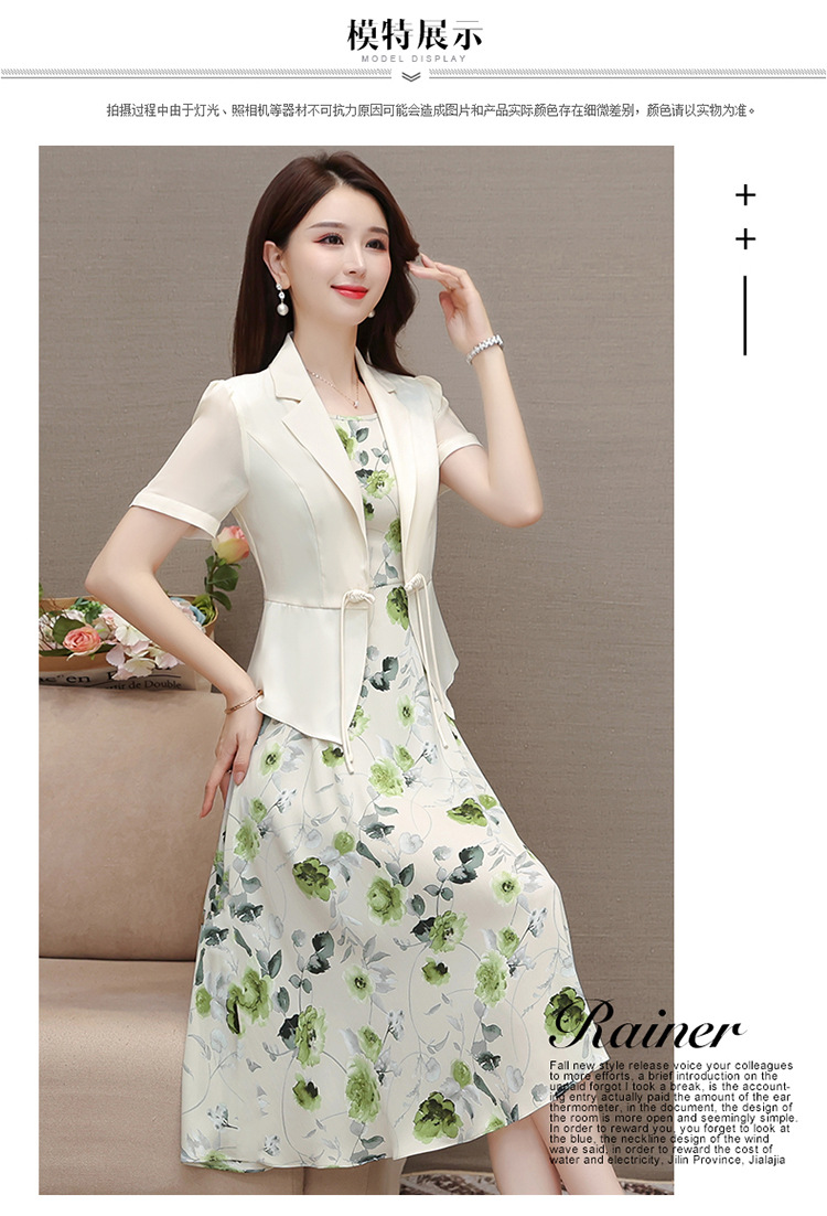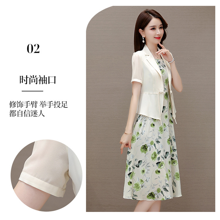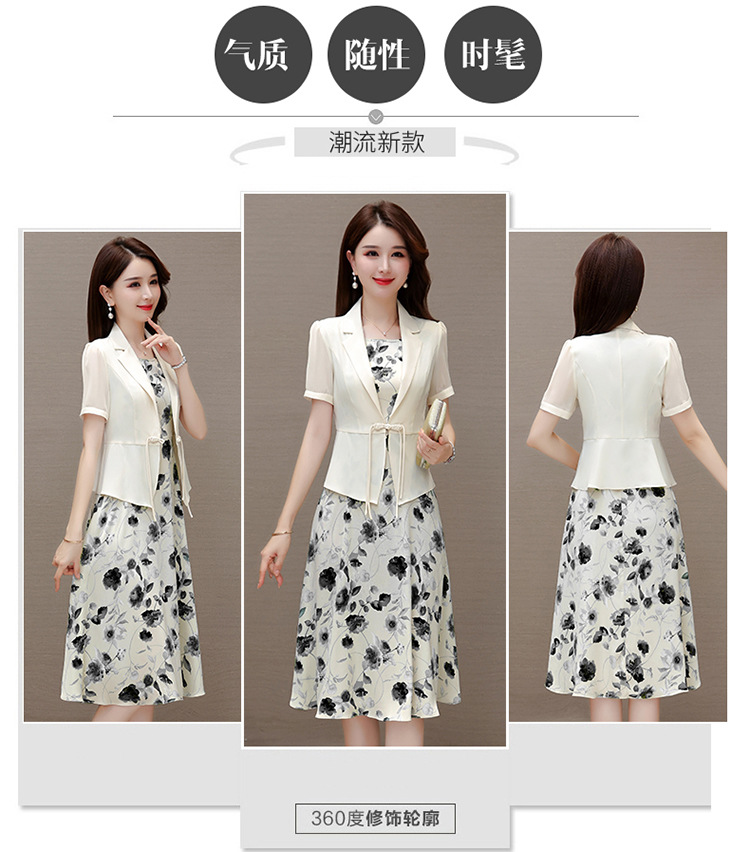 QYMXQD-11B2351-L2023年夏款印花简约中长款时尚雪纺连衣裙修身通勤短袖外披两件套