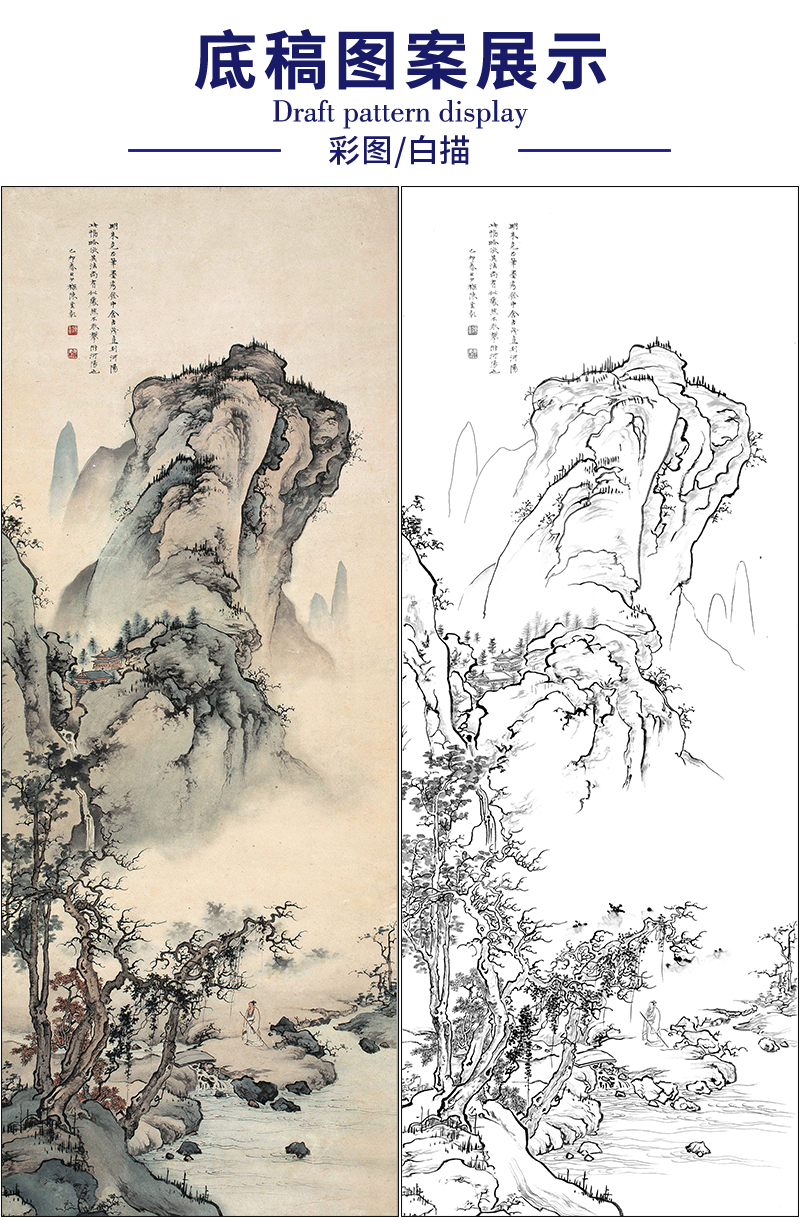 陈少梅山水人物工笔画白描底稿《秋山策杖》临摹勾线高清打印稿SM27
