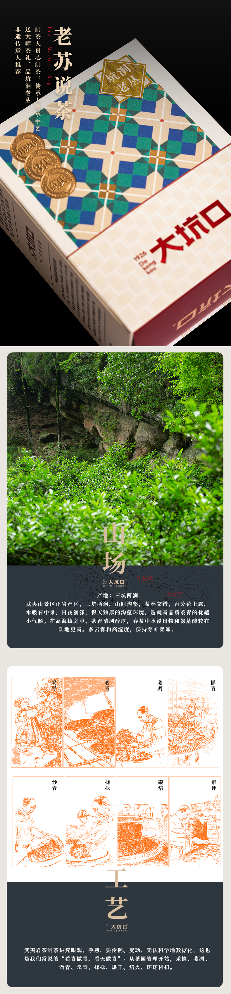 大坑口岩茶有限公司,位于武夷山市-天心村,茶山分布于正岩产区的“三坑、两涧”,由首批非物质文化遗产武夷岩茶制作技艺传承人:苏炳溪和第二批传承人:苏德发先生的精心手工制作,造就了大坑口岩茶的独特品质