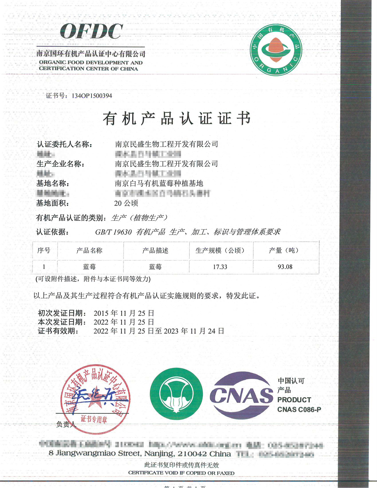 我们蓝莓种植过程,不做任何病虫害的防治,所以不只是不使用化学农药,而是不使用任何药物。全露地栽培,不设放鸟网,不用杀虫灯,不用地膜,园子有自己独特的小生态,是人和动物、植物、微生物和谐共处的美好家园。2014年起获得有机认证证书。