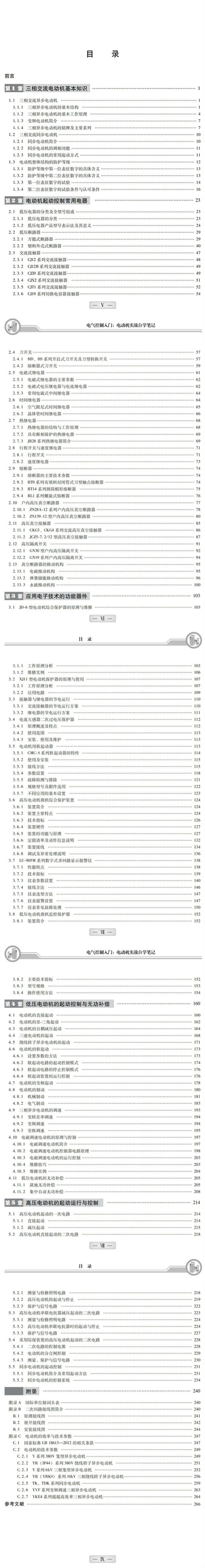 《电气控制入门:电动机实战自学笔记》面向电气控制入门的读者,以学以致用、基础知识和实践经验相结合为宗旨,从介绍三相异步电动机和同步电动机的结构、原理和特点出发,系统地介绍了高压(6kV、10kV)和低压(380V、660V、1140V)三相异步电动机的起动控制与调速原理,同时也对高压同步电动机的励磁装置、起动控制电路进行了较为详尽的描述。书中用了较大的篇幅,介绍了电动机用软起动器以及采用数字电路、单片机等电子技术研发生产的新型控制用器件、部件。这些新型器件、部件近年来已经大量应用于电动机的起动、控制、测量、保护装置中,为提高电动机的控制与保护水平,以及电动机的节能运行发挥了巨大作用。技术和产品的发展日新月异,而相关的技术信息却分别存在于各自产品的说明书或专著中,本书将电动机的控制电路原理以及采用新型控制器件、部件的应用资料汇集整理成一册,方便相关技术人员查阅与参考。
