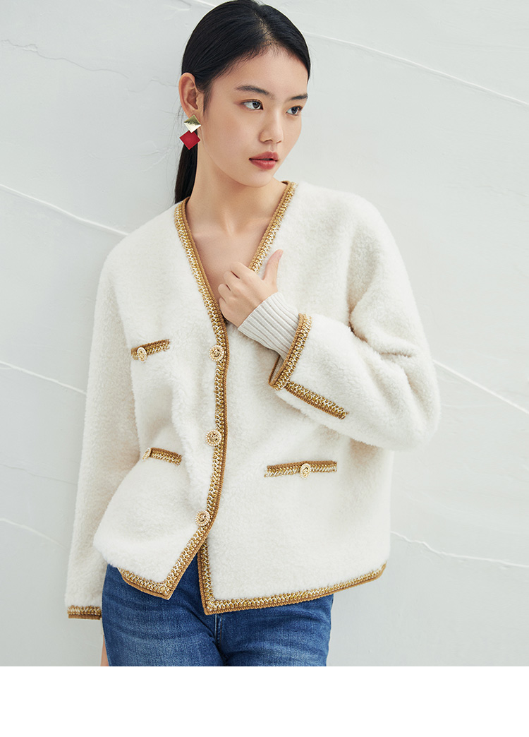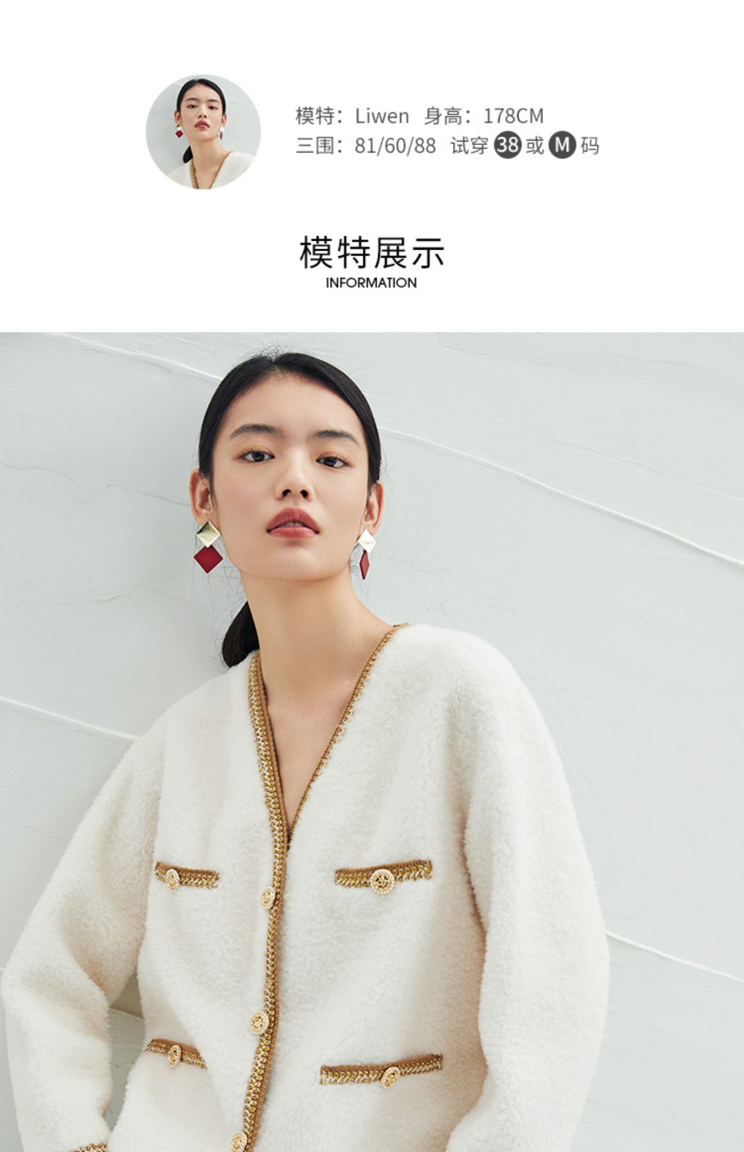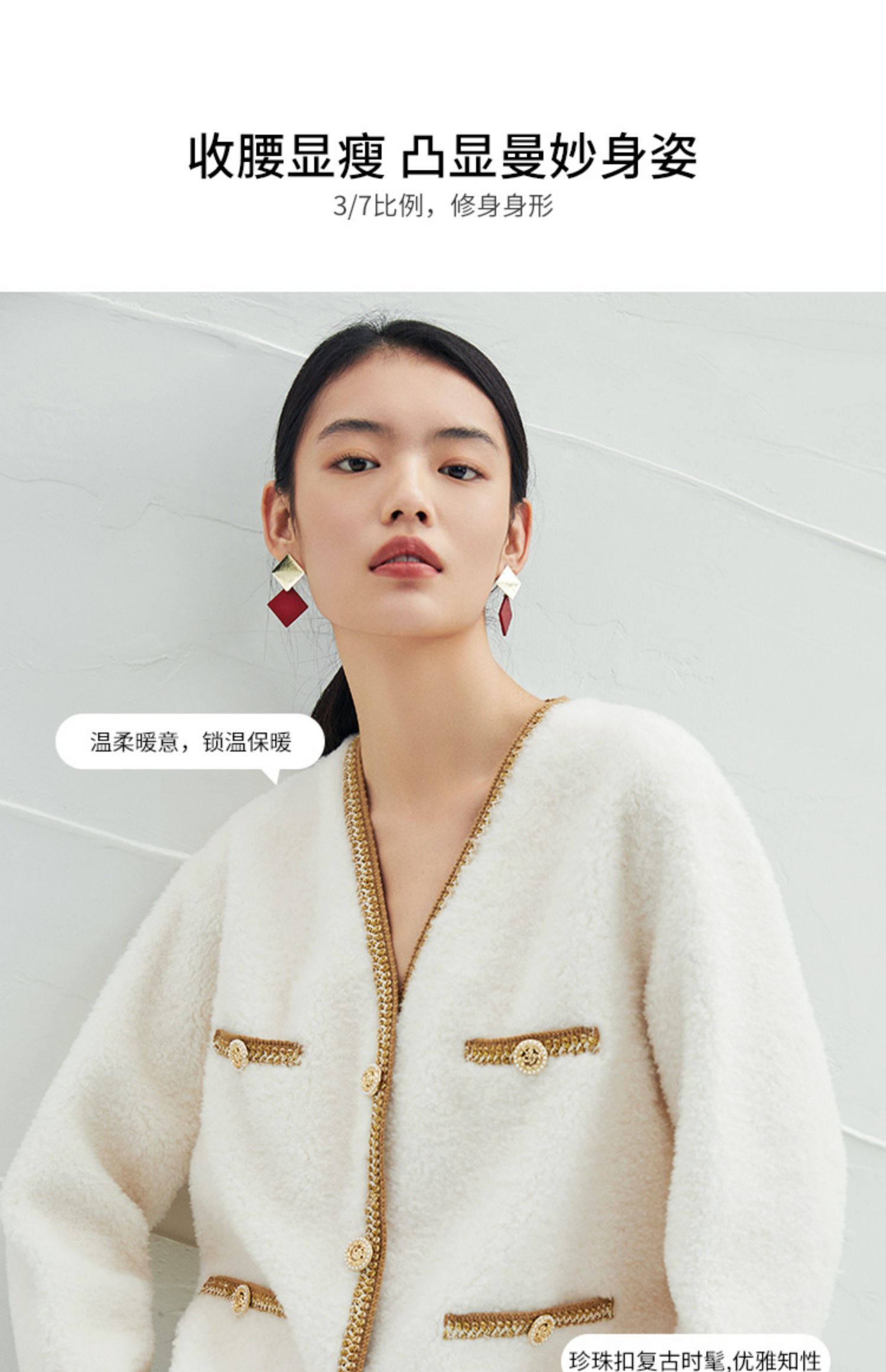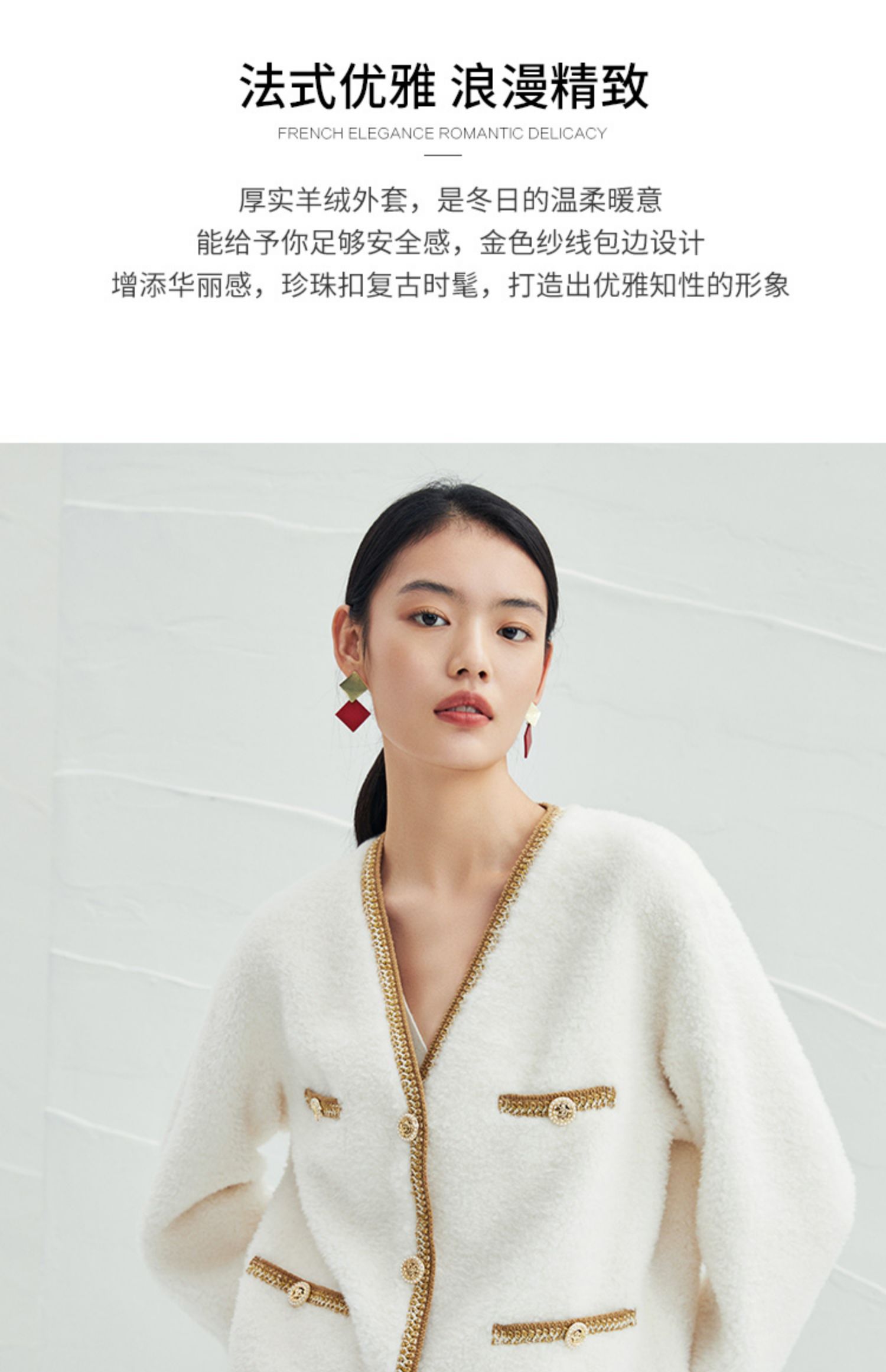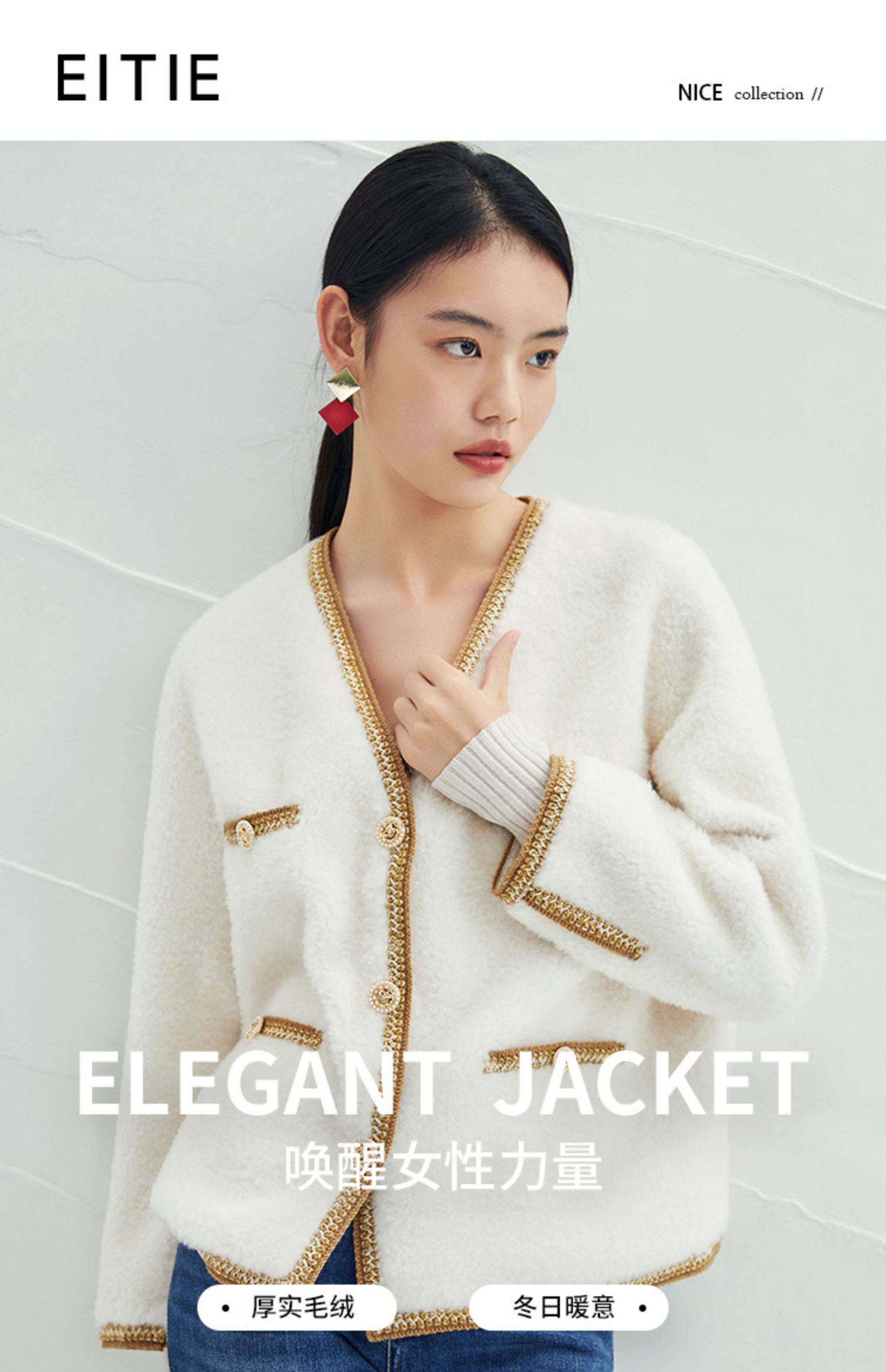 EITIE爱特爱冬季新款羊羔毛通勤简约温柔气质V领撞色直筒显瘦短外套D2103833