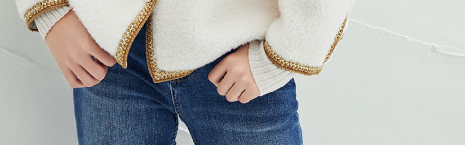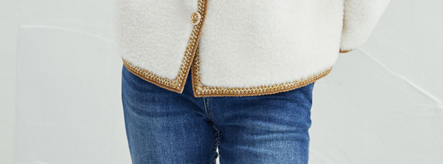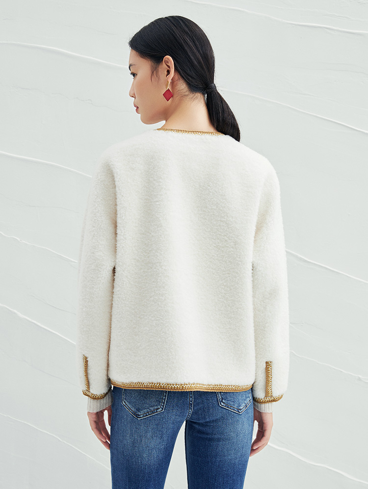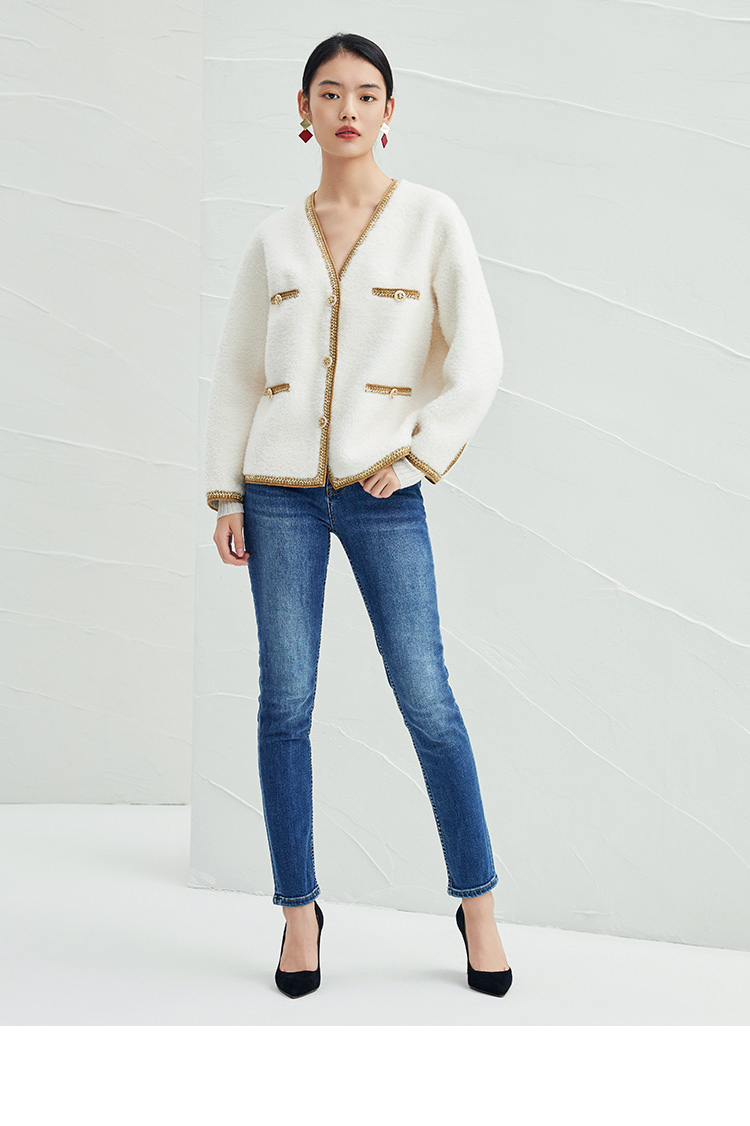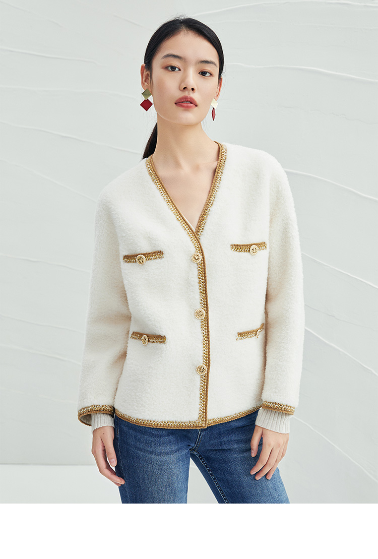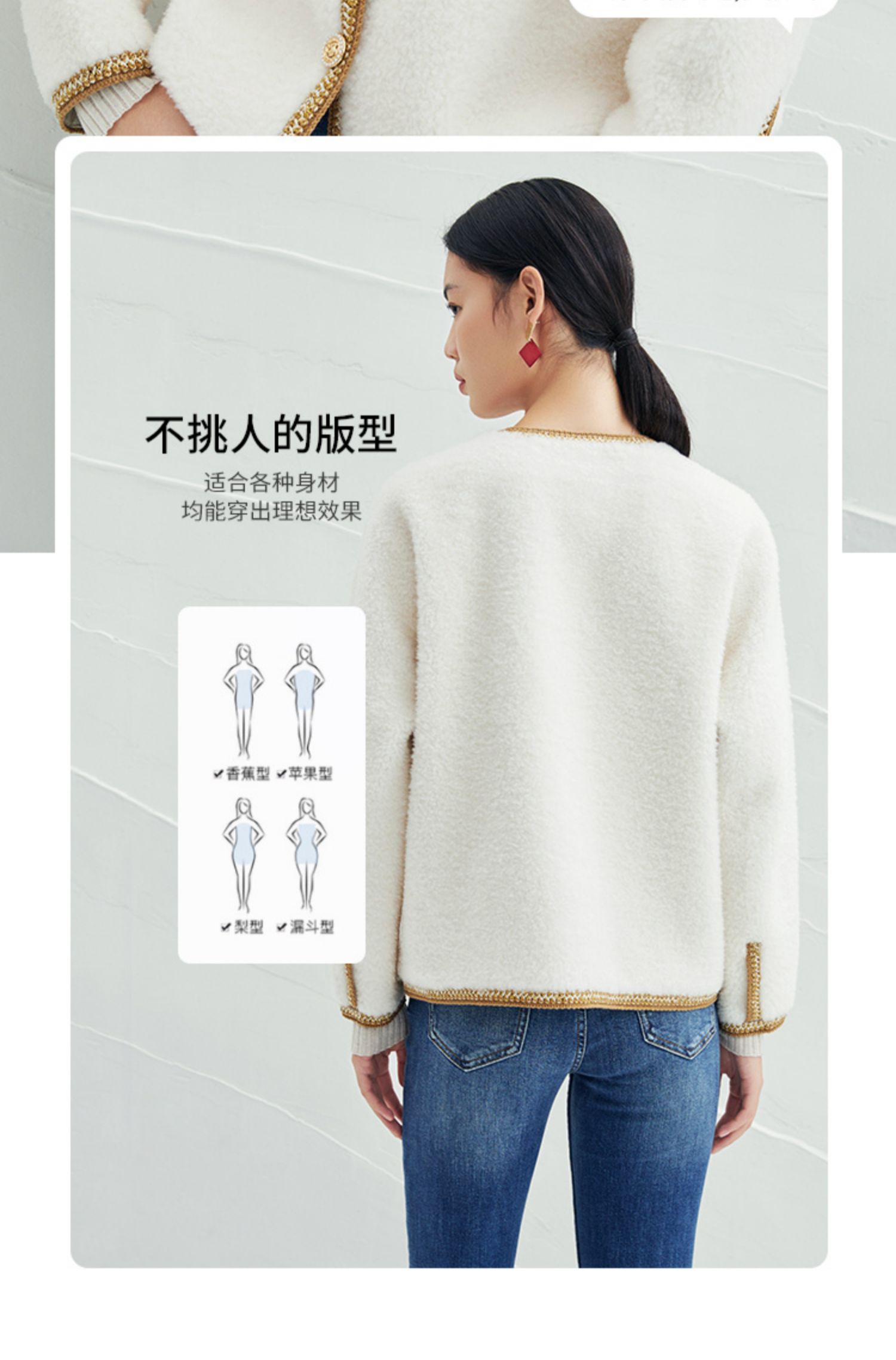 EITIE爱特爱冬季新款羊羔毛通勤简约温柔气质V领撞色直筒显瘦短外套D2103833