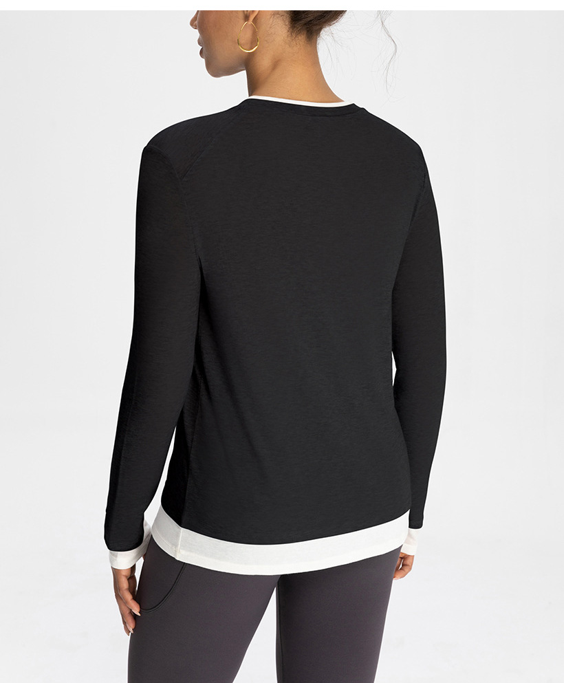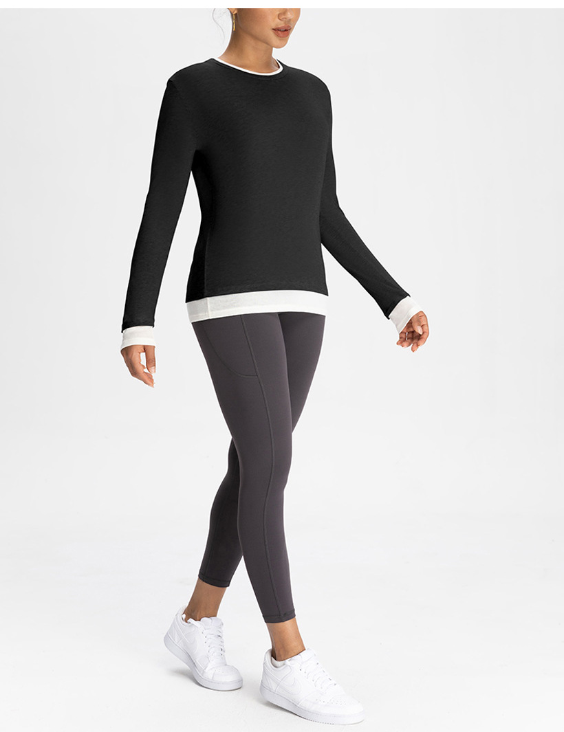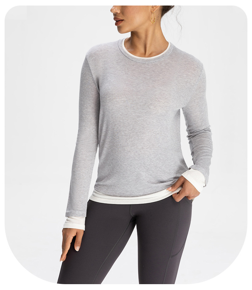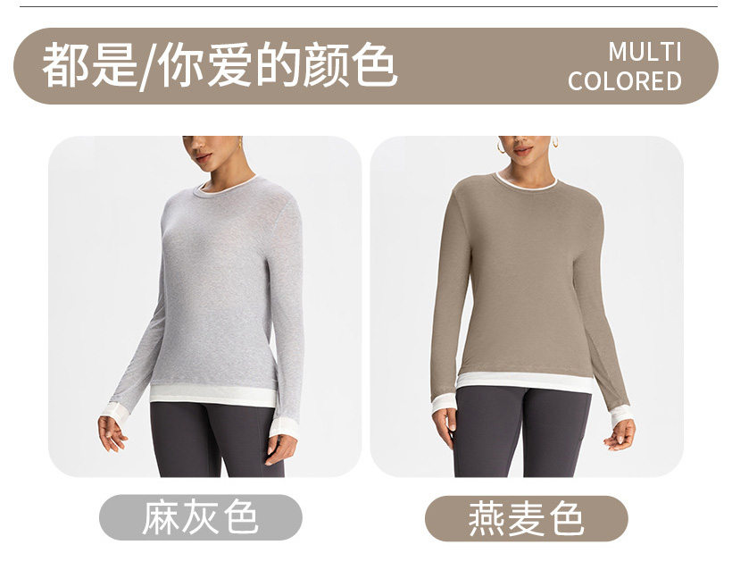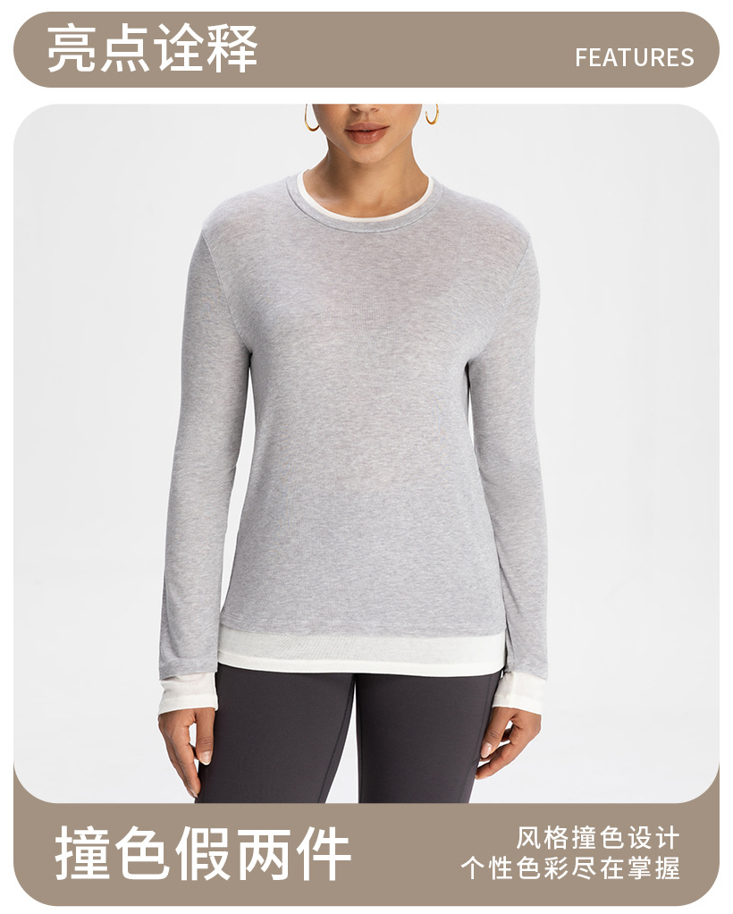 跃牌【倚窗听雨】美丽诺羊毛瑜伽服女假两件拼接撞色长袖T恤运动宽松打底衫上衣