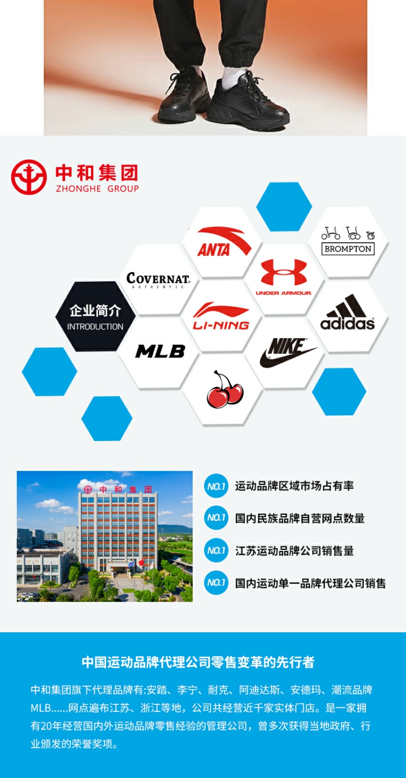 中和集团旗下代理安踏、李宁、耐克、安德玛、耐克、中国李宁、MIB等运动时尚品牌,网点遍布江苏、浙江、湖北等身份