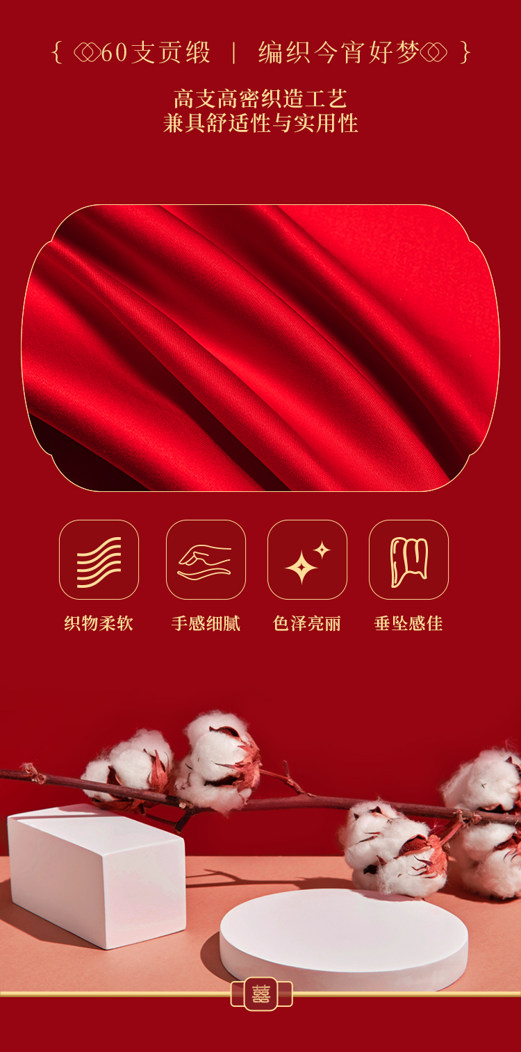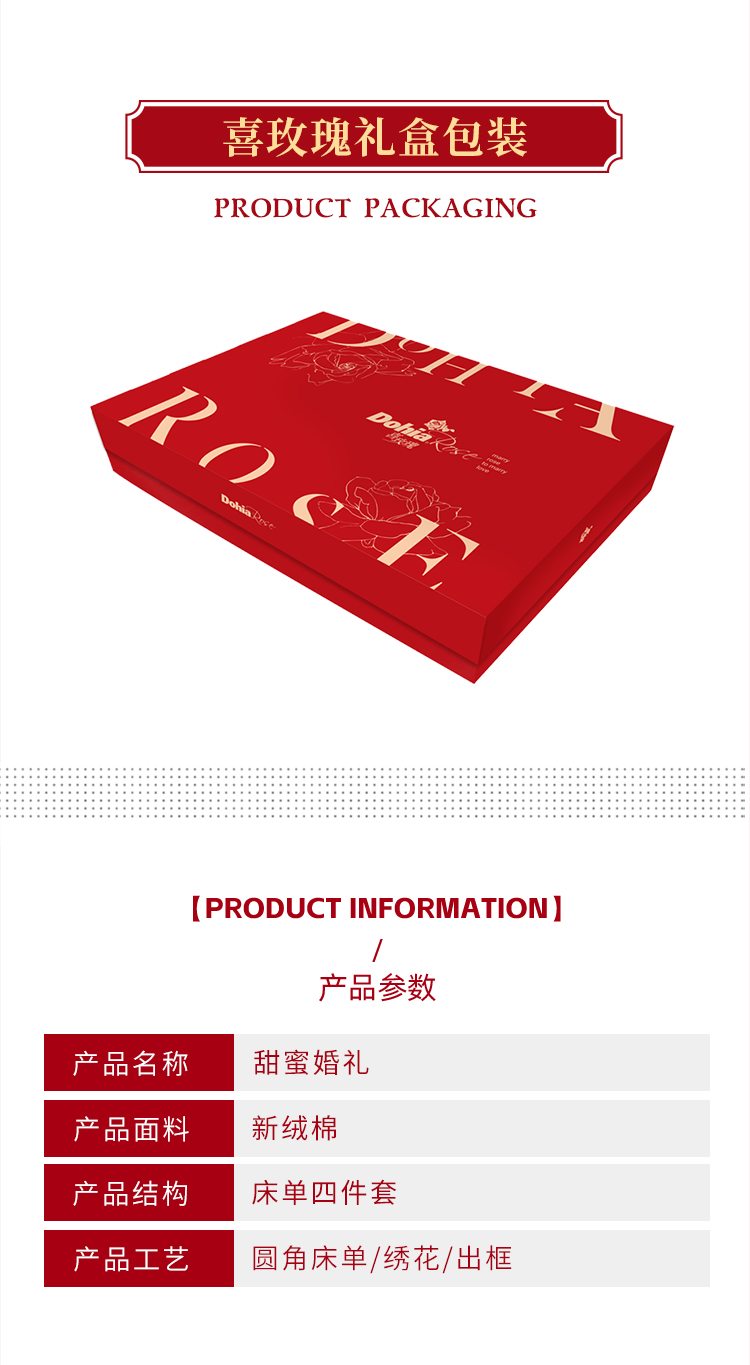 多喜爱 喜玫瑰60S全棉贡缎四件套 甜蜜婚礼【精美刺绣】【爱心桃点缀】【高密贡缎】【礼盒包装】【宽边工艺】重工刺绣