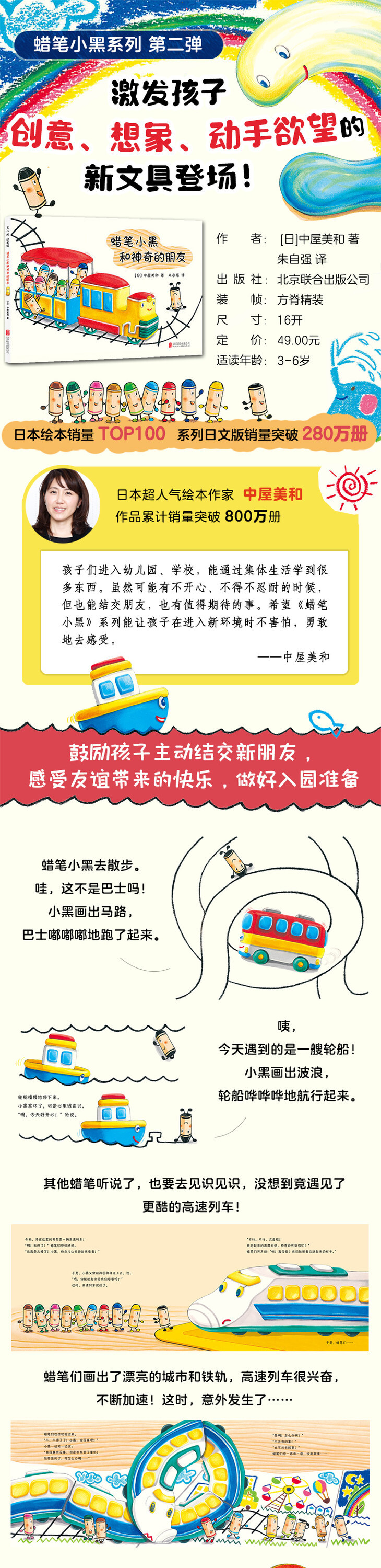 小黑之所以能比第·一本书更发挥领导能力,是因为获得了自信。平时,蜡笔们只是自己生活,但是像这本绘本中,突然从外界闯进来个神奇的朋友,大家会有什么反应呢?这样想着就写成了故事。比如某天突然来了个转校生,有的孩子马上就能和他成为朋友,有的孩子在远处观望,孩子们的反应是不同的。和不同的朋友在一起,玩的花样种类会扩大,认识朋友新的一面,结果大家会变得很要好。我想在这部作品中描绘这样的孩子之间的人际关系。——中屋美和谈创作缘起