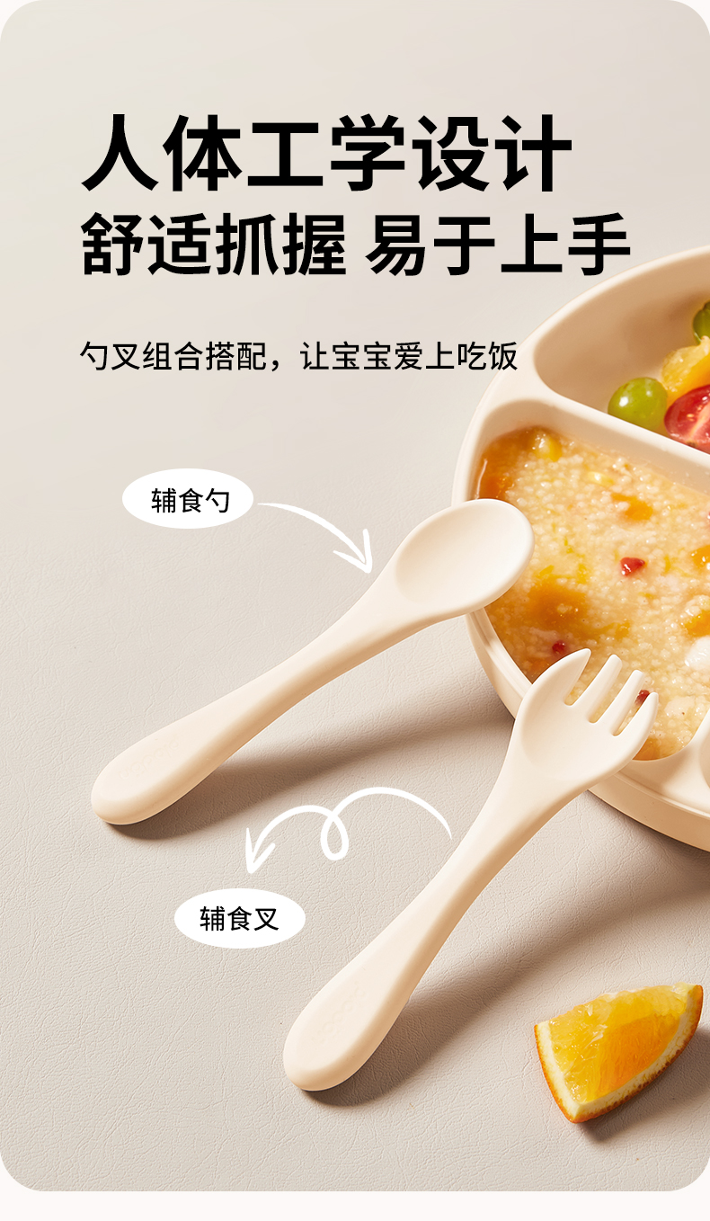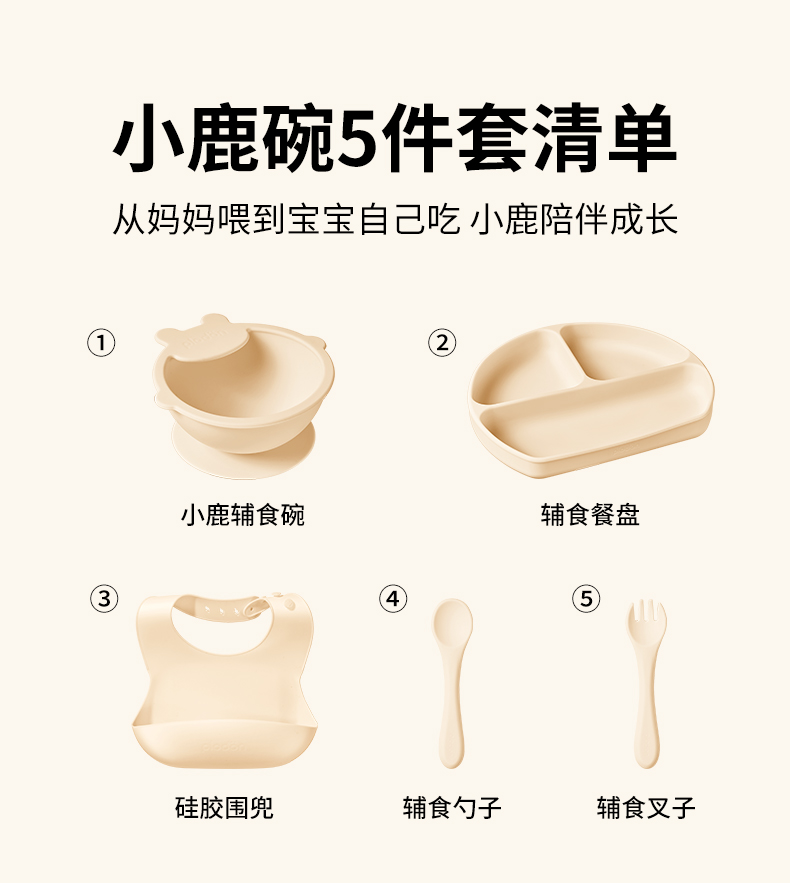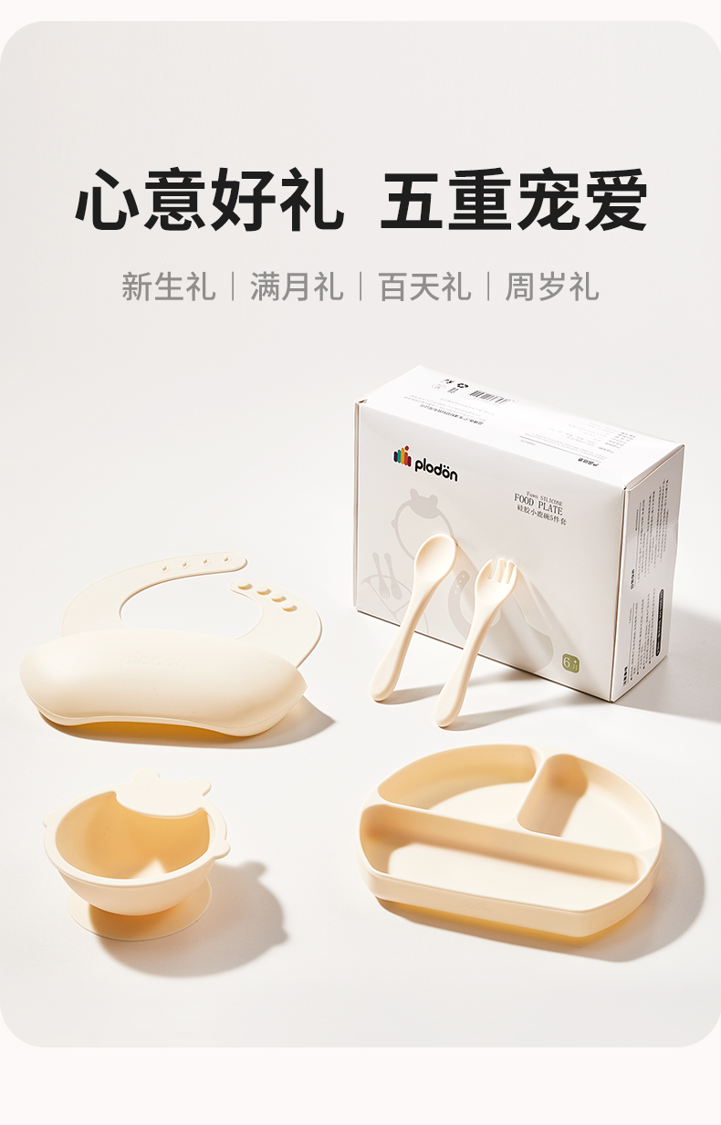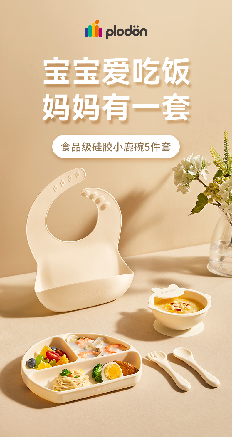 plodon浦利顿宝宝五件套辅食碗分格辅食餐盘吃饭围兜硅胶叉勺餐具套装