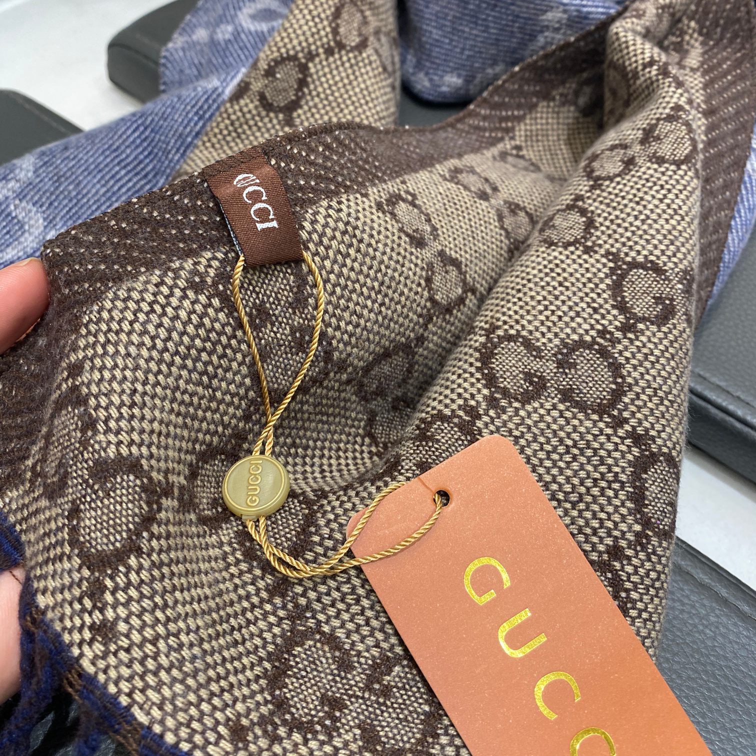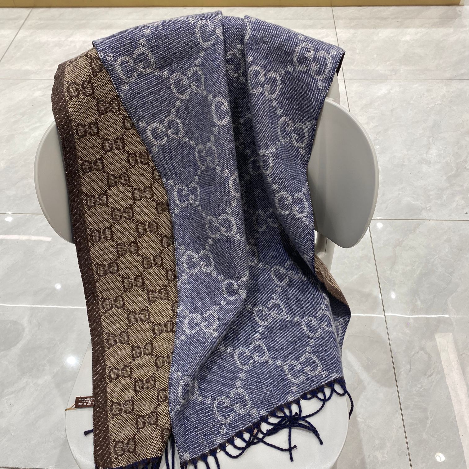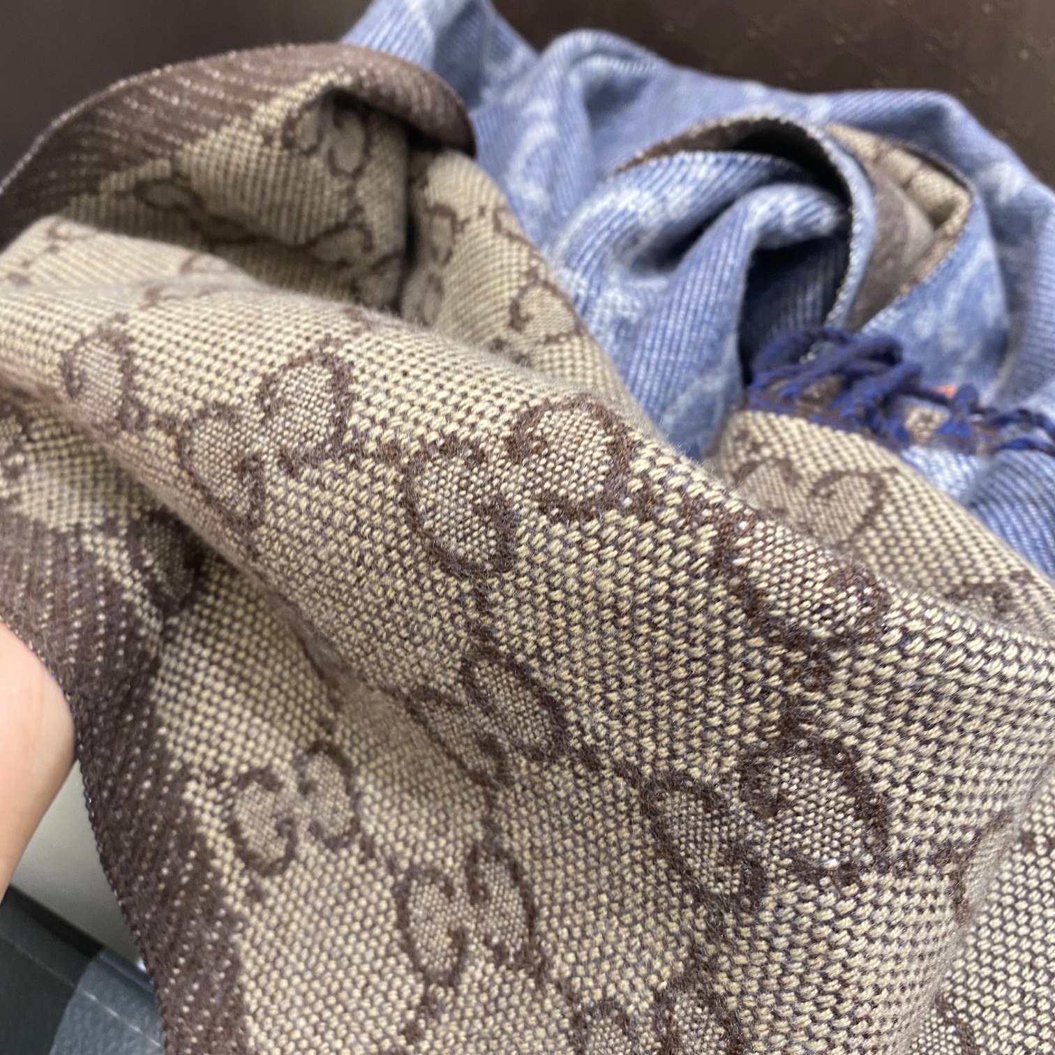 GUCCI古驰情侣款GG提花流苏针织围巾披肩(代购级别区别版本 可随意比对)专柜同步在售。这款柔软的提花羊毛围巾正反两面都饰GG图案灵动而又不失俏皮。双G字母交织图案源自20世纪70年代,由品牌创始人Guccio Gucci的姓名首字母演化而来。围巾采用蓝色与浅棕色对比色调,典雅的海军蓝色流苏令整款设计倍添魅力,羊绒材质手感软糯贴肤不扎无论何种风格都可随意百搭