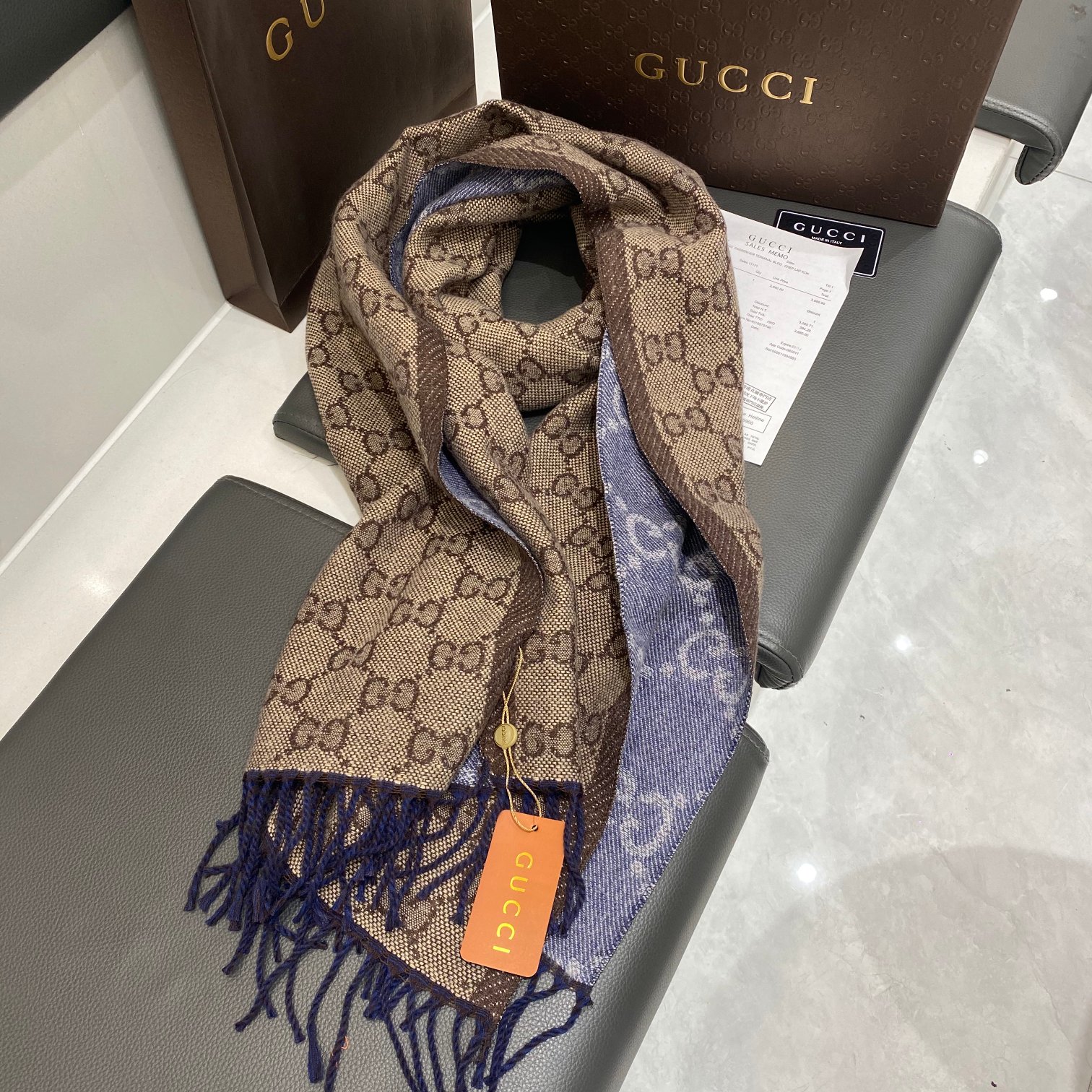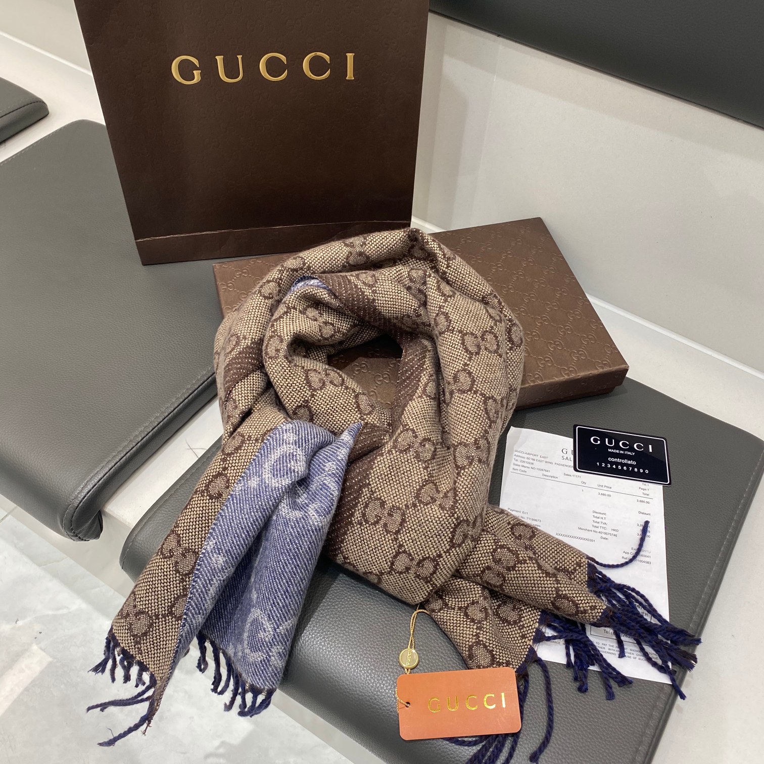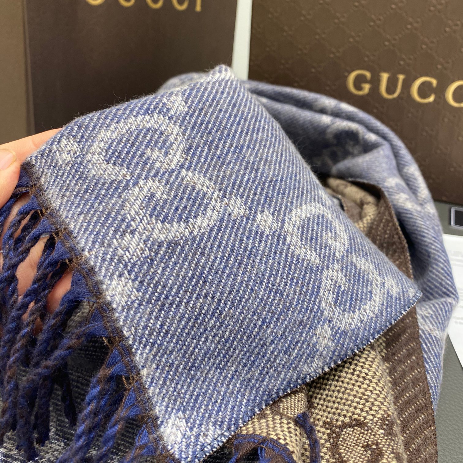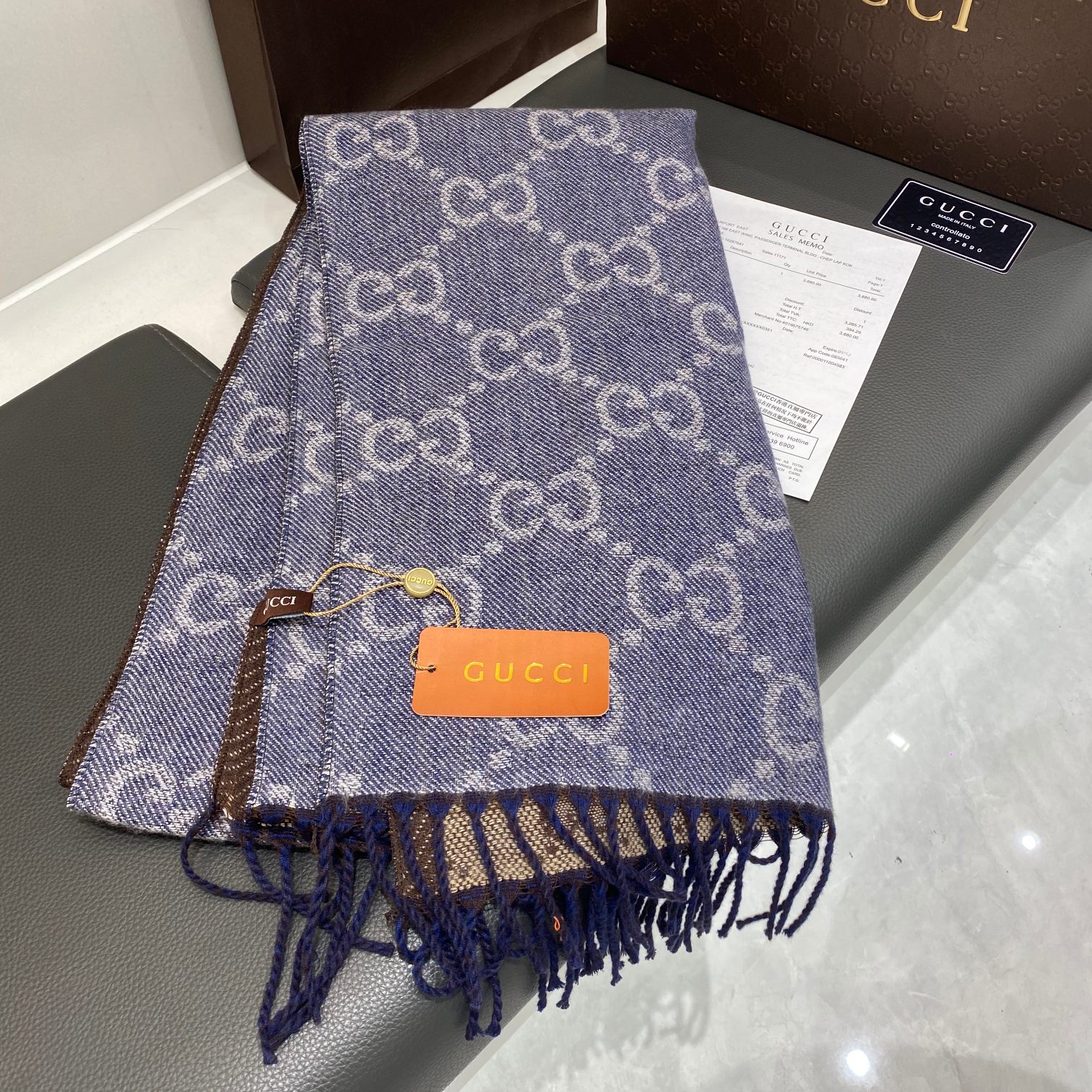 GUCCI古驰情侣款GG提花流苏针织围巾披肩(代购级别区别版本 可随意比对)专柜同步在售。这款柔软的提花羊毛围巾正反两面都饰GG图案灵动而又不失俏皮。双G字母交织图案源自20世纪70年代,由品牌创始人Guccio Gucci的姓名首字母演化而来。围巾采用蓝色与浅棕色对比色调,典雅的海军蓝色流苏令整款设计倍添魅力,羊绒材质手感软糯贴肤不扎无论何种风格都可随意百搭