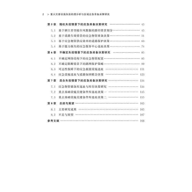灾前应急准备决策面临着两类困难:一是相关设施(包括应急设施和基础设施等)因灾失效对灾后应急响应工作造成了重大障碍;二是在应急准备中必须充分考虑灾害本身的不确定性。为解决这两类困难,本书稿主要关注两大灾害:台风与地震。首先将承灾体脆弱性曲线与灾害致灾强度衰减分析相结合研究了重大灾害导致设施失效的关联机理;然后根据设施失效机理分析给出了三类不同设施失效情景生成模型:随机失效情景生成模型、不确定失效情景生成模型以及混合失效情景生成模型;最后分别就三类情景结合不同灾害及应急准备问题研究了十一类问题(包括应急物资准备决策、道路保护决策、应急服务中心选址、关键备件库选址等)。