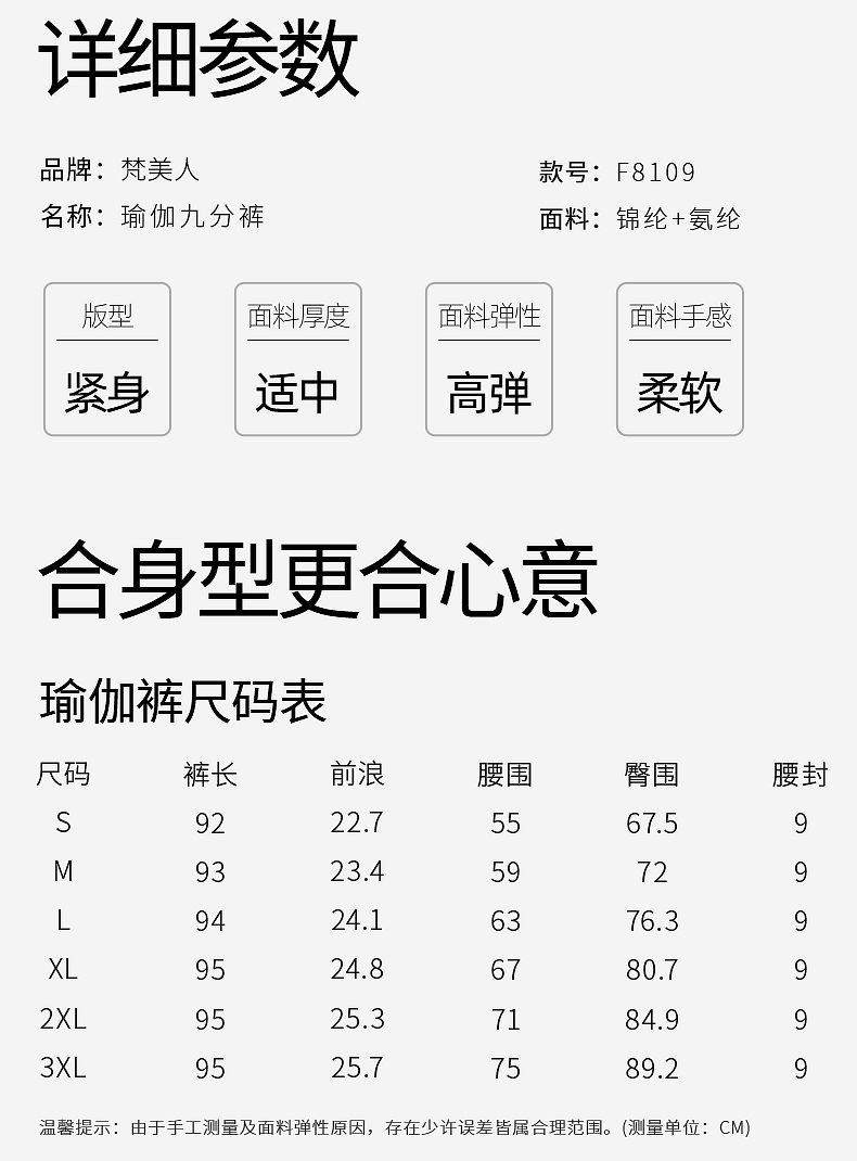 梵美人 F8071 瑜伽九分裤 轻薄防晒裸感 莱卡氨纶 无松紧 无尴尬线