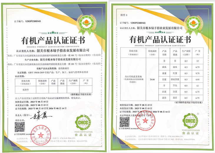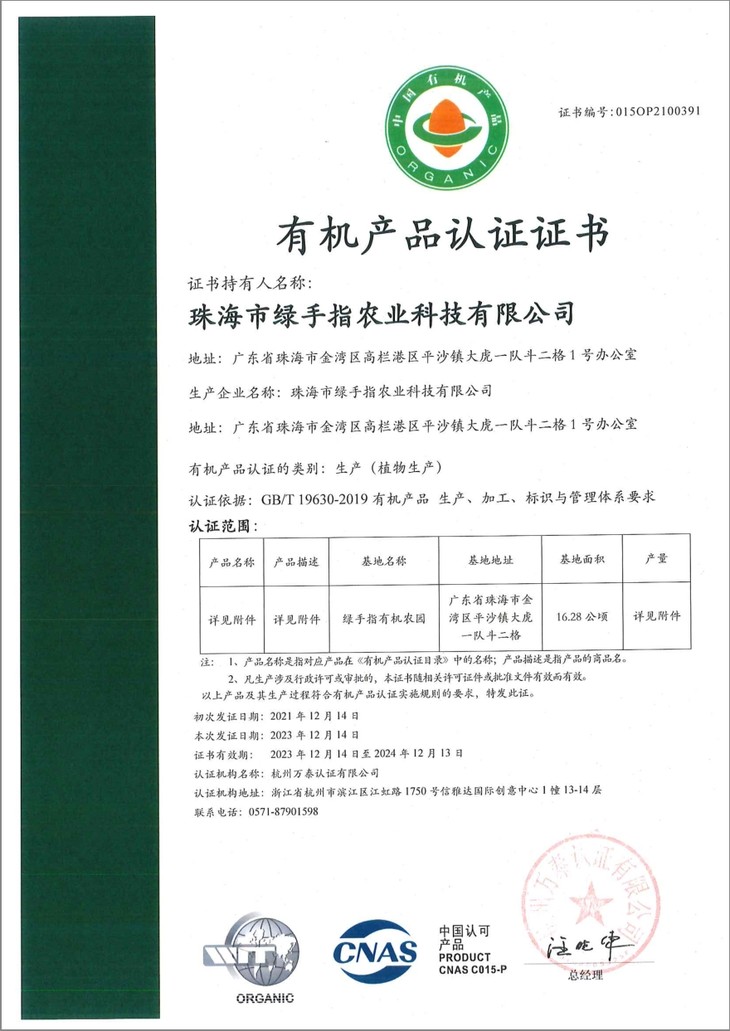 珠海、广州、韶关基地每年都会进行有机认证,先后取得过欧盟、北美和我国国标的有机认证,衢州基地今年也将申请转化期的认证。国标的有机认证会对整个基地进行考察检测,认证是针对单品的,农场100多种蔬菜认证下来费用甚高,就选择了水果、瓜果、根茎、叶菜里各1-2种作为代表进行认证。