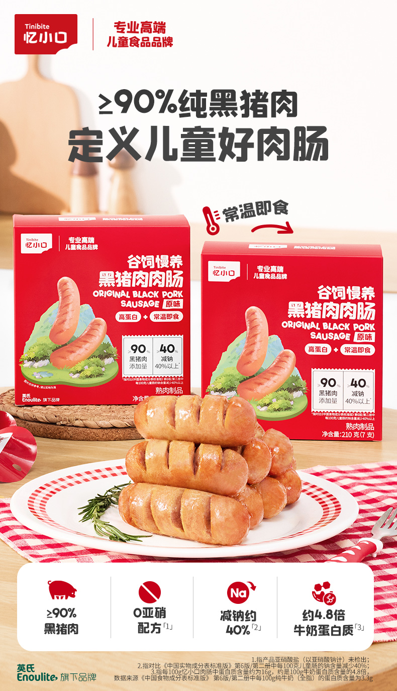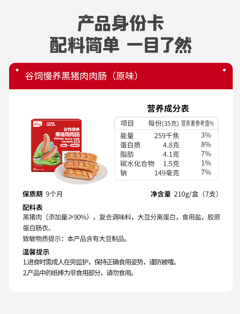 【新品】忆小口儿童谷饲慢养黑猪肉肉肠210G(7支)