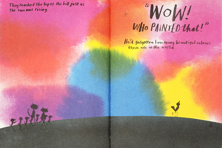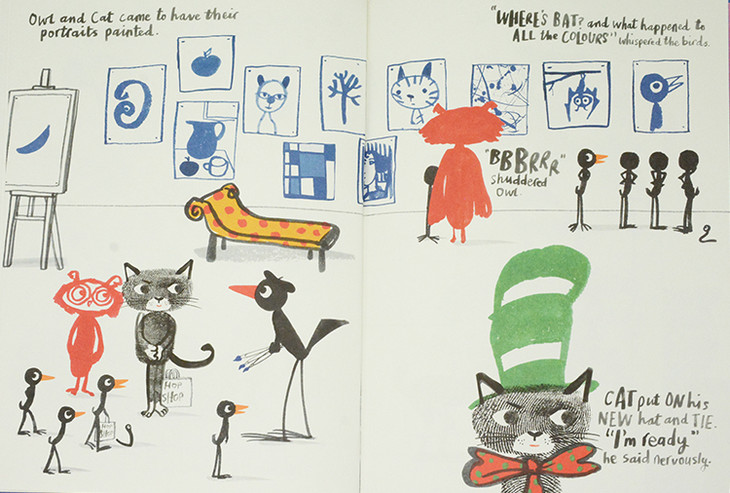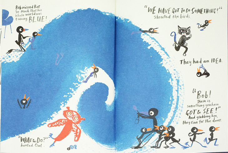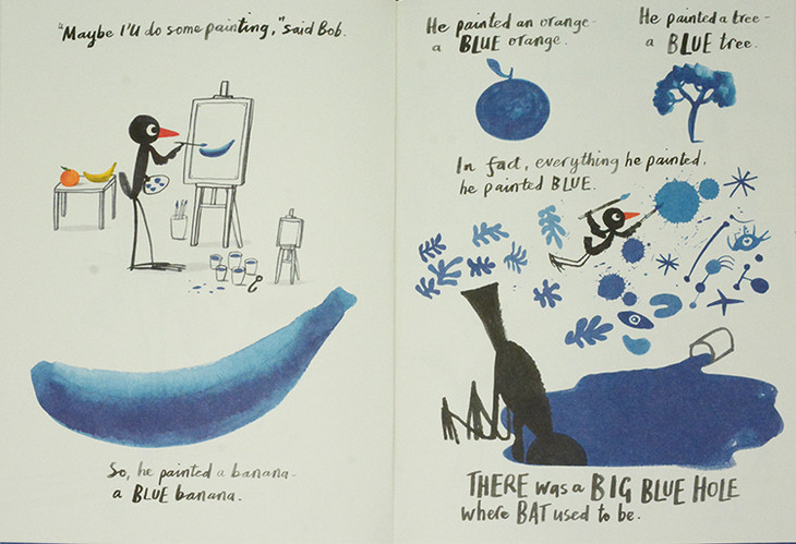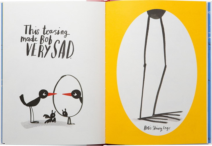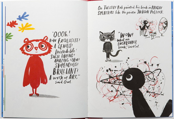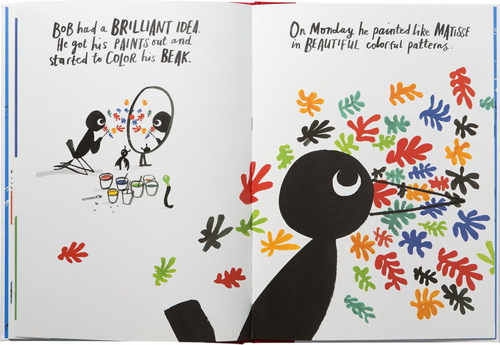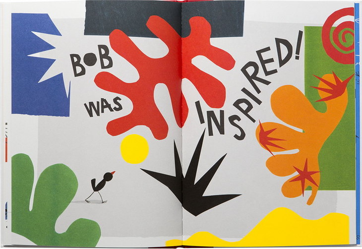 这本书的主角是一只叫Bob的小鸟,它非常瘦弱,面对其他动物的冷嘲热讽,他想尽各种办法,健身、猛吃猛喝,但是都失败了。他决定出去走一走,他走了很长的一段路,来到美术馆后就像被闪电击中般,他的灵感突然被点燃...
