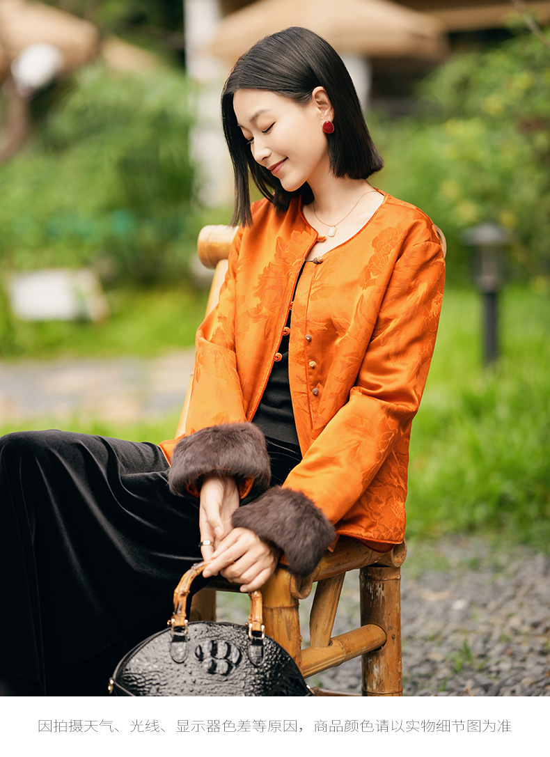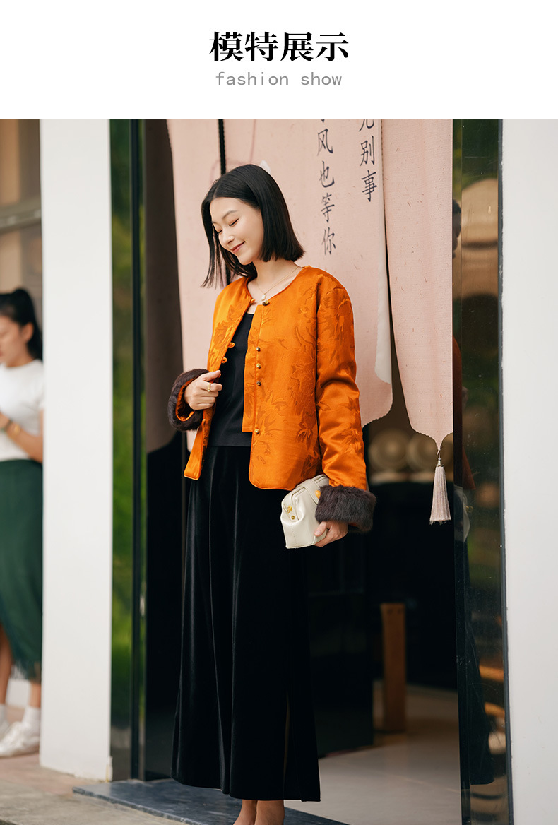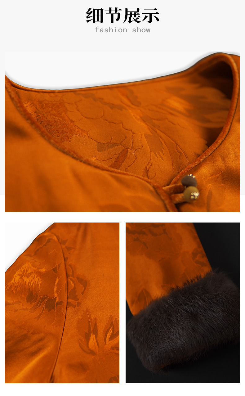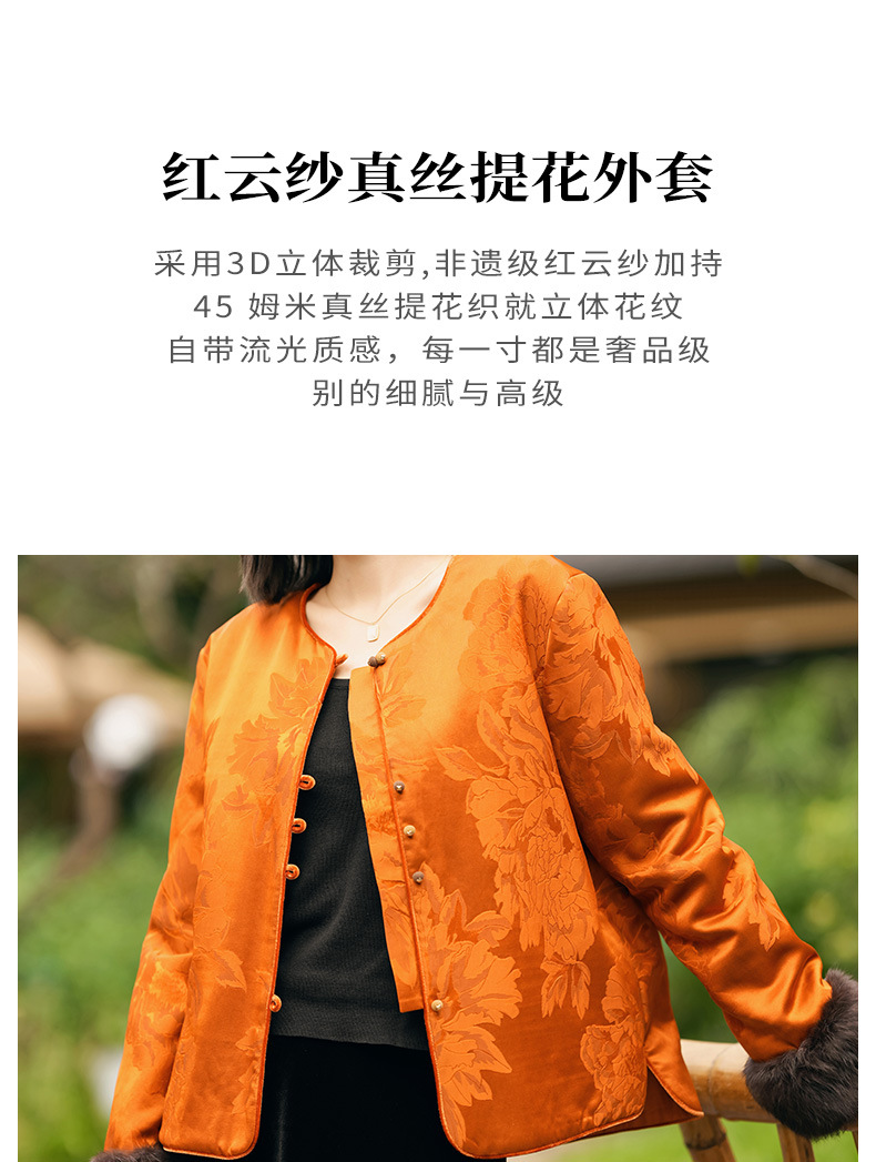 OPH F4660-A红云纱-45姆米桑蚕丝真丝提花棉衣外套拼袖口兔毛 商品图3