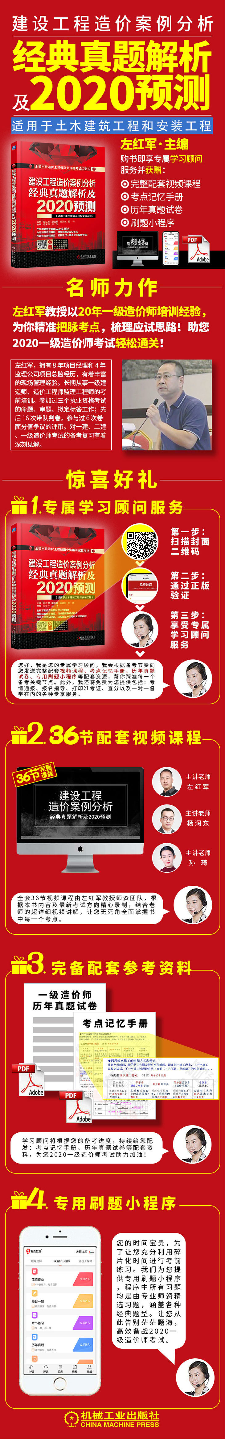 凡使用机械工业出版社出版的正版《建设工程造价案例分析 经典真题解析及2020预测》的考生,扫描封面二维码即可加入左红军老师专业团队授课群,专享一对一的学习顾问服务,并免费获取包括36节视频课程在内的配套资料包。QQ群号:587731121。