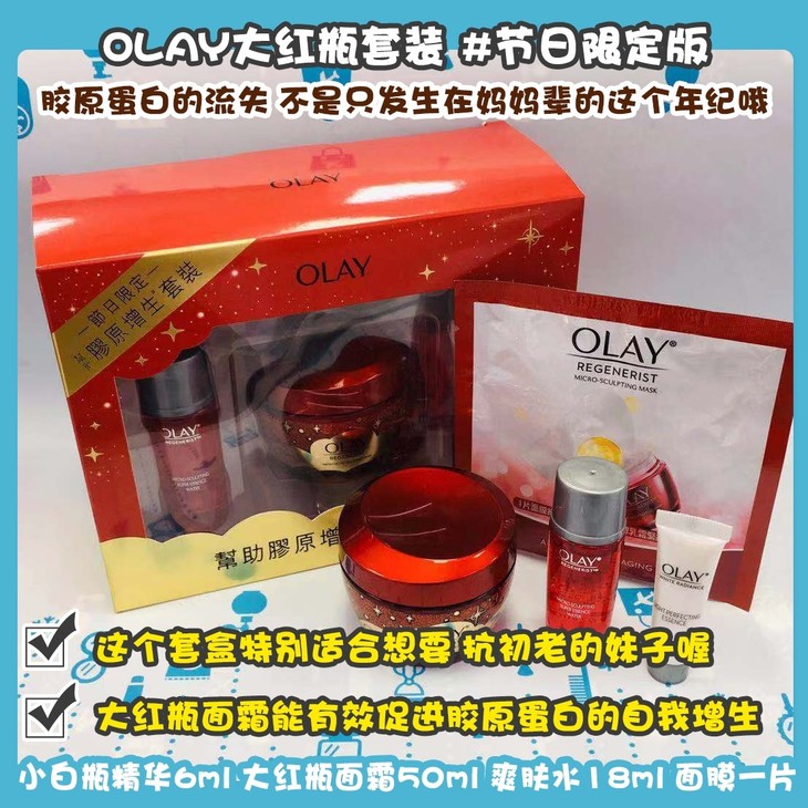 OLAY大红瓶套装 #节日限定版👍胶原蛋白的流失🌬不是只发生在妈妈辈的这个年纪哦🙋,这个套盒特别适合想要👊抗初老的妹子喔!大红瓶面霜能有效促进胶原蛋白的自我增生〽,延缓皮肤衰老,hold住你的苹果肌哈哈🍎~搭配小白瓶精华爽肤水面膜,深入渗透肌肤💧,减少肌肤外观皱纹细纹,令肌肤紧致有弹性☺,细滑光亮肌肤就是你的啦🌟!套装包括:小白瓶精华6ml➕大红瓶面霜50ml➕爽肤水18ml➕面膜一片。