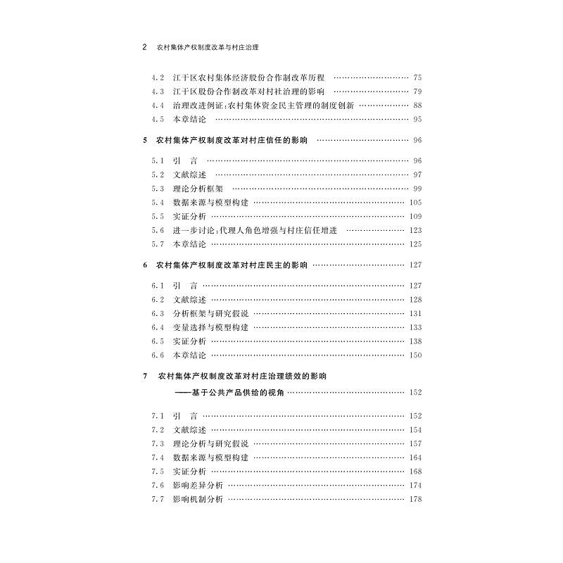 农村集体经济股份合作制改革作为农村产权制度的一次重要变迁,不仅有利于发展新型农村集体经济和保障农民财产权益,而且对村庄治理改善具有重要影响。本书跳出传统研究视角的局限性,将经济学、管理学、政治学和社会学等多学科交叉的视角来探讨股份合作制改革对村庄治理的影响。在梳理农村集体产权变革与村庄治理的历史演进的基础上,以杭州市原江干区为案例深入研究股份合作制对村庄治理的整体影响,再是运用18省87个村的调研数据,从作为非契约互动的村庄信任与契约互动的村庄民主两个向度出发,实证探究股份合作制改革分别对村庄信任和村庄民主的影响,而后将信任和民主作为关键传导机制,考察股份合作制改革对村庄治理绩效的影响。