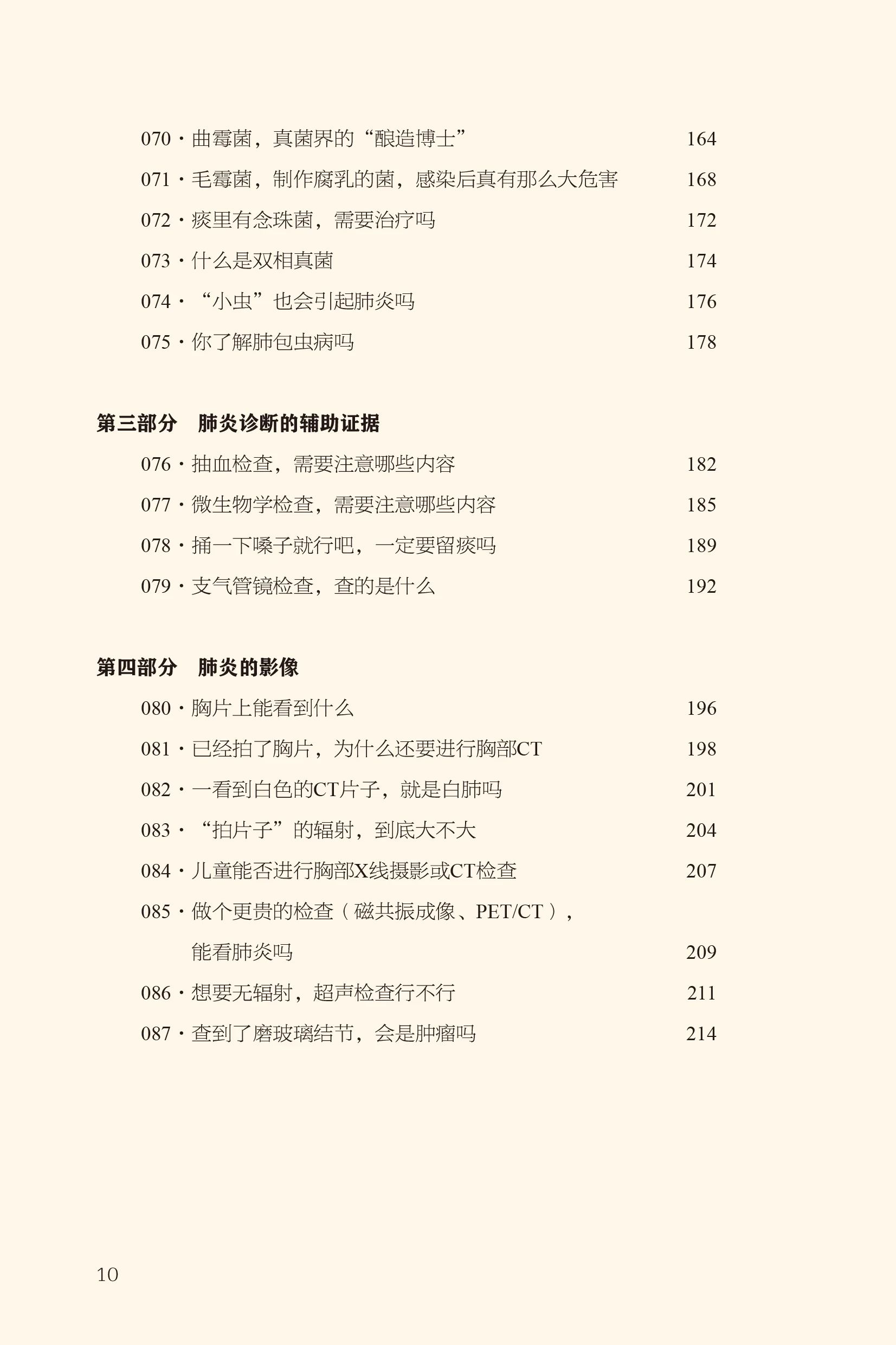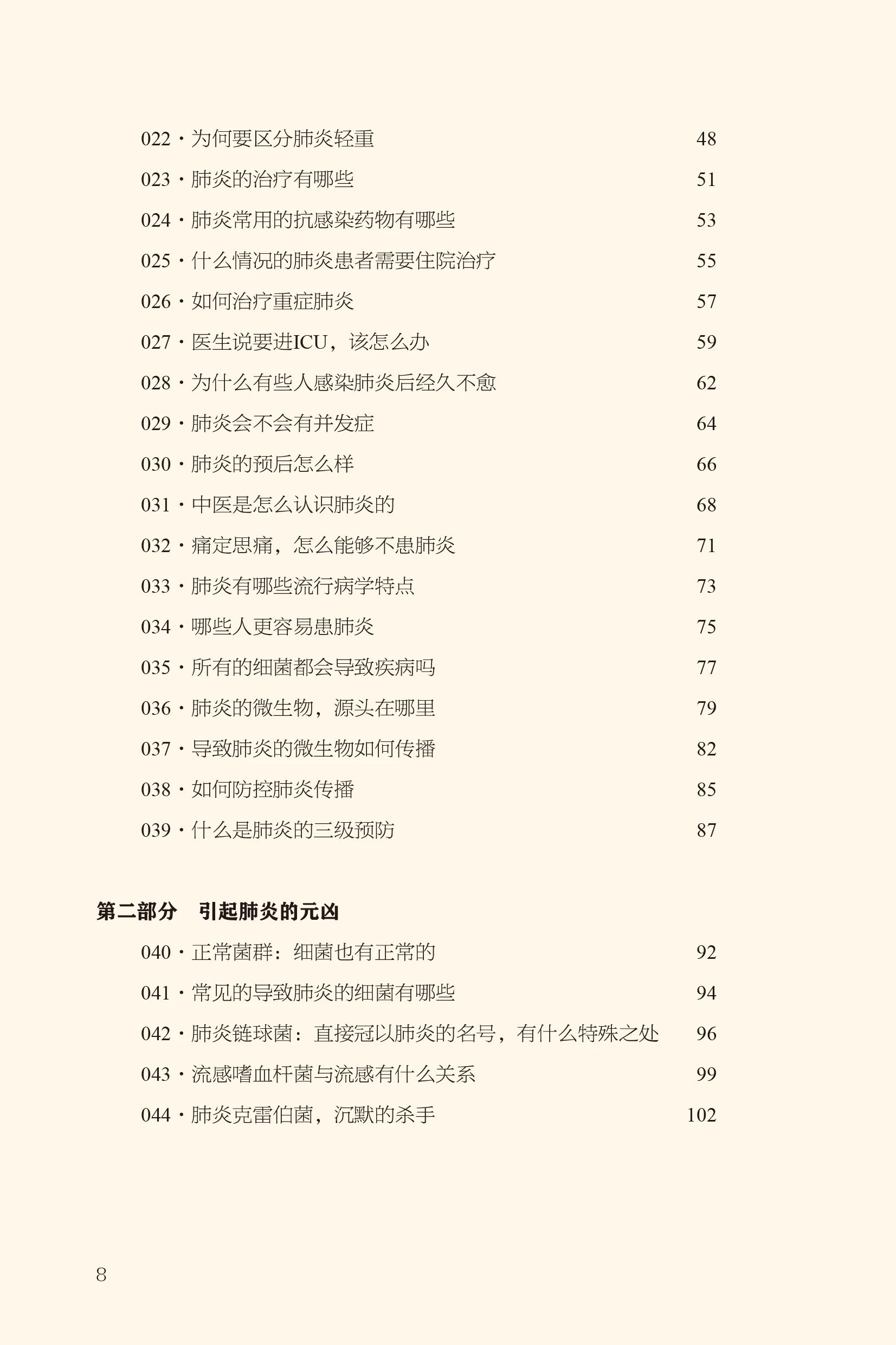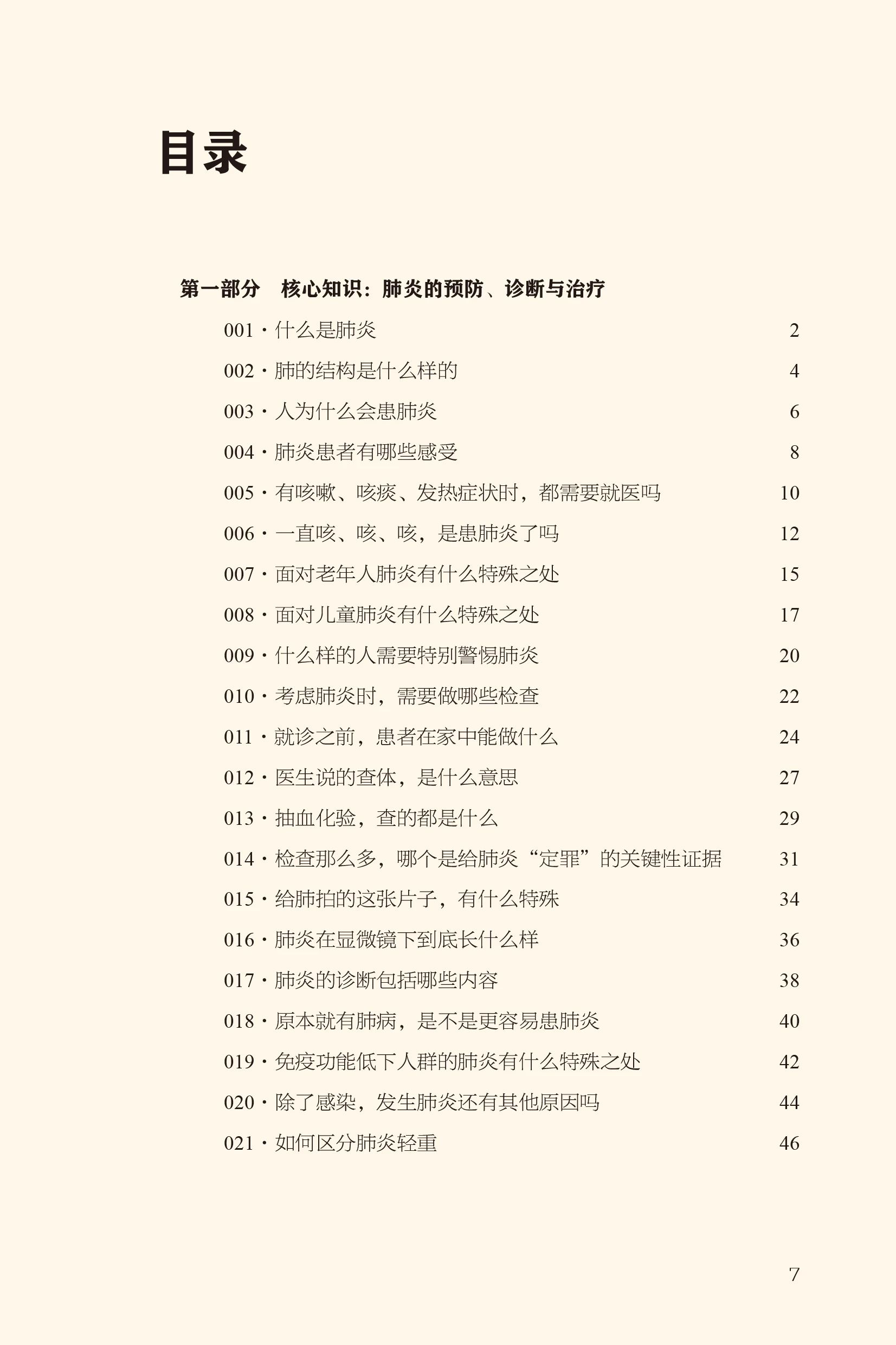 第一部分是全书的主线,涉及的问题从患者角度出发,涵盖肺炎患者的感受、就医、检查、诊断、治疗、康复、预防等核心内容,可以快速浏览。