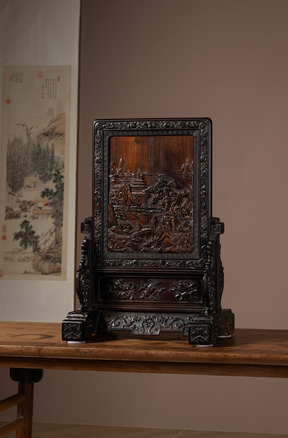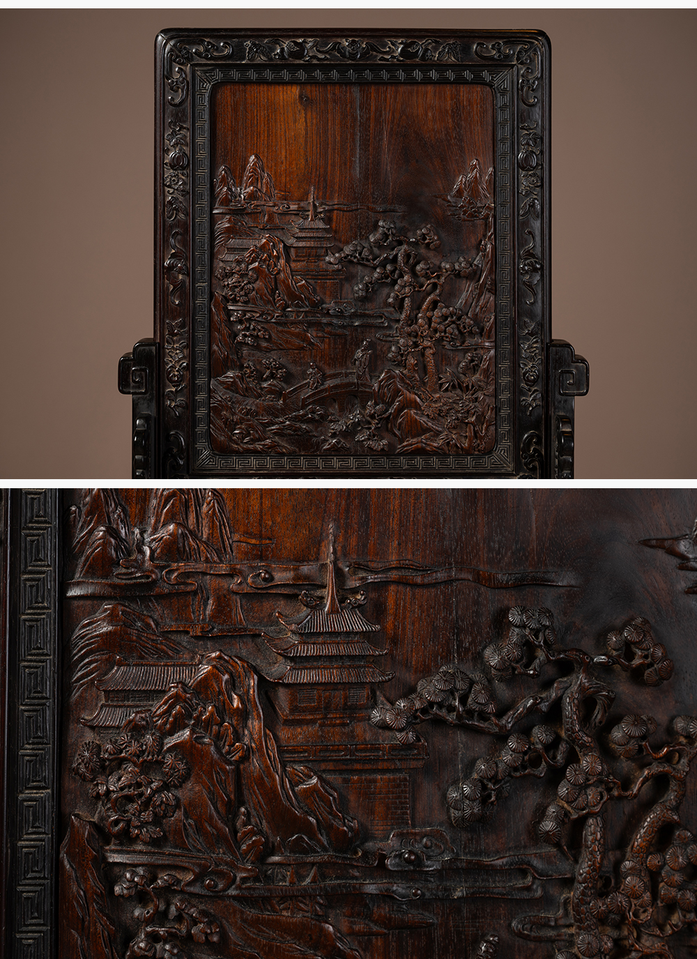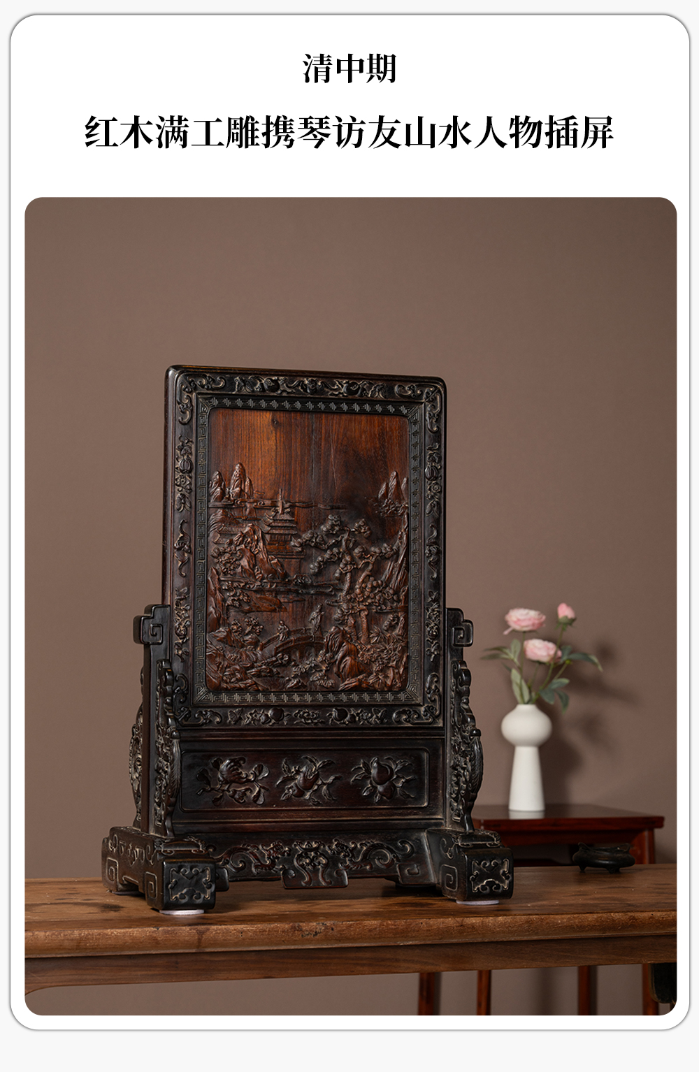 清中期 红木满工雕携琴访友山水人物插屏