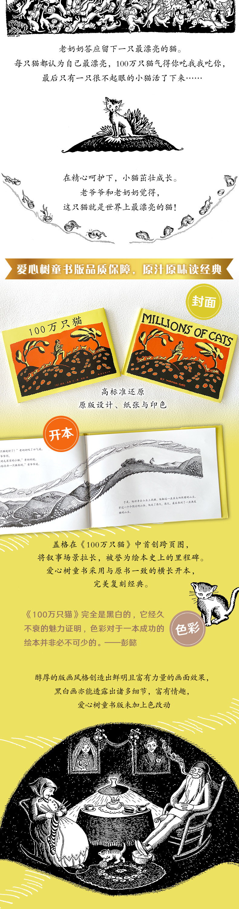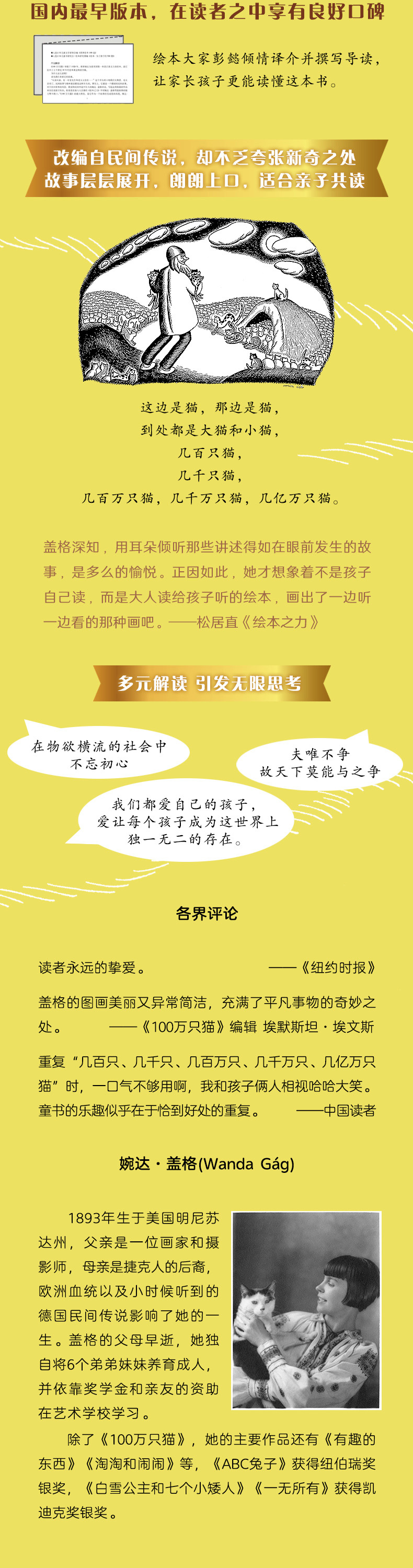 盖格的图画美丽却又异常简洁,充满了平凡事物的奇妙之处。——《100万只猫》编辑埃默斯坦·埃文斯