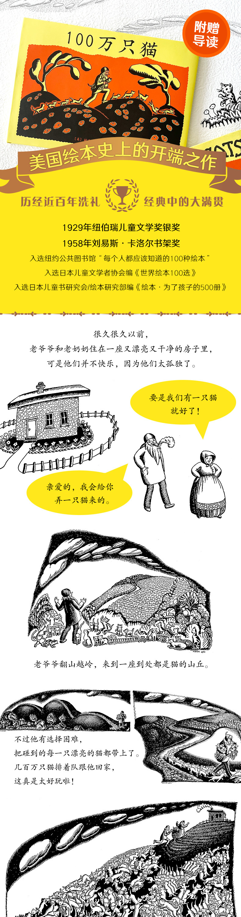 许多人认为这本书开创了现代绘本的时代。作为纽伯瑞儿童文学奖得主,《100万只猫》的特点在于创新的设计,和作为一个好故事那抑扬顿挫的节奏。——美国《学校图书馆》杂志