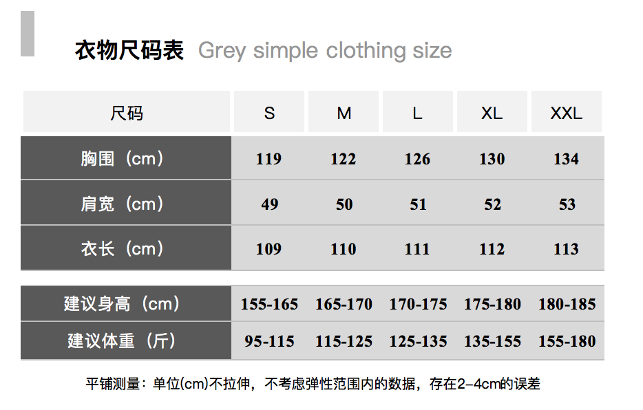 尺码:S、M、L、XL、XXL(具体详见尺码表)