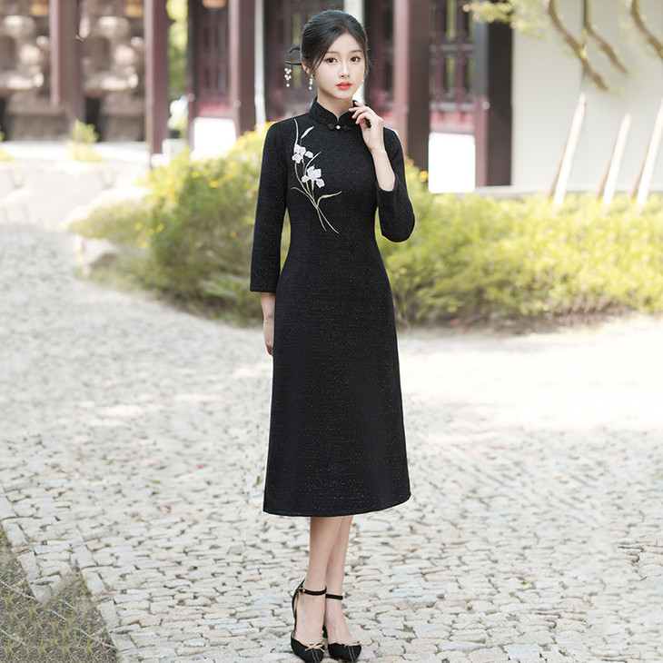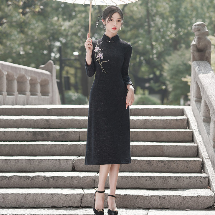 刺绣紫色妈妈装加绒加厚冬装改良旗袍	 SC18043 商品图1