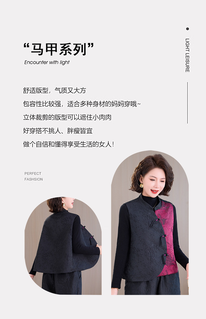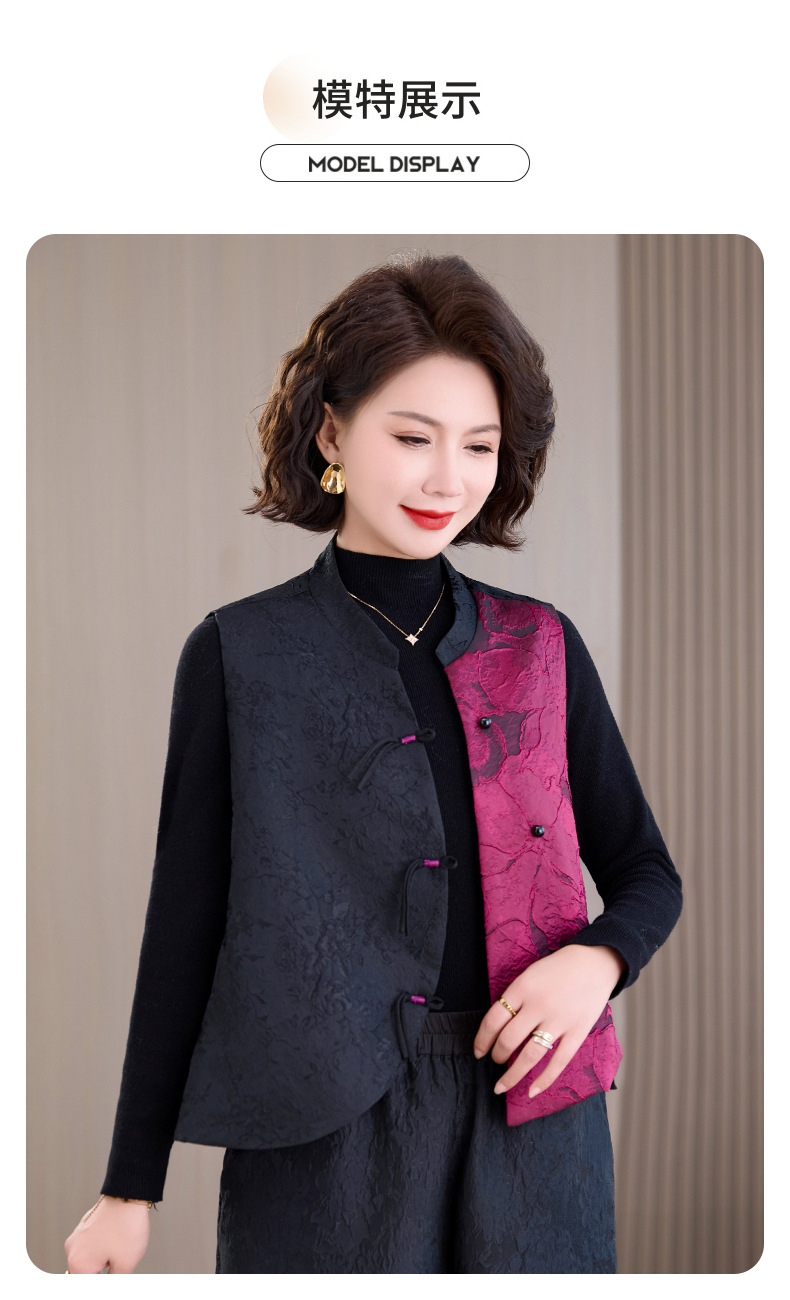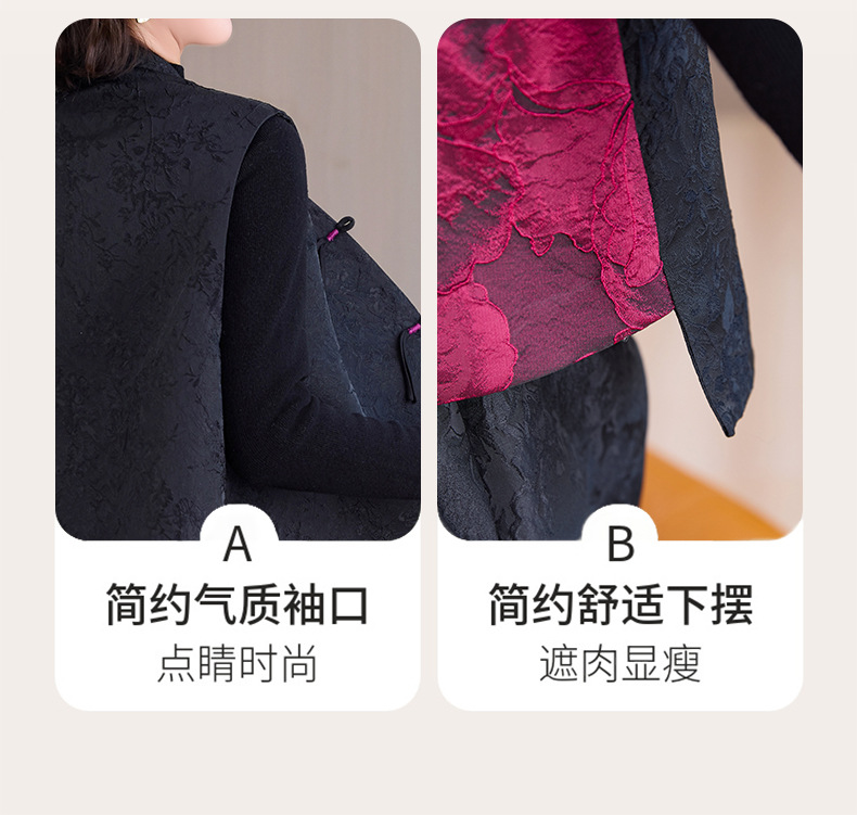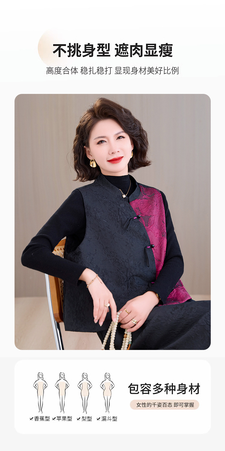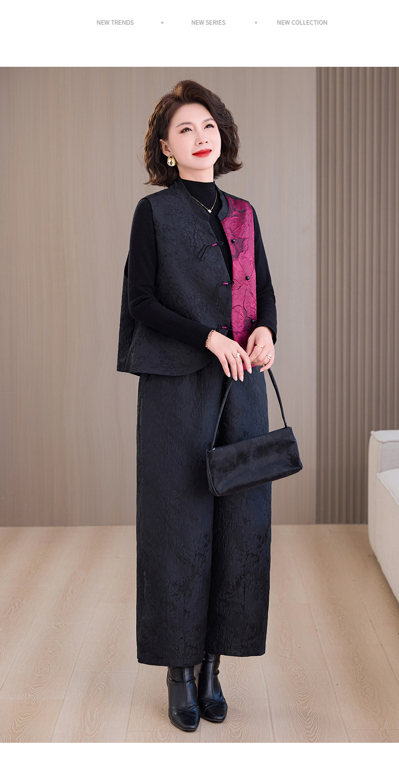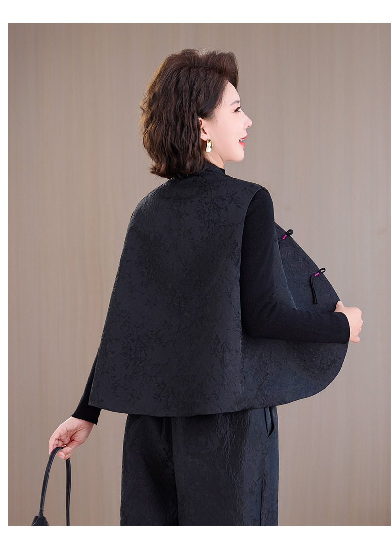 中年妈妈复古提花秋冬新款马甲背心女士立领改良斜襟盘扣上衣套装
