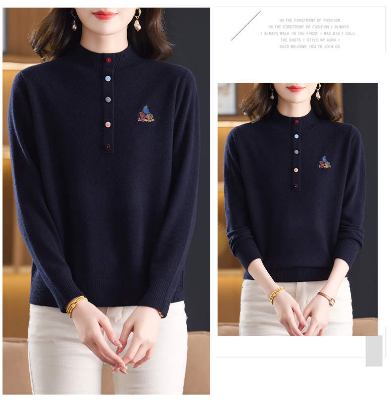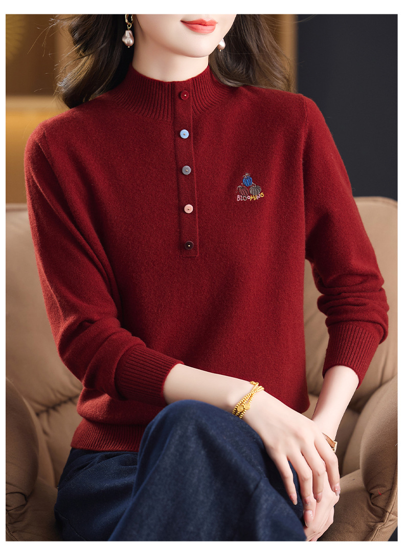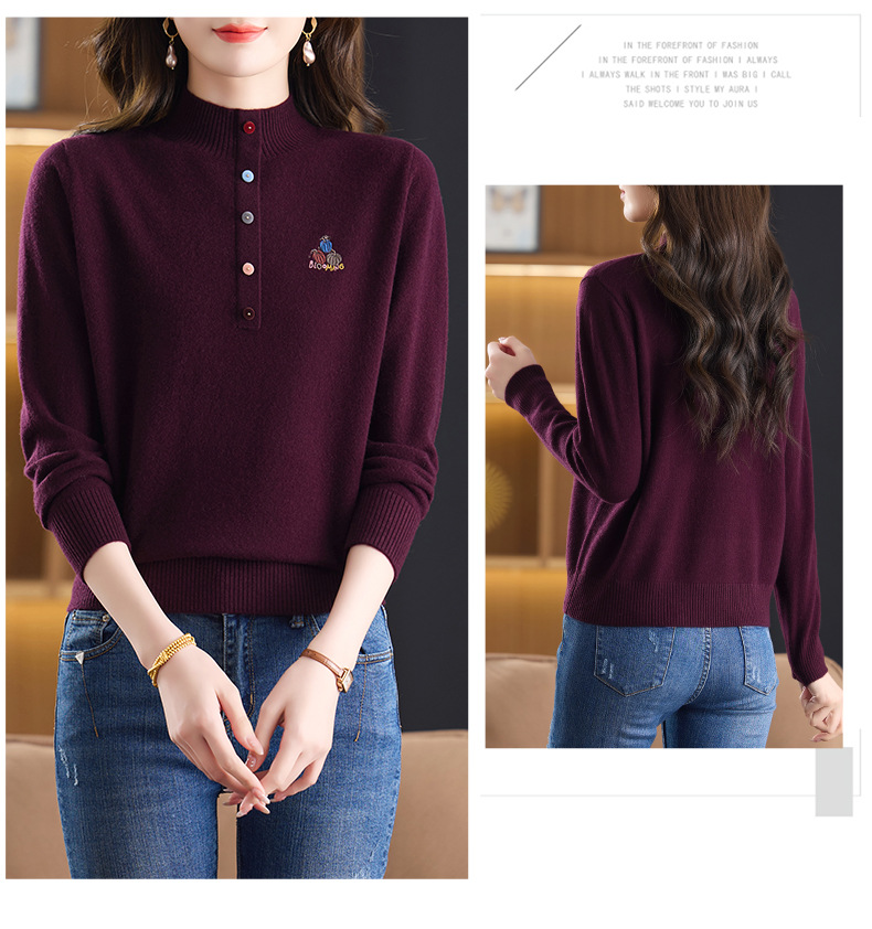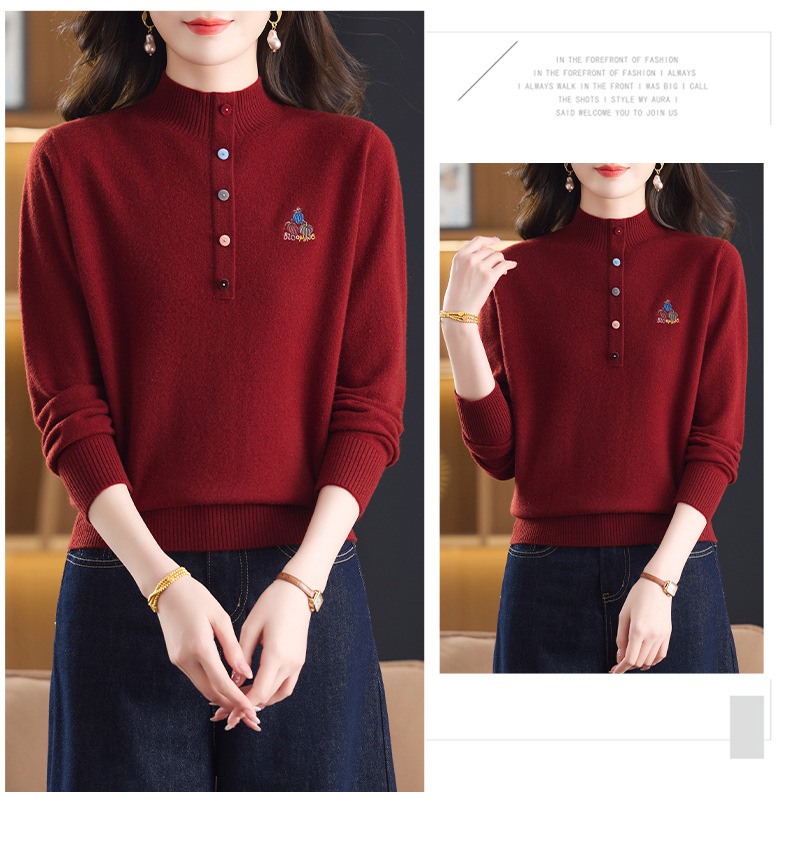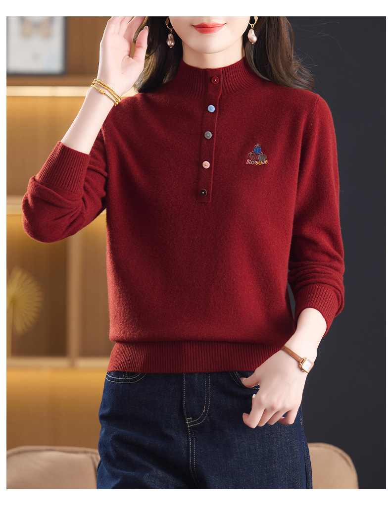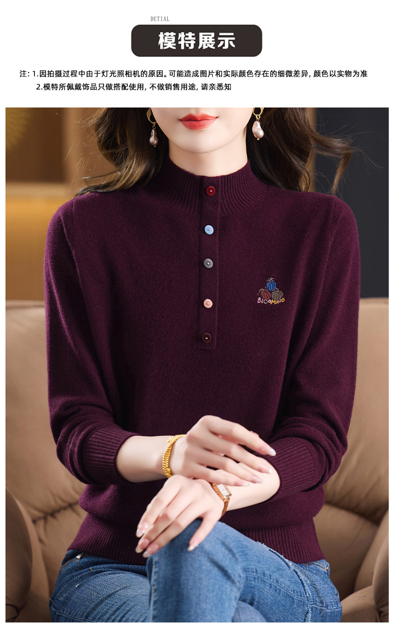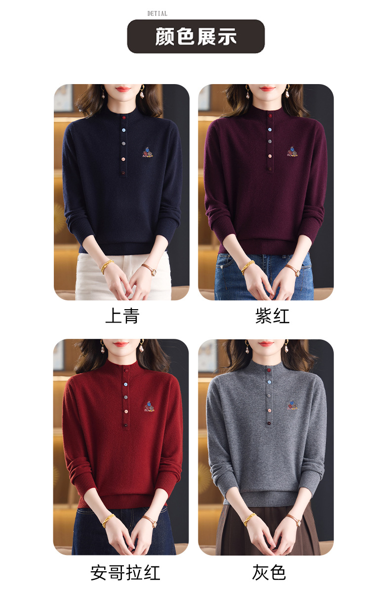 CC100纯羊毛女秋冬套头半高领打底针织衫刺绣长袖毛衣宽松大码上衣