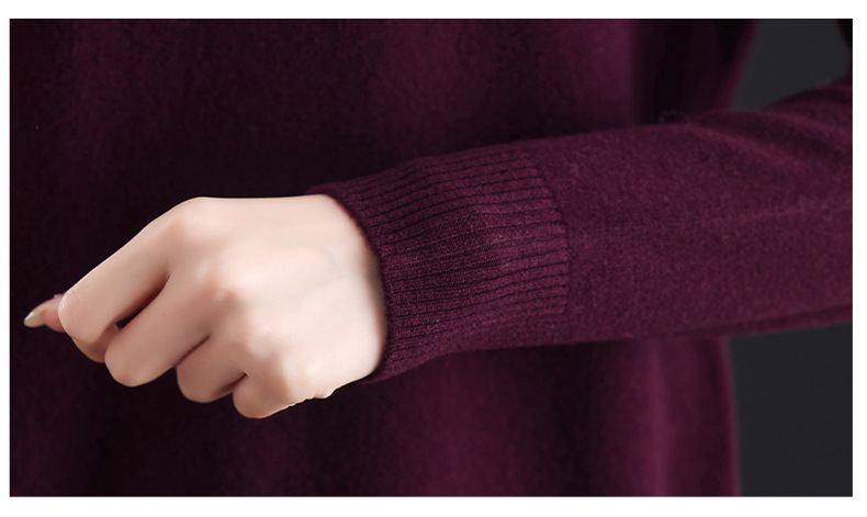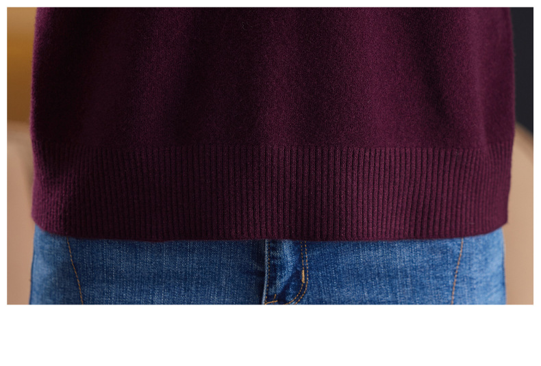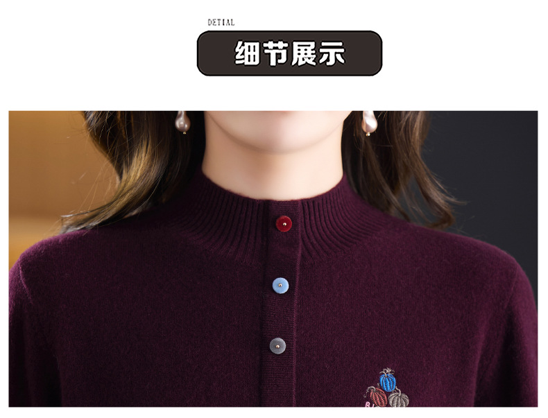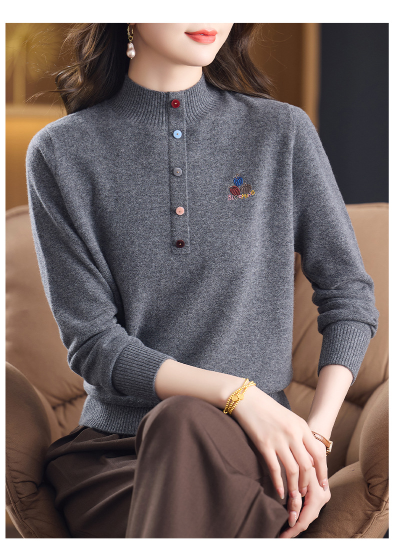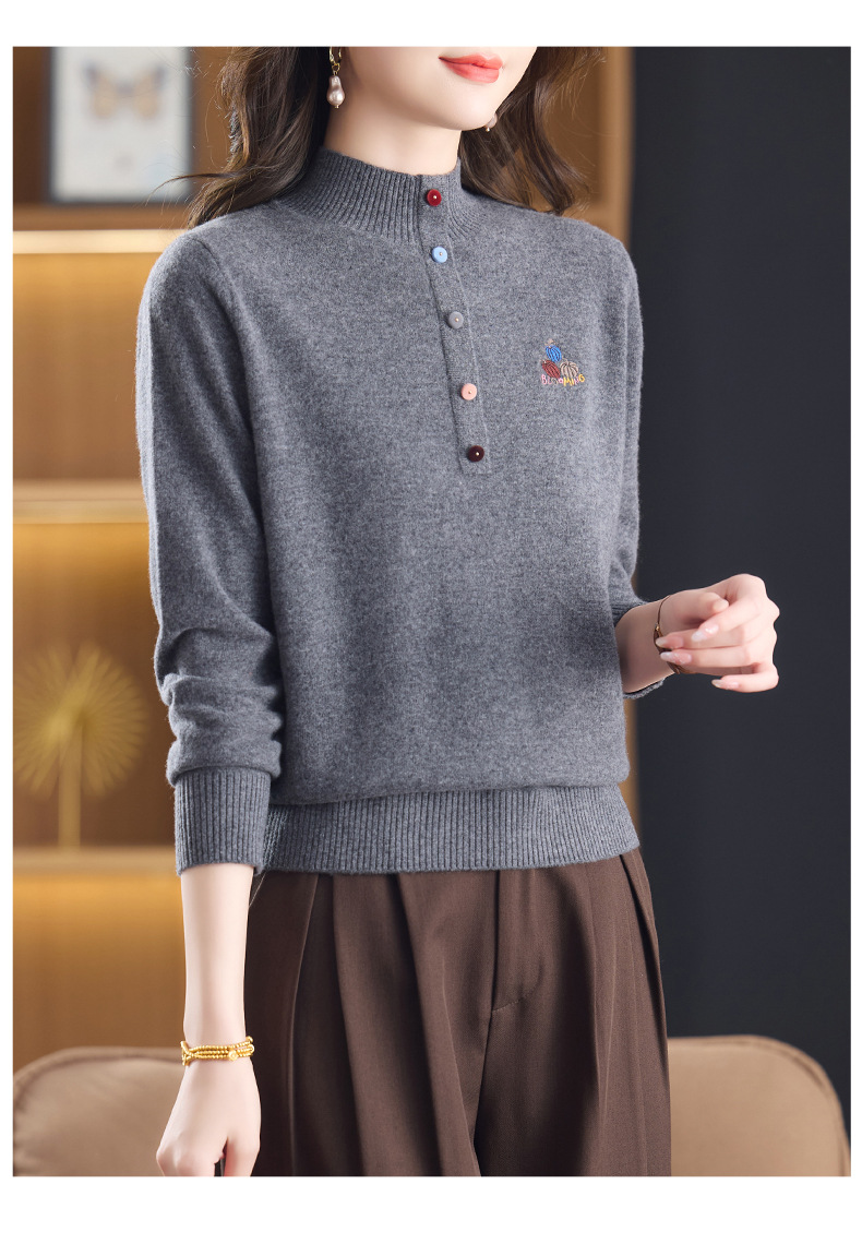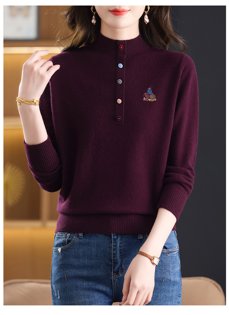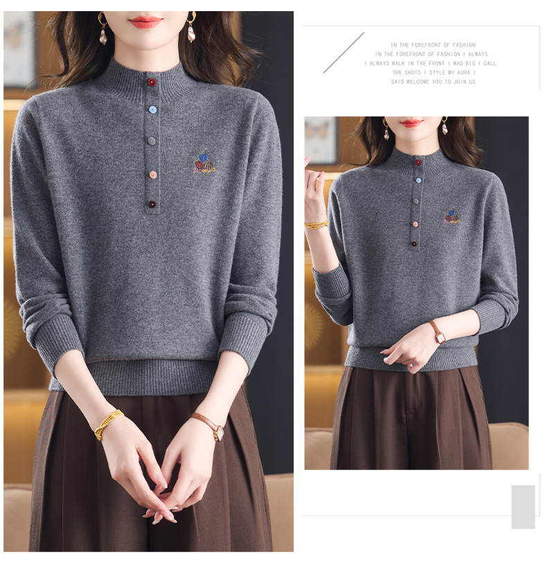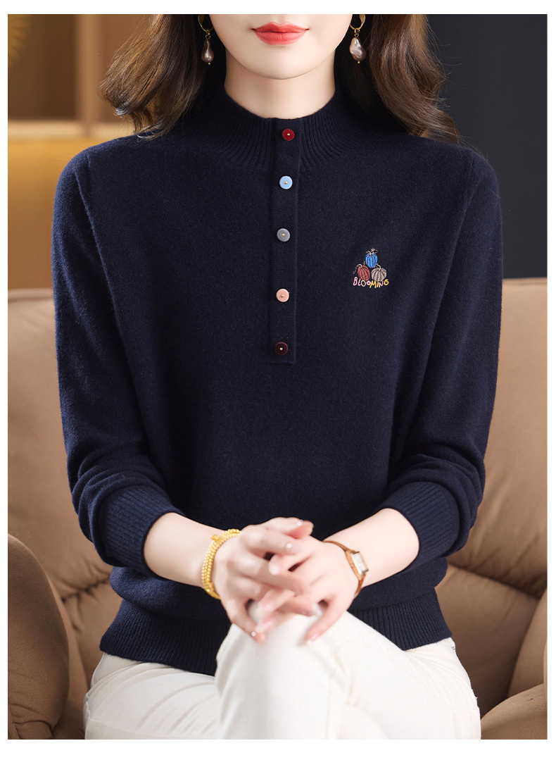 CC100纯羊毛女秋冬套头半高领打底针织衫刺绣长袖毛衣宽松大码上衣
