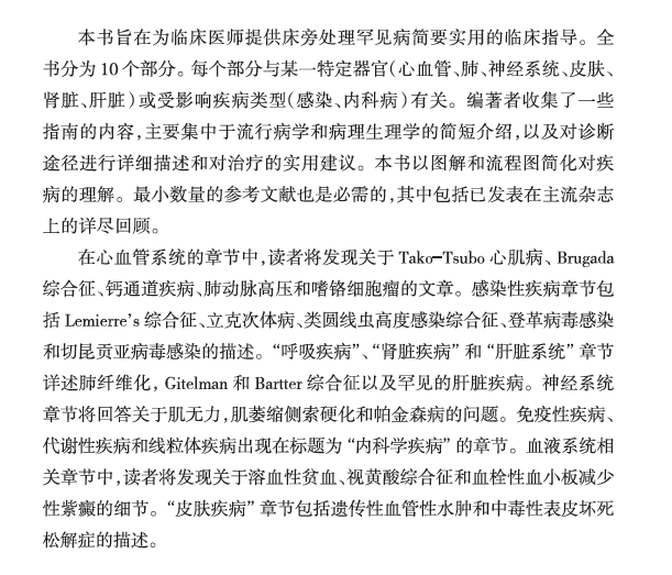 本书以简洁务实的语言向临床医务工作者提供了一个在病床边鉴别和诊断ICU中罕见疾病的指导。虽然明确定义的罕见疾病在一般人群中发病率很低,但这些疾病常在ICU中得以诊断,影响大量收住ICU的患者。本书除了概述介绍外,包括9个章节,每个章节都涉及一些重要的器官(如心脏、肺、神经系统、皮肤、肾脏、肝脏等)。作者对疾病的流行病学及病理生理进行简短介绍后,推荐了一些可操作的方法,并配有插图和计算方法,帮助读者更加生动形象地认识和诊断疾病。