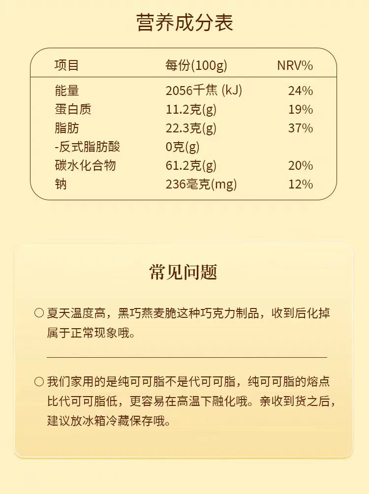 品名:喜山好物黑巧燕麦脆 规格:180g/盒*2盒;拍几份发几个包裹,不一定能同时到达,请耐心等待 发货产地:上海&杭州 包装方式:盒装 保质期:3个月 物流信息:默认韵达/中通快递,不支持指定快递 发货区域:新疆、西藏、海南不发; 物流详情:周六、周日及节假日除外,正常48小时内发货,到货时间约为2~5天,请耐心等待 售后说明:收到货后有质量问题,在24小时内都可以拍照(坏品+快递单面箱子一起拍)上传,申请按坏品比例理赔或联系客服,生鲜食品性质特殊,不支持7天无理由退换货;因地址错误,手机号联系不上,拒收等造成的损失无法售后,请理解; |