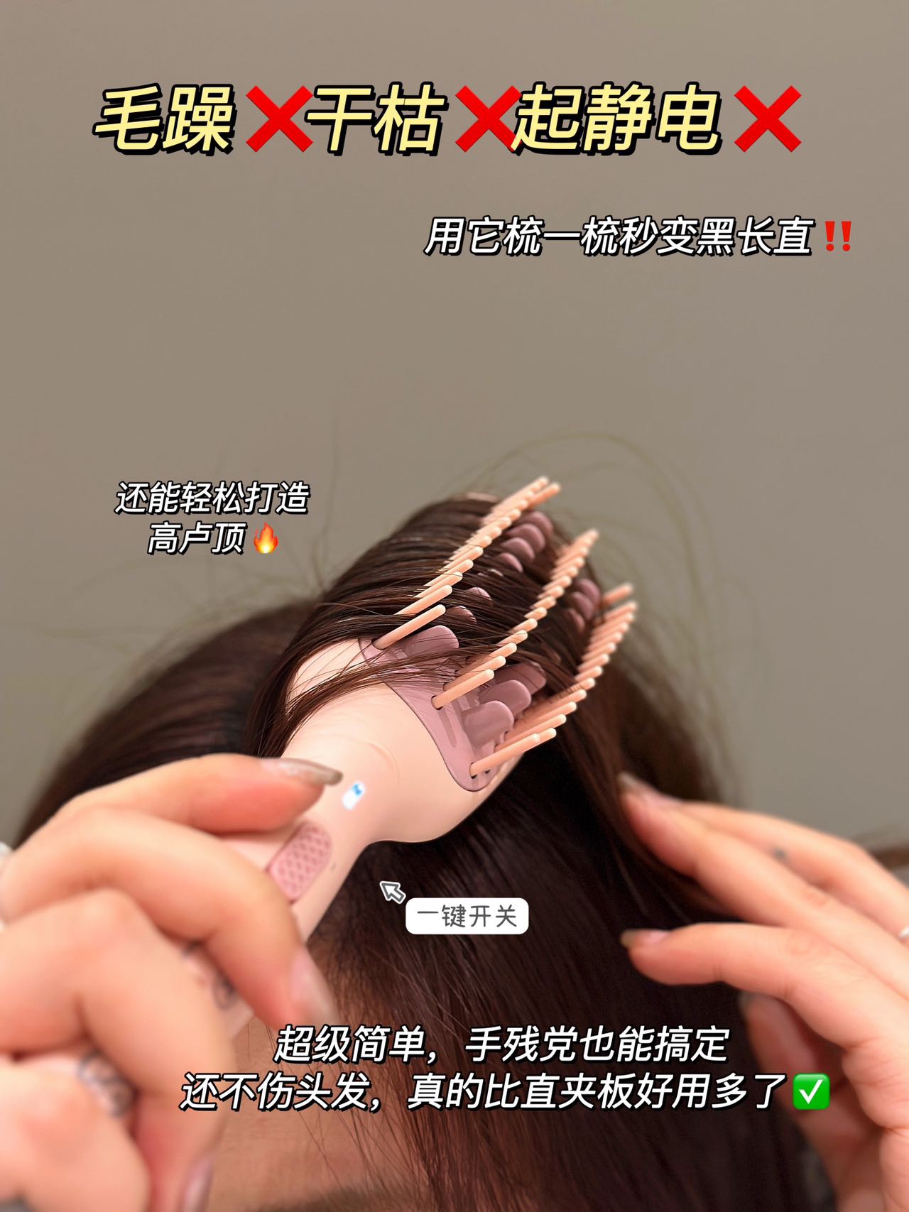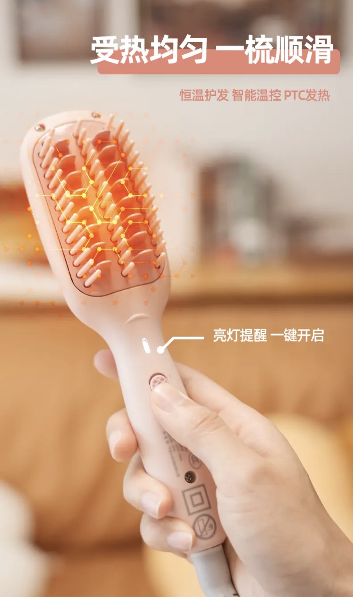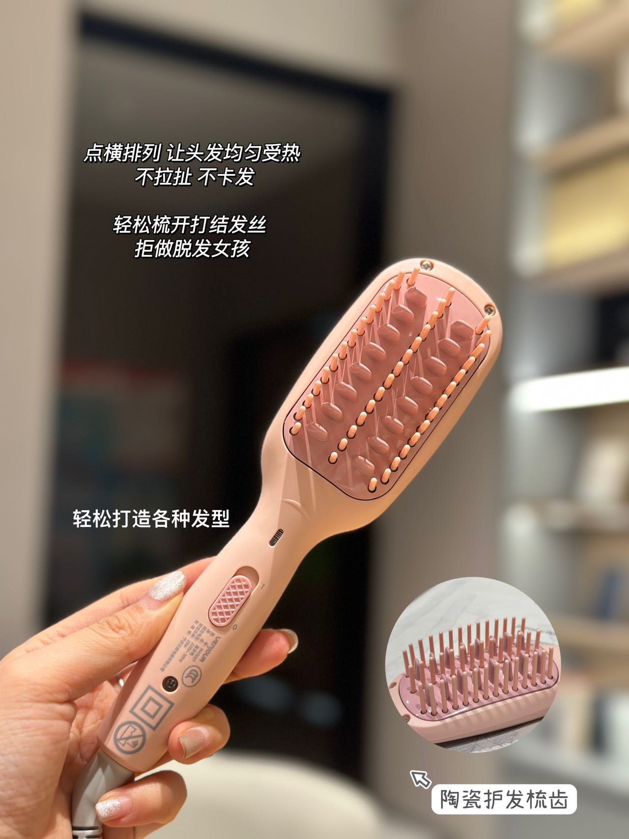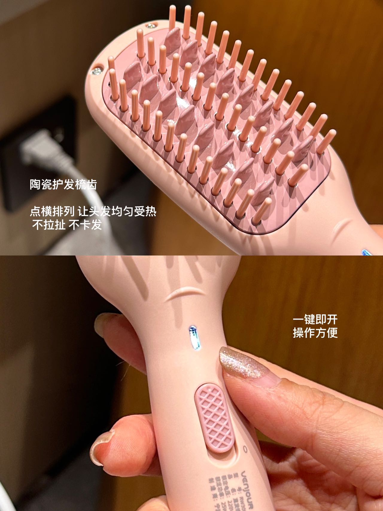 实现快速升温及自动恒温功能 陶瓷护发梳齿 点横排列 让头发均匀受热 不拉扯 不卡发 轻松梳开打结发丝 拒做脱发女孩!每天花个1分钟就搞定打结啦 还可以轻松搞定氛围感高颅顶 出差旅行放在收纳袋里 走哪带哪 已经是离不开的程度啦!直发梳预热只要二三十秒 恒温设计不伤发有还是防烫的!梳齿很光滑 梳头发基本不会拉扯打结 用起来很舒服!这下再也不怕头发尴尬期了