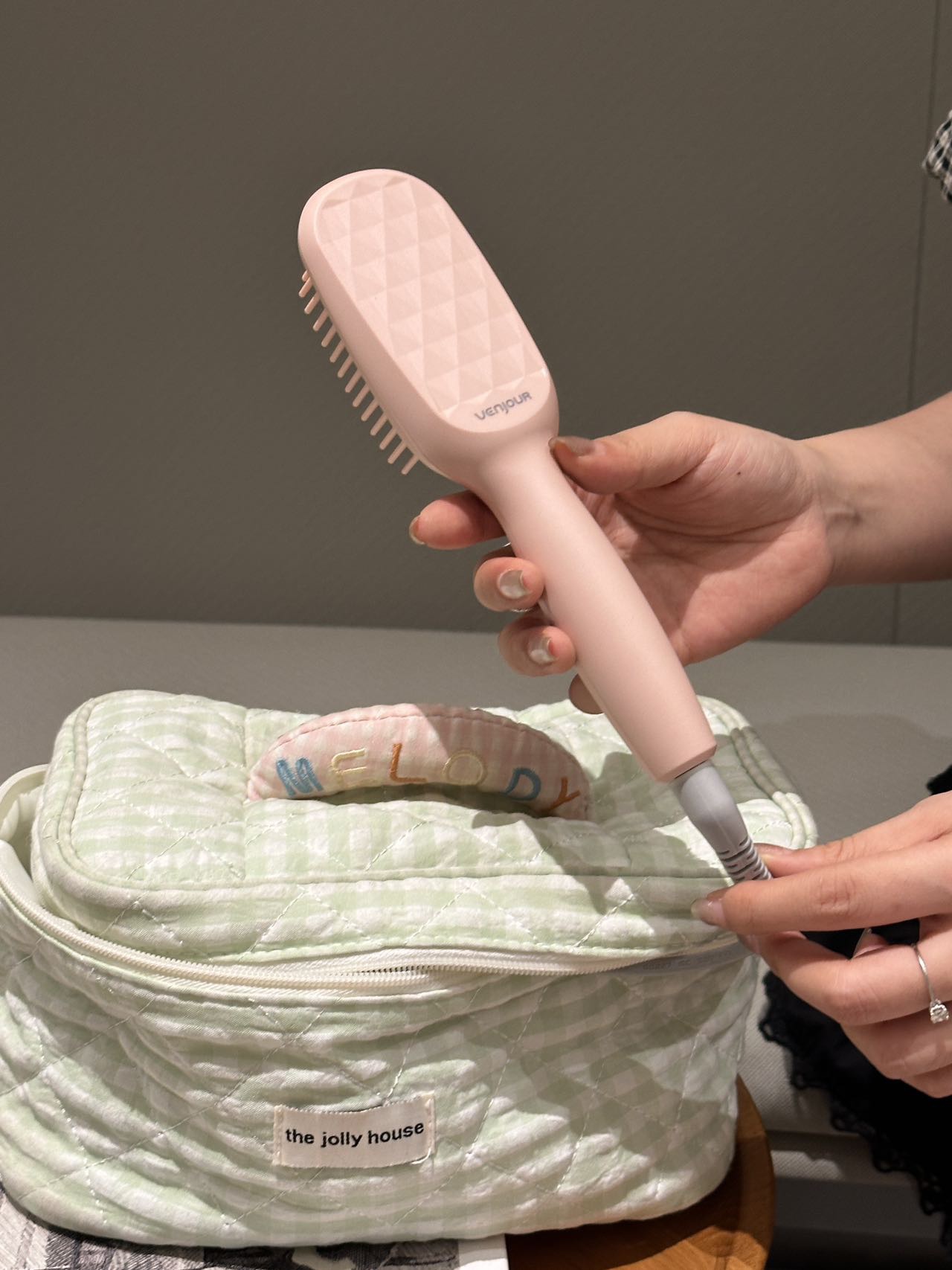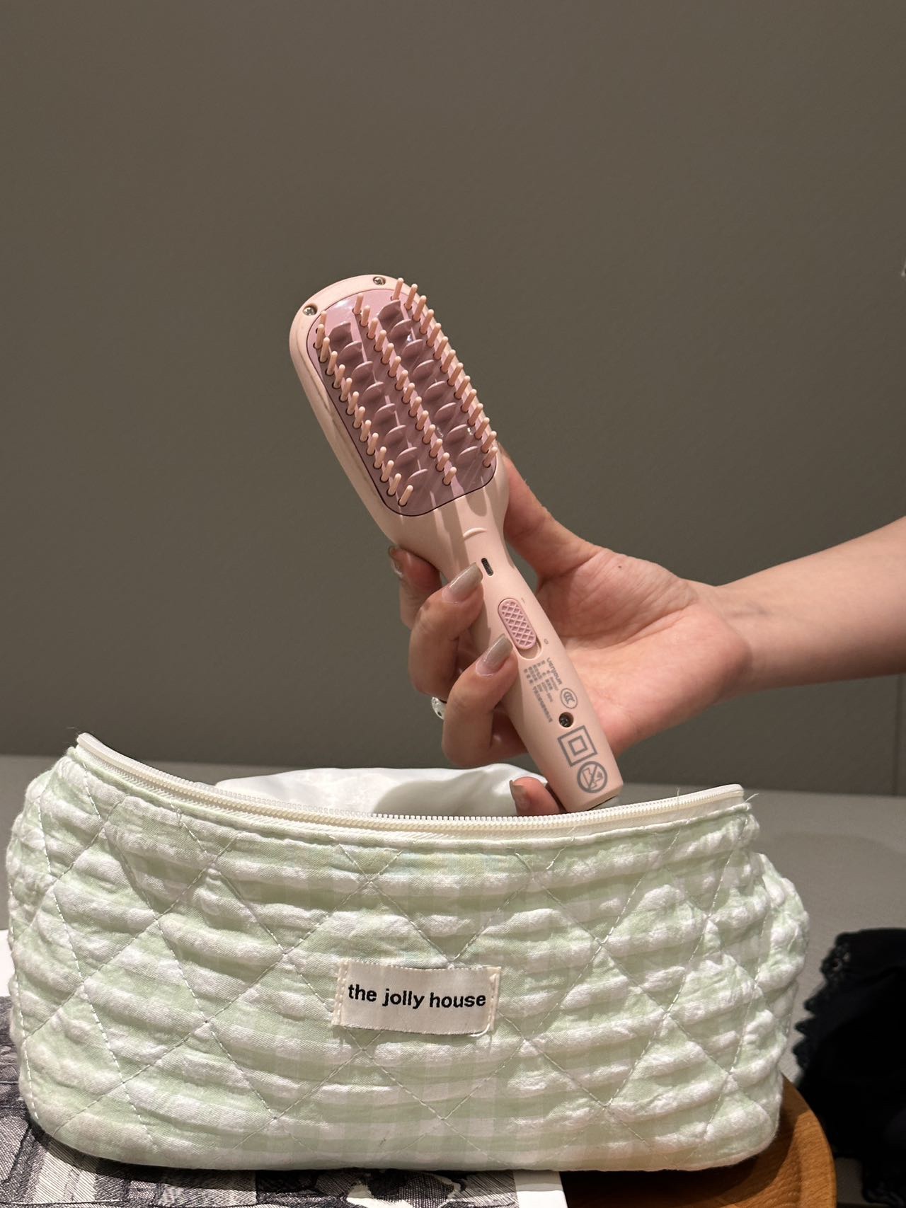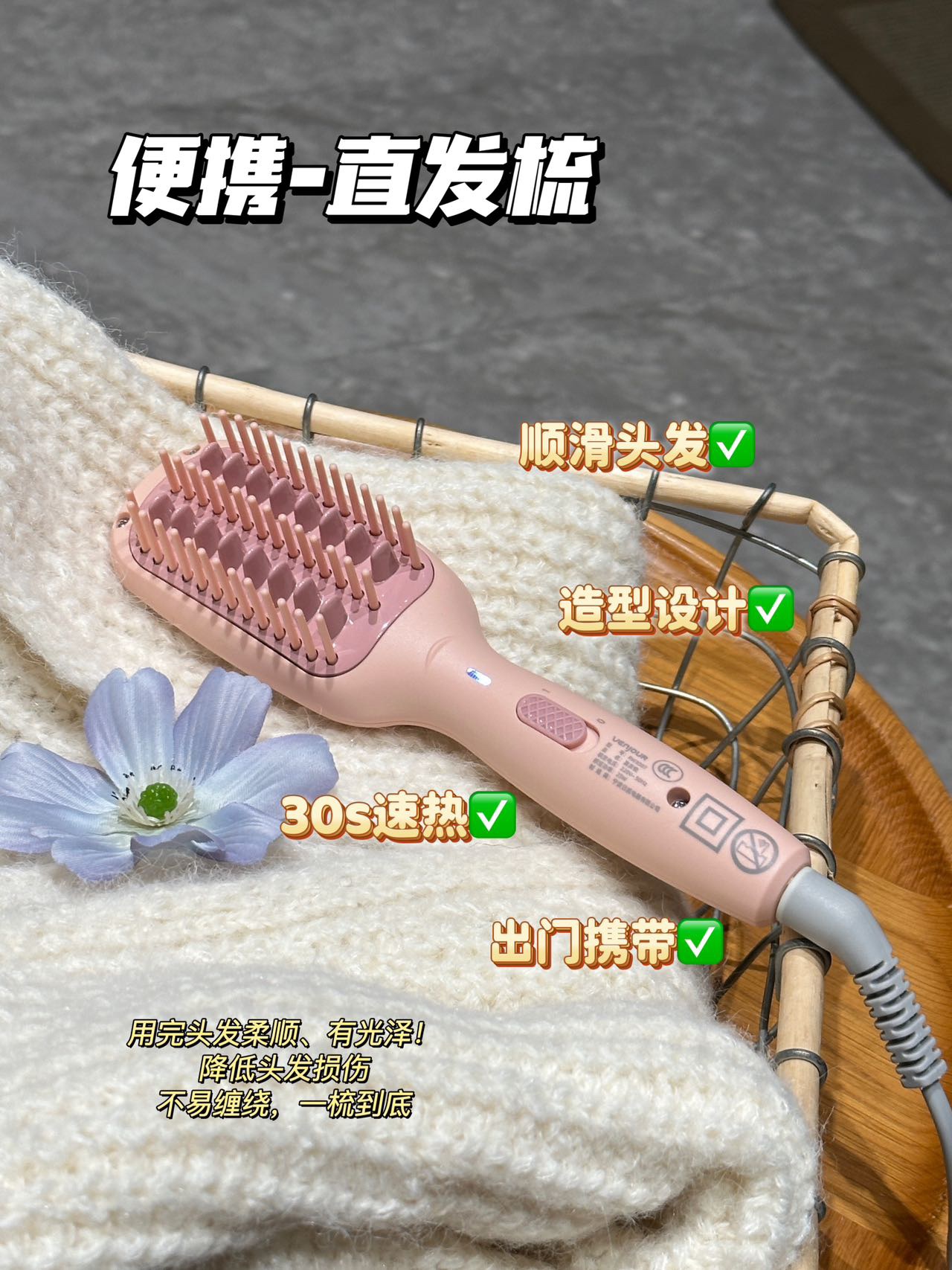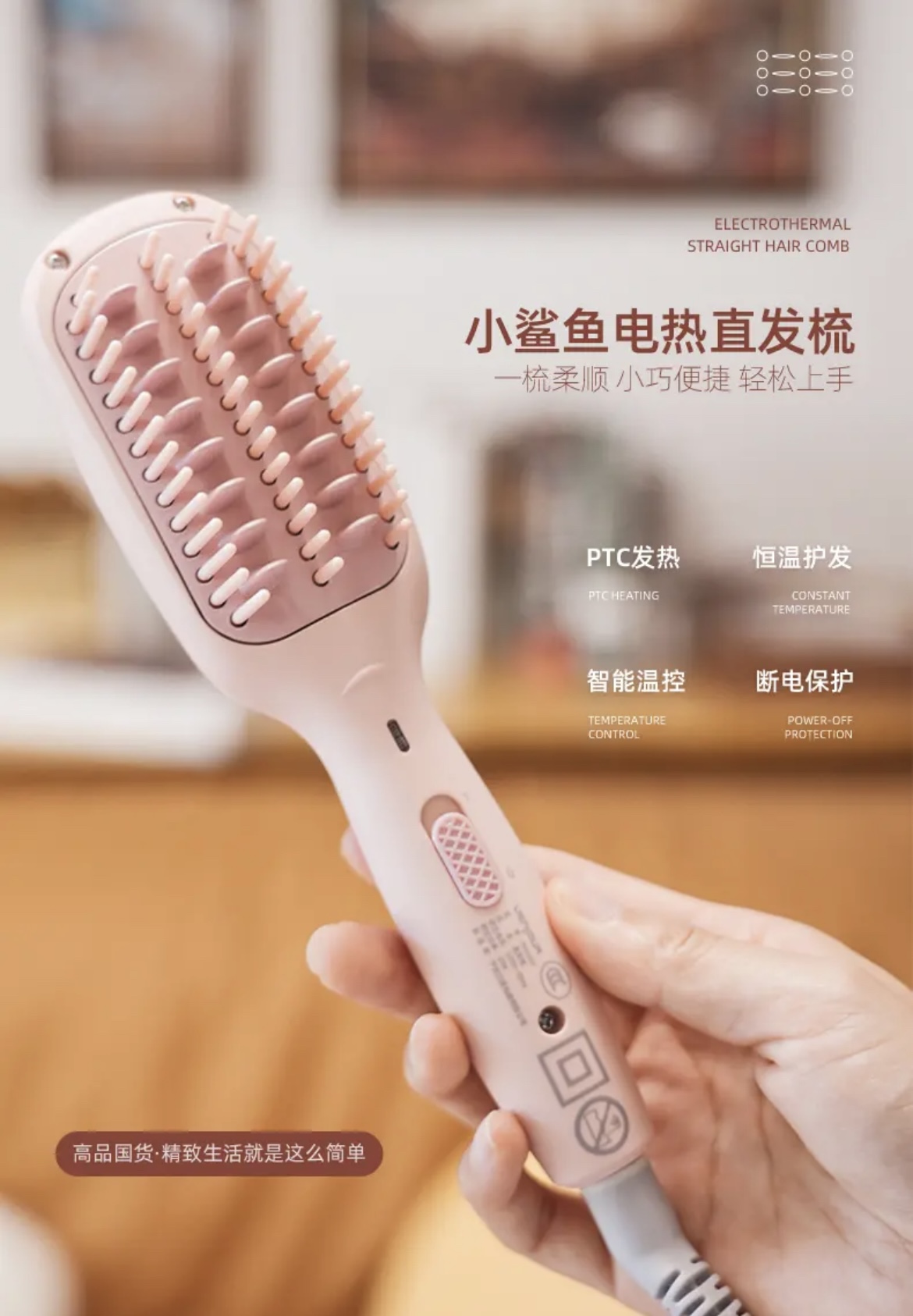 实现快速升温及自动恒温功能 陶瓷护发梳齿 点横排列 让头发均匀受热 不拉扯 不卡发 轻松梳开打结发丝 拒做脱发女孩!每天花个1分钟就搞定打结啦 还可以轻松搞定氛围感高颅顶 出差旅行放在收纳袋里 走哪带哪 已经是离不开的程度啦!直发梳预热只要二三十秒 恒温设计不伤发有还是防烫的!梳齿很光滑 梳头发基本不会拉扯打结 用起来很舒服!这下再也不怕头发尴尬期了