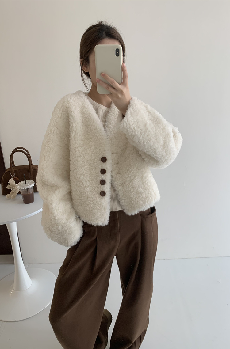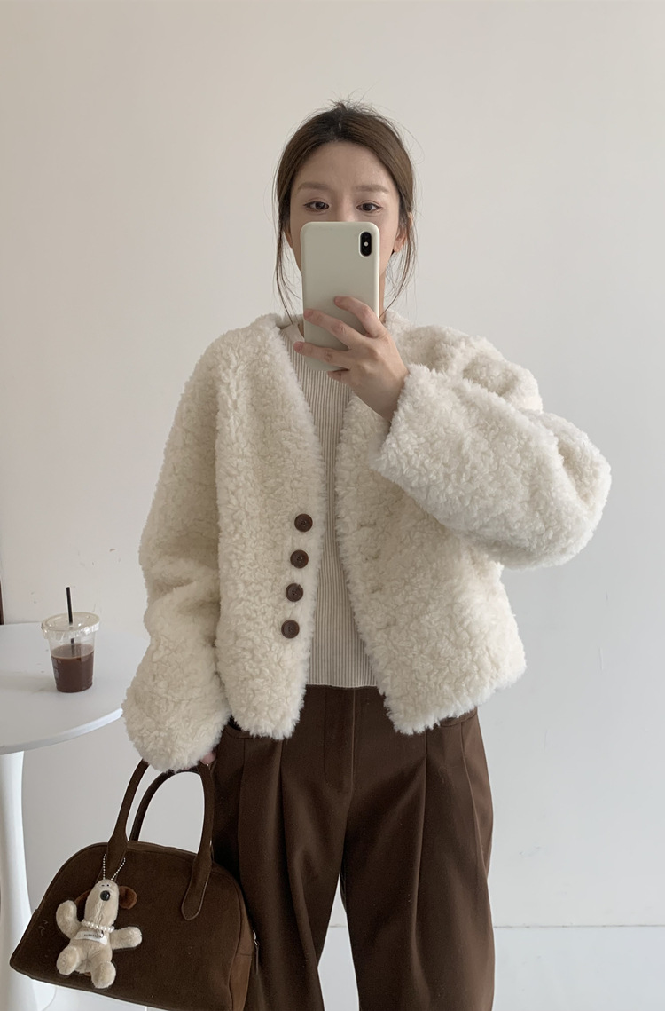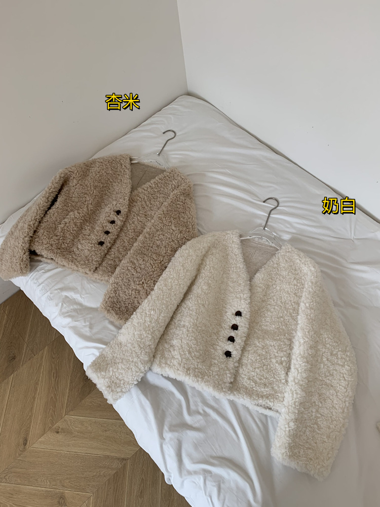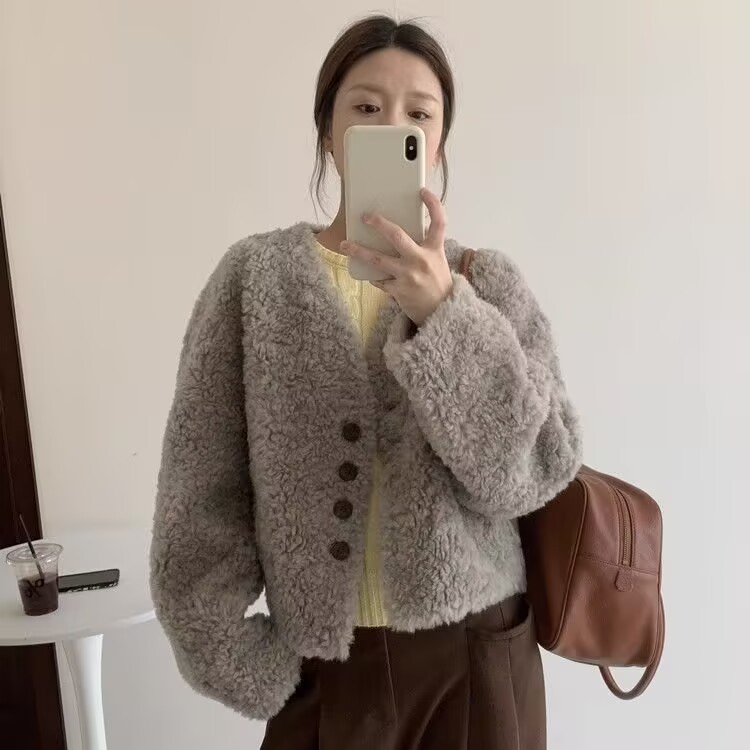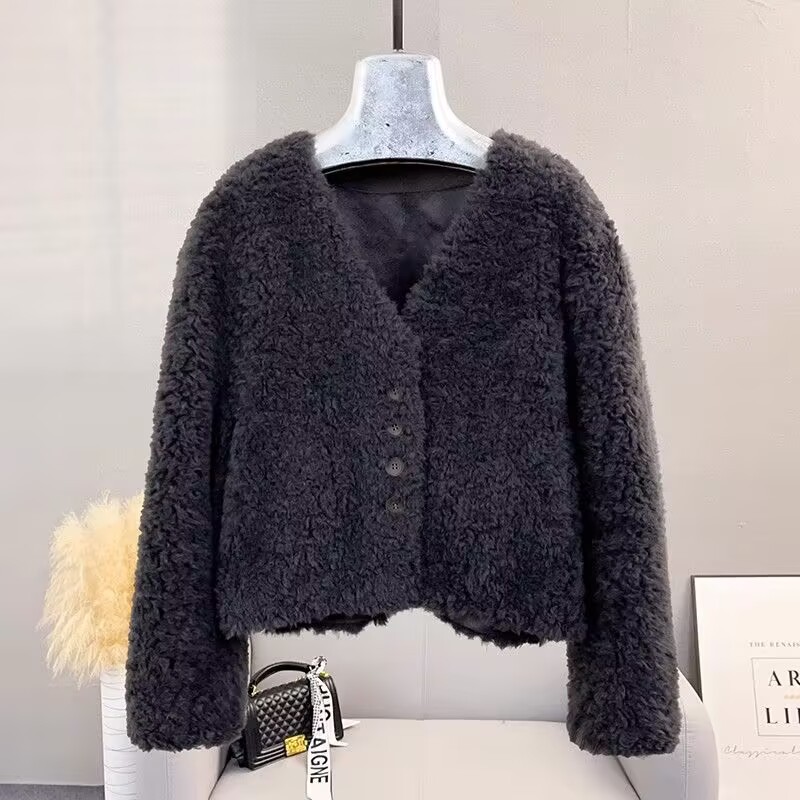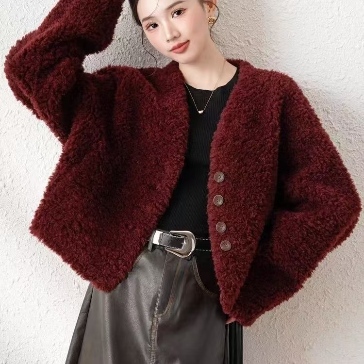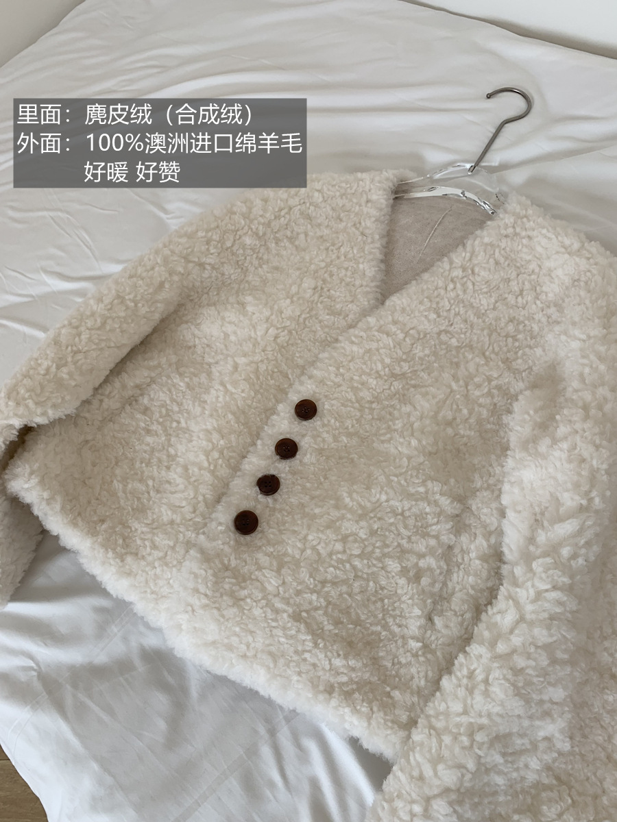 丁摩100绵羊羔毛韩版2025冬季新款羊剪绒皮毛一体皮草外套女v领短款ALW2511-5
