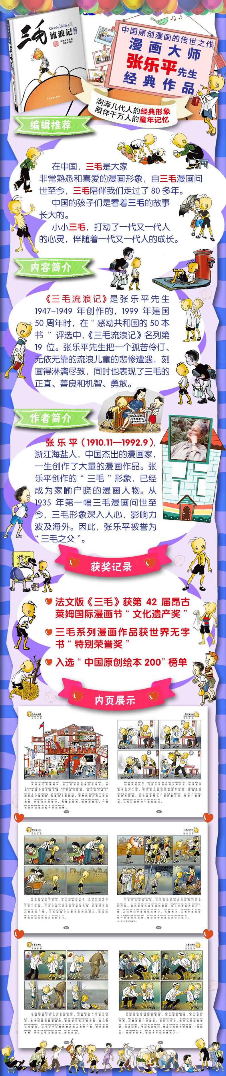 自1935年张乐平先生笔下三毛漫画问世以来,三毛形象深入人心,影响力波及海外。《三毛流浪记》是张乐平先生1947-1949年创作的,曾多次荣登全国畅销书少儿类,1999年,在建国50周年时,被评为“感动共和国的50本书”之一。张乐平先生把一个孤苦伶仃、无依无靠的流浪儿童的悲惨遭遇,刻画得淋漓尽致,同时也表现了三毛的正直、善良和机智、勇敢,可以说,三毛伴随了几代人的成长历程。