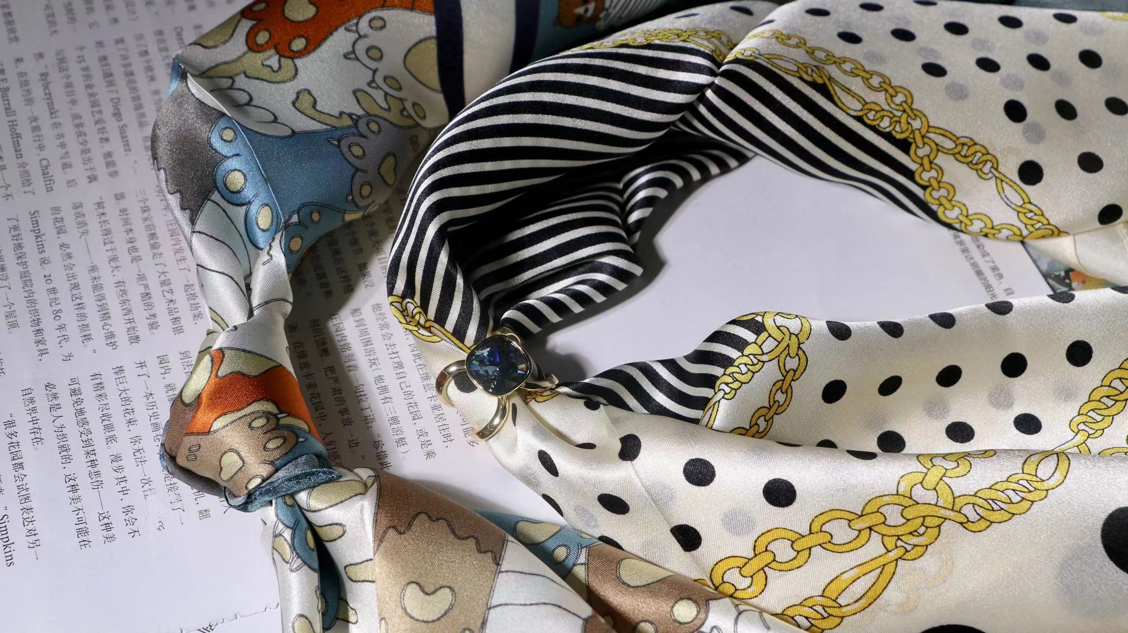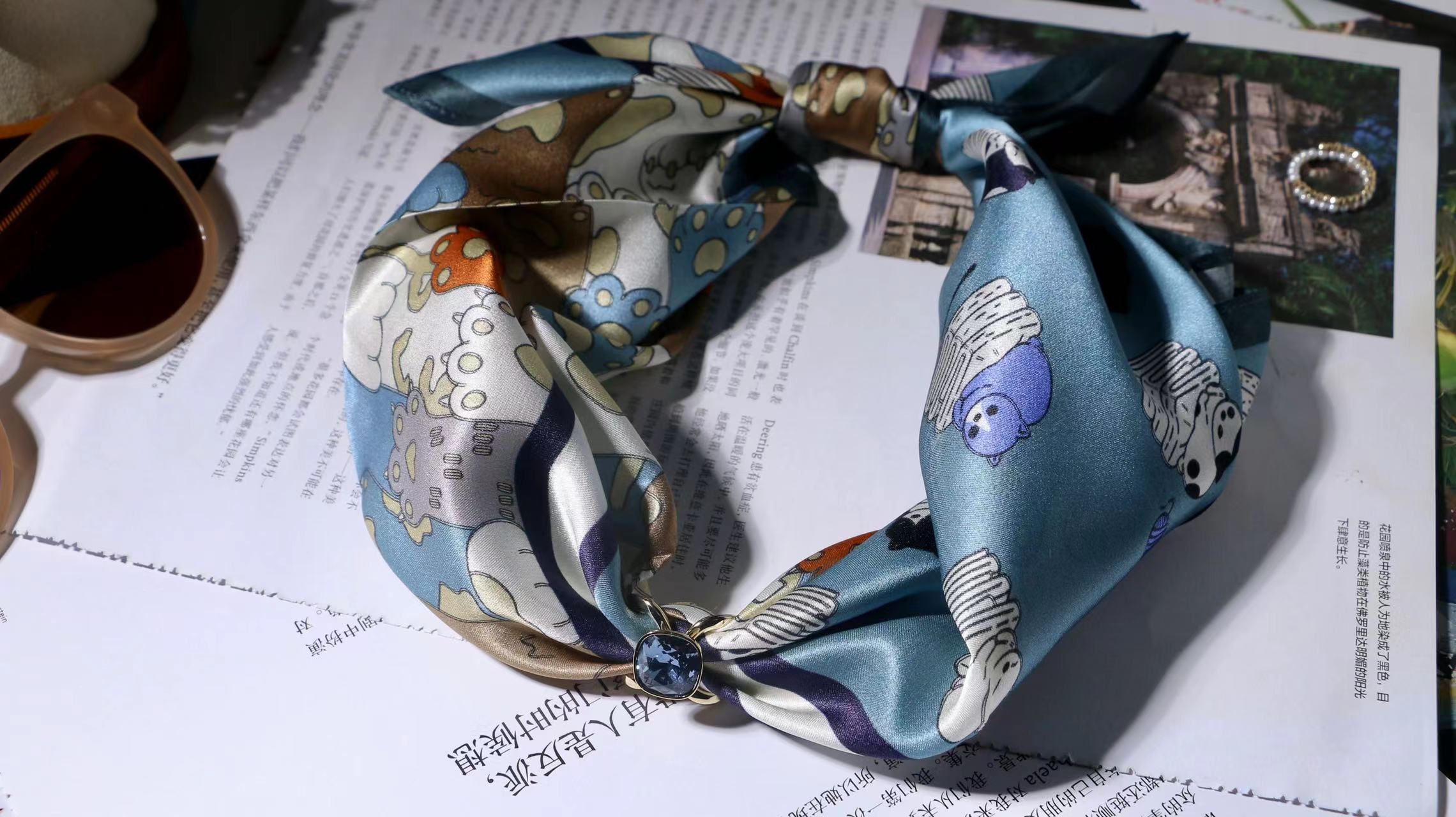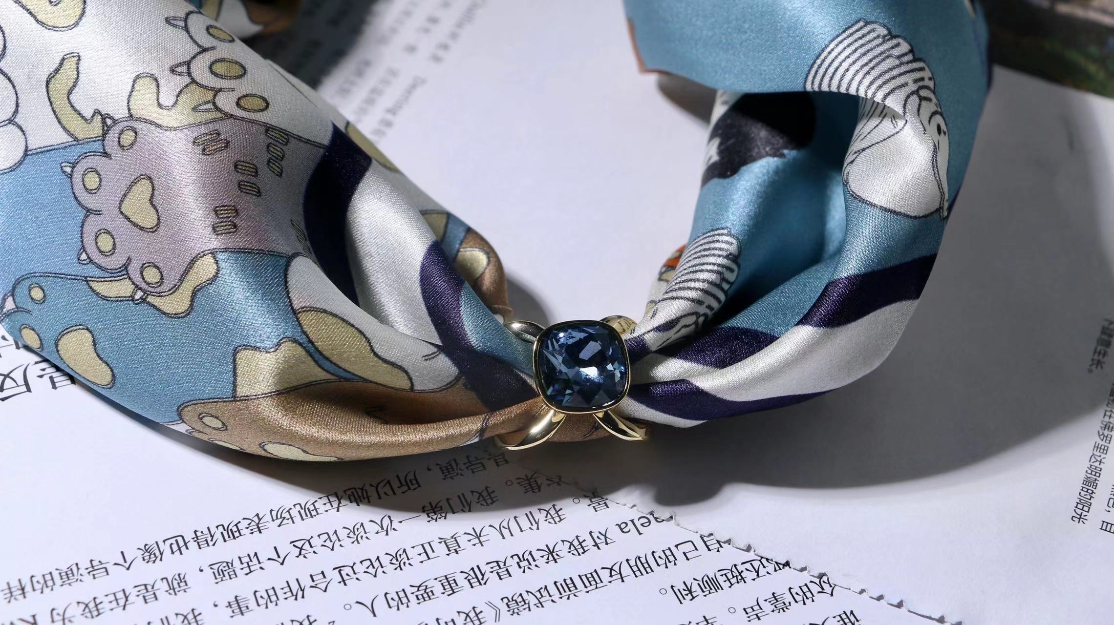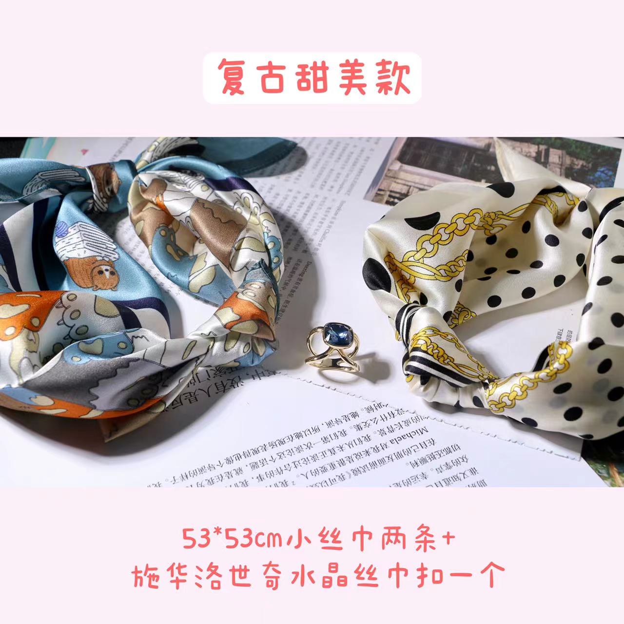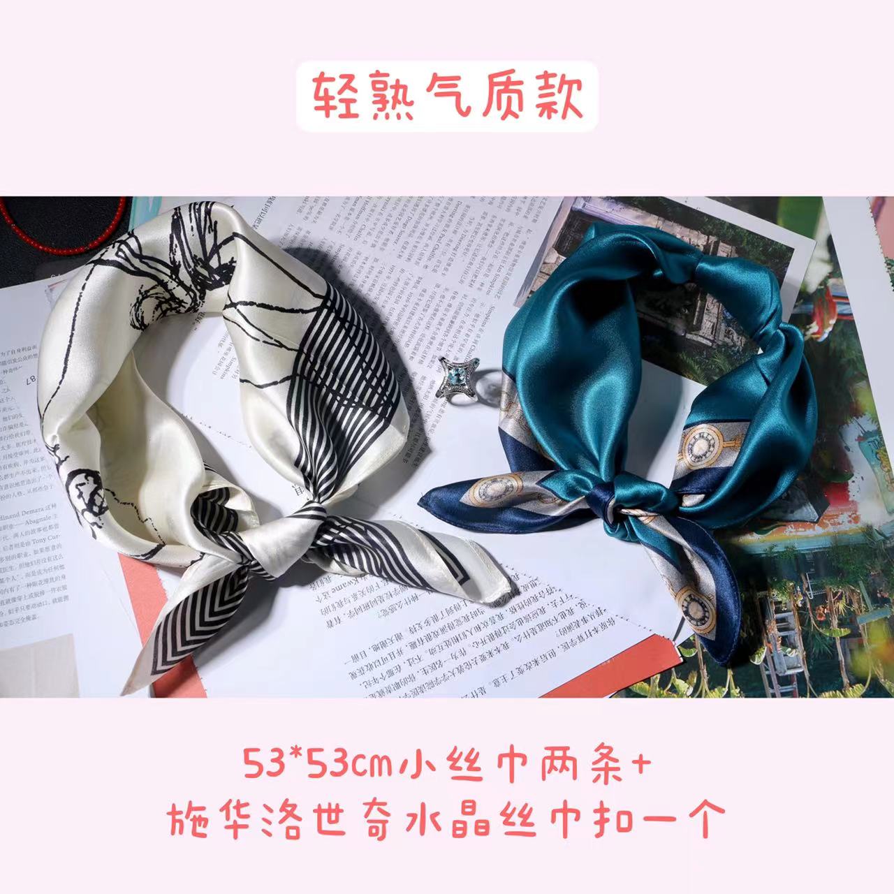 一共有2个款式,一个稍微成熟气质一点,另一个更甜美复古一点,尽量满足大家的风格,礼盒里包含两条53*53cm的100%桑蚕丝小丝巾和一个施华洛世奇水晶的丝巾扣。轻熟气质款里的方形丝巾扣是前后两面不同的设计,很别致。