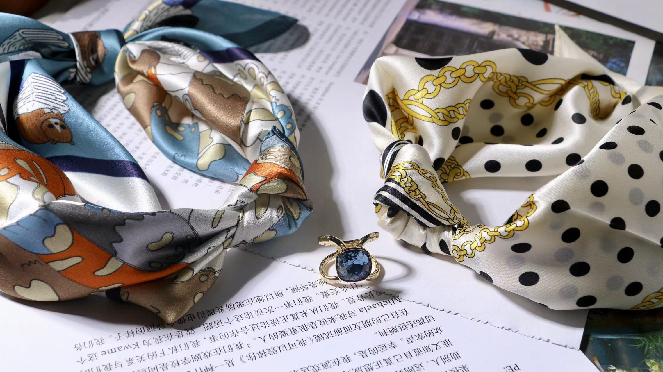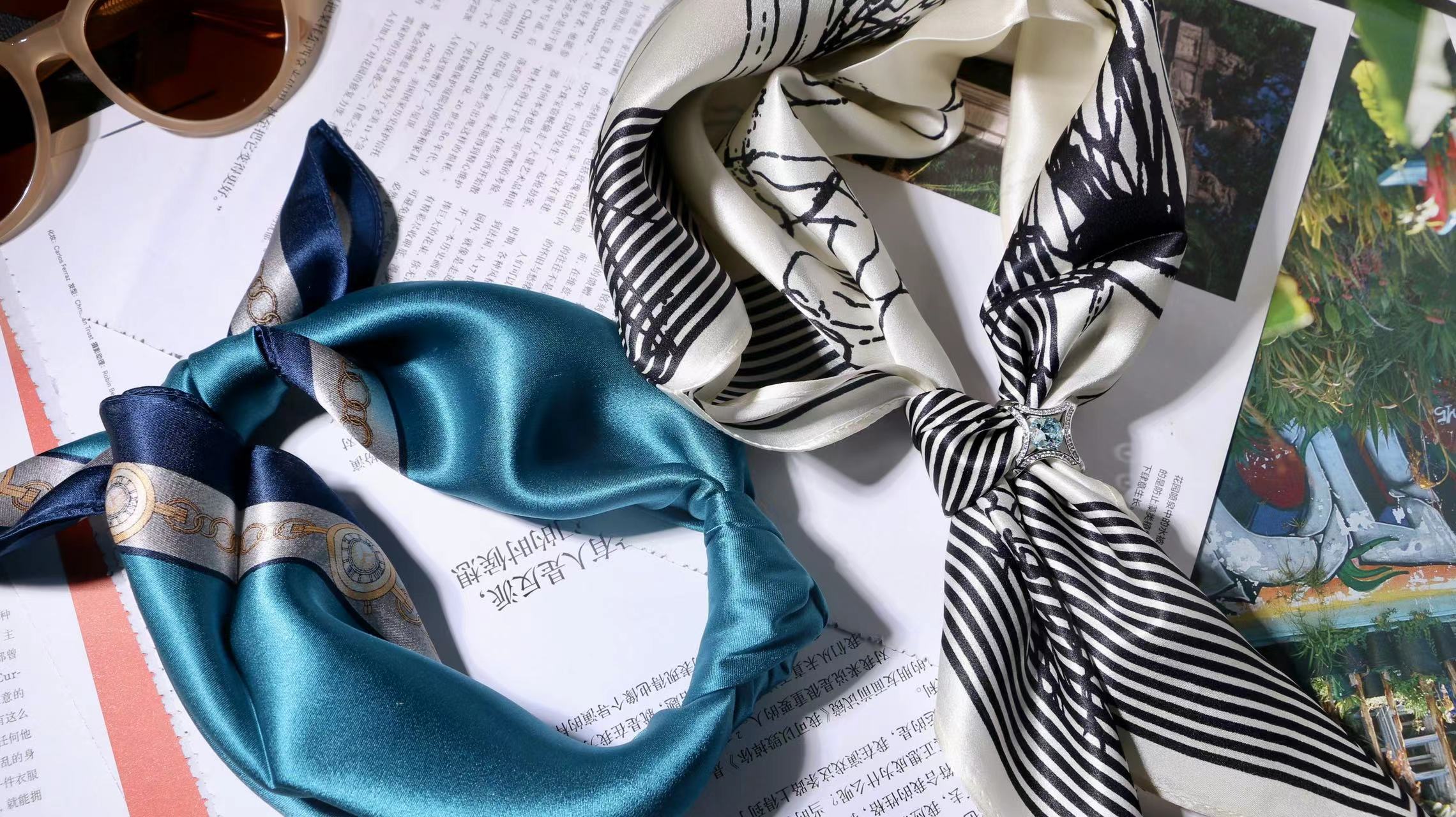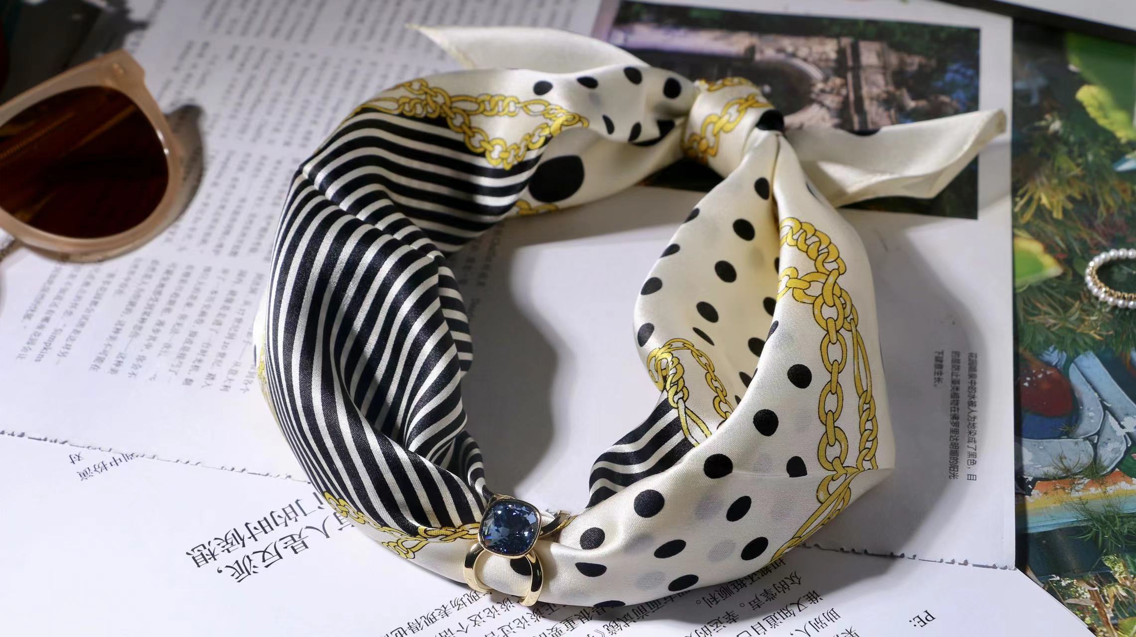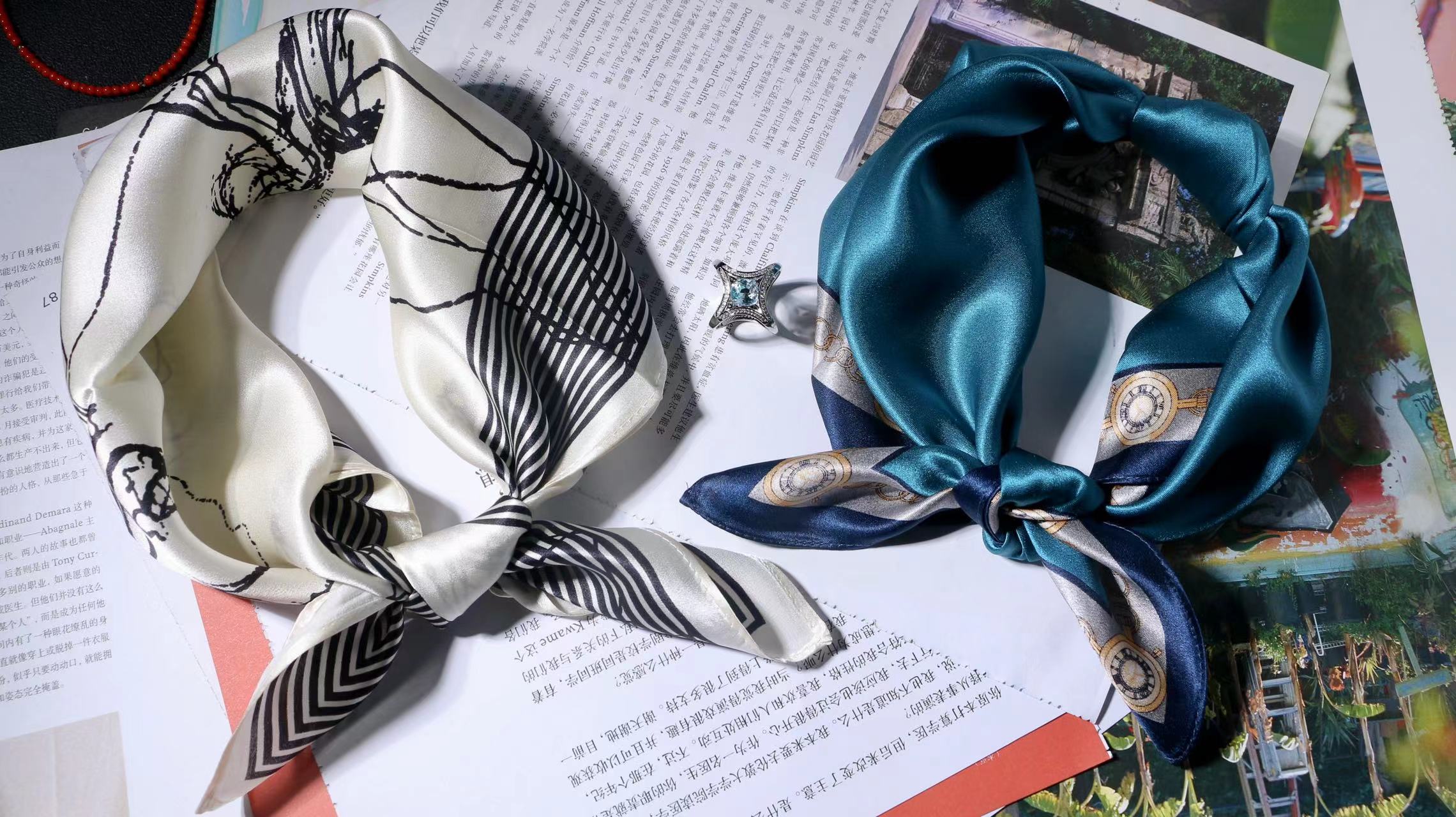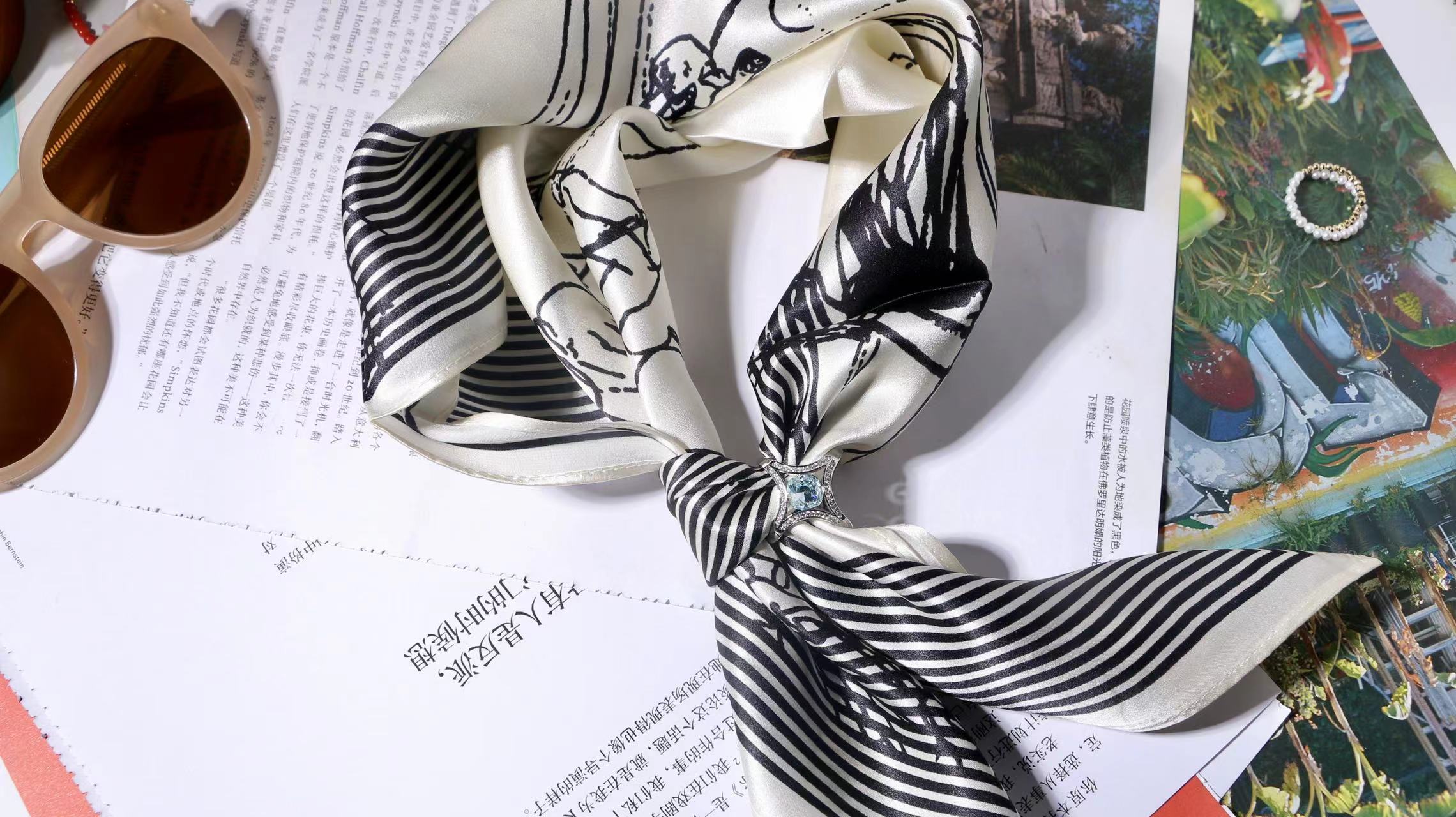 一共有2个款式,一个稍微成熟气质一点,另一个更甜美复古一点,尽量满足大家的风格,礼盒里包含两条53*53cm的100%桑蚕丝小丝巾和一个施华洛世奇水晶的丝巾扣。轻熟气质款里的方形丝巾扣是前后两面不同的设计,很别致。