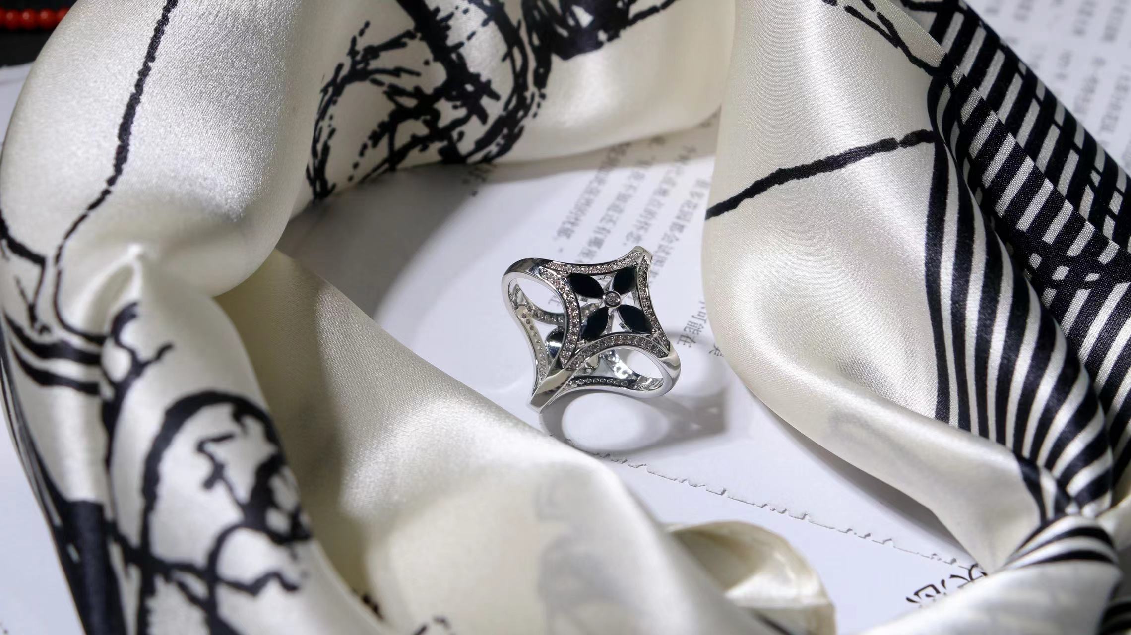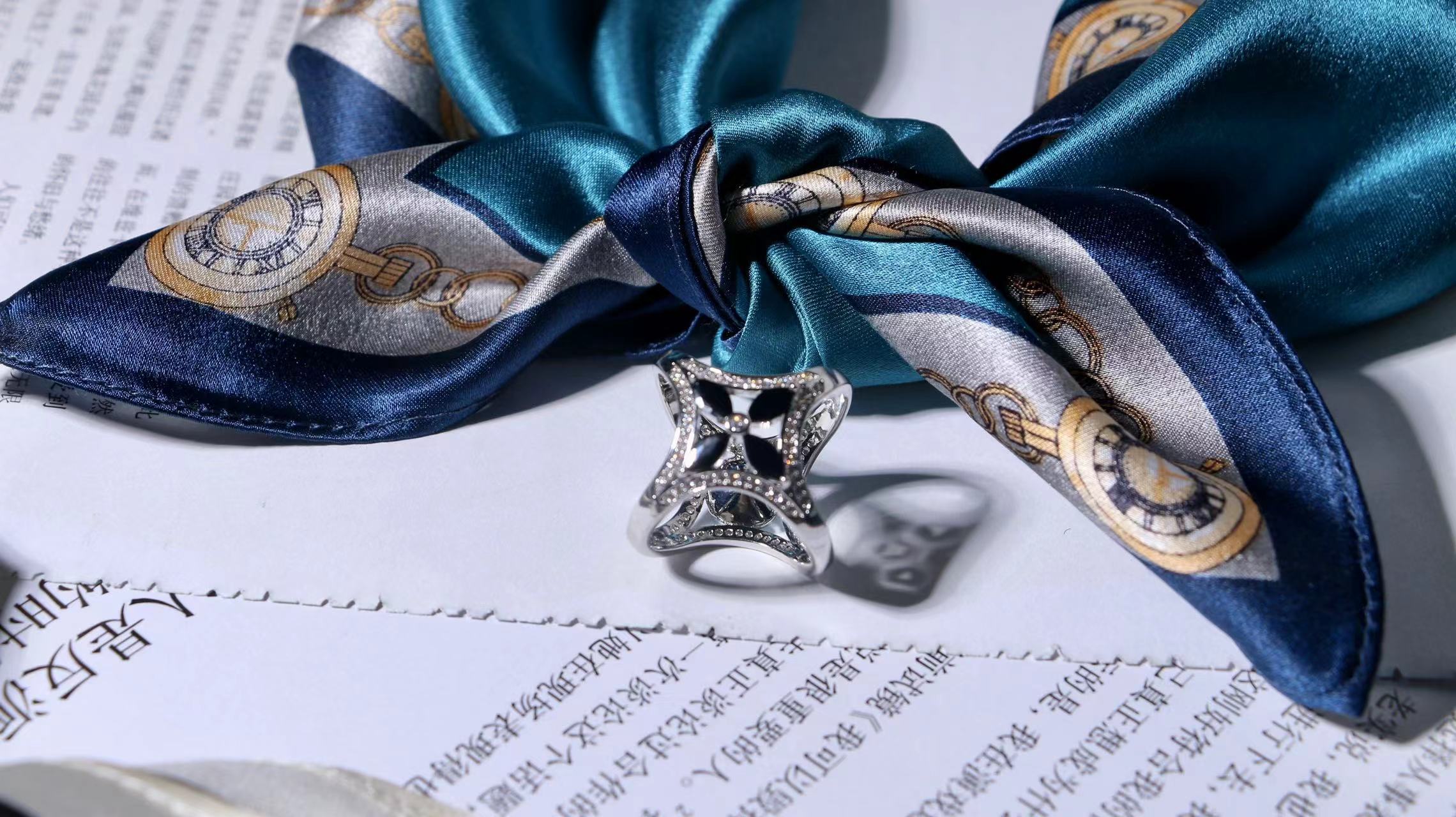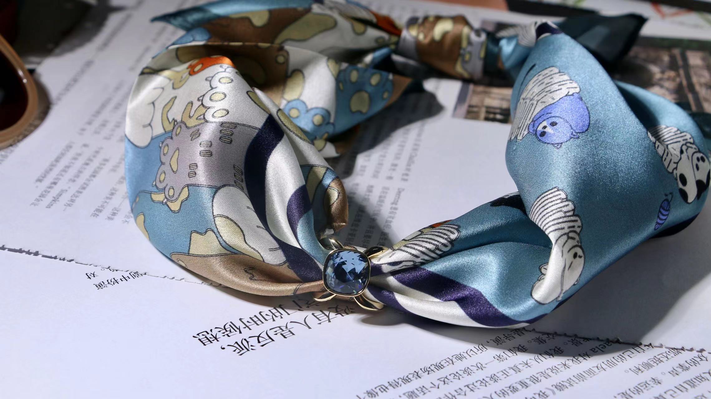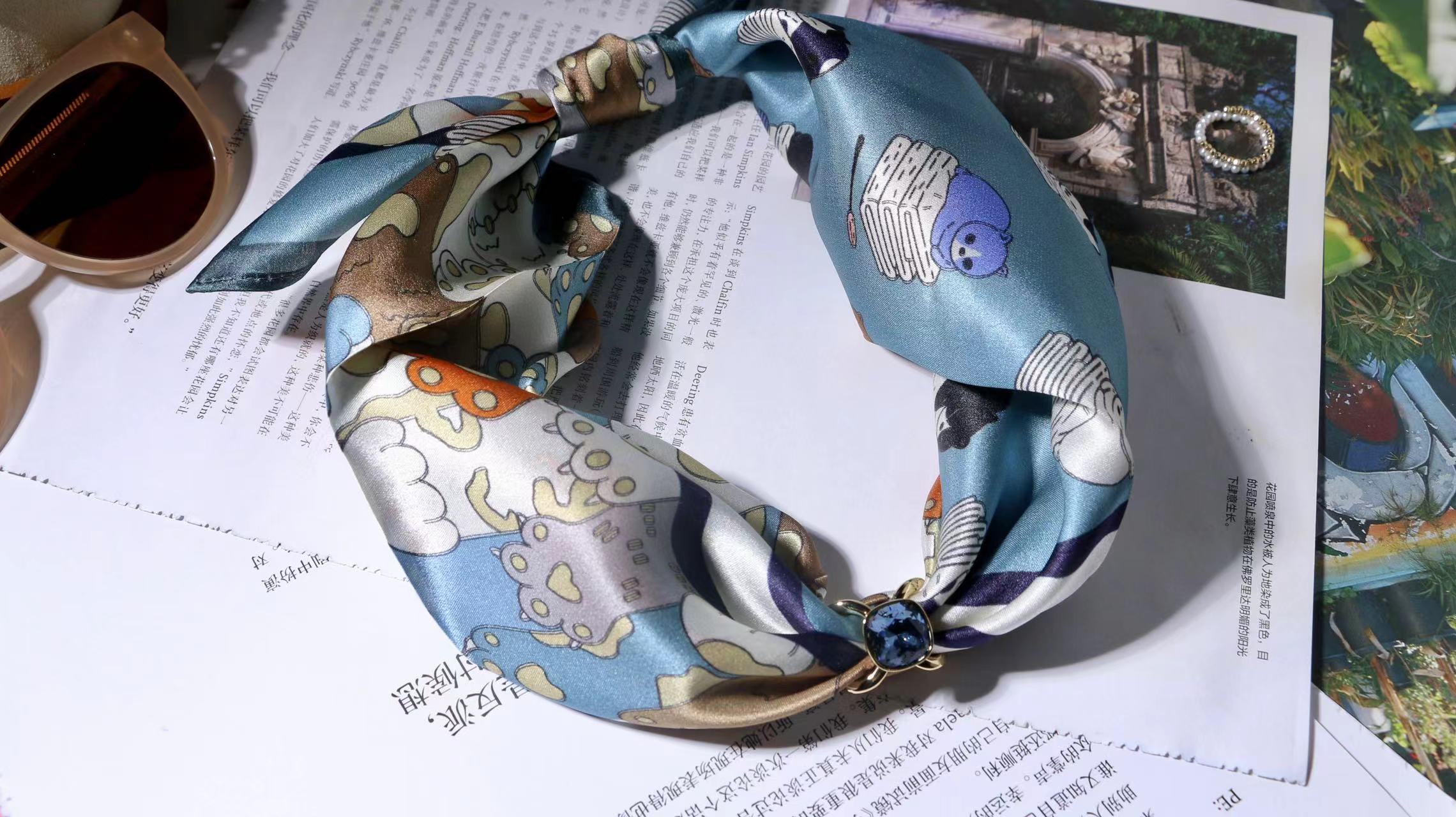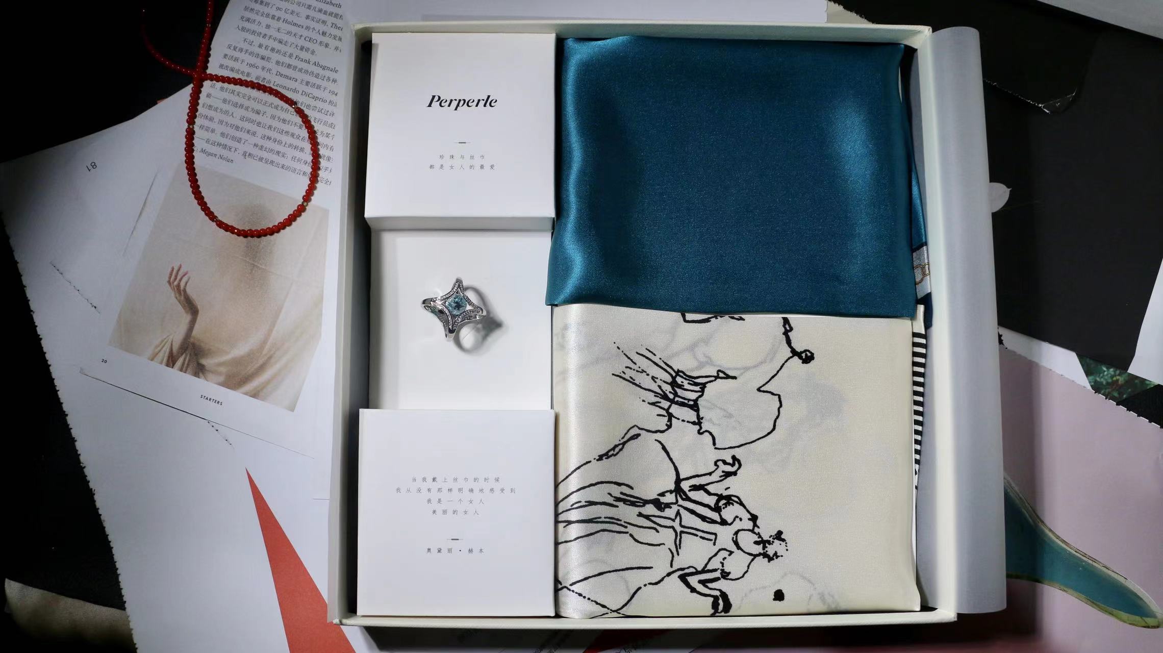 一共有2个款式,一个稍微成熟气质一点,另一个更甜美复古一点,尽量满足大家的风格,礼盒里包含两条53*53cm的100%桑蚕丝小丝巾和一个施华洛世奇水晶的丝巾扣。轻熟气质款里的方形丝巾扣是前后两面不同的设计,很别致。
