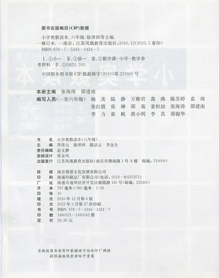 小学奥数读本 六年级 小学数学奥数思维提优 数学教学参考 含参考答案 江苏凤凰教育出版社