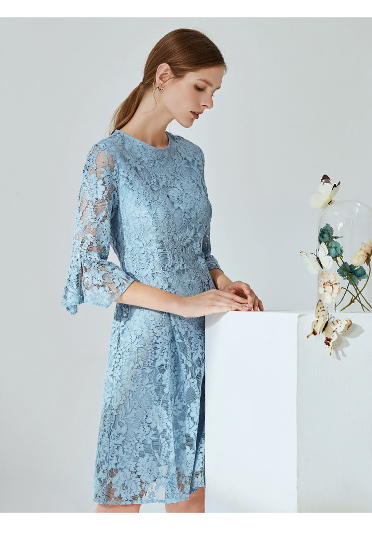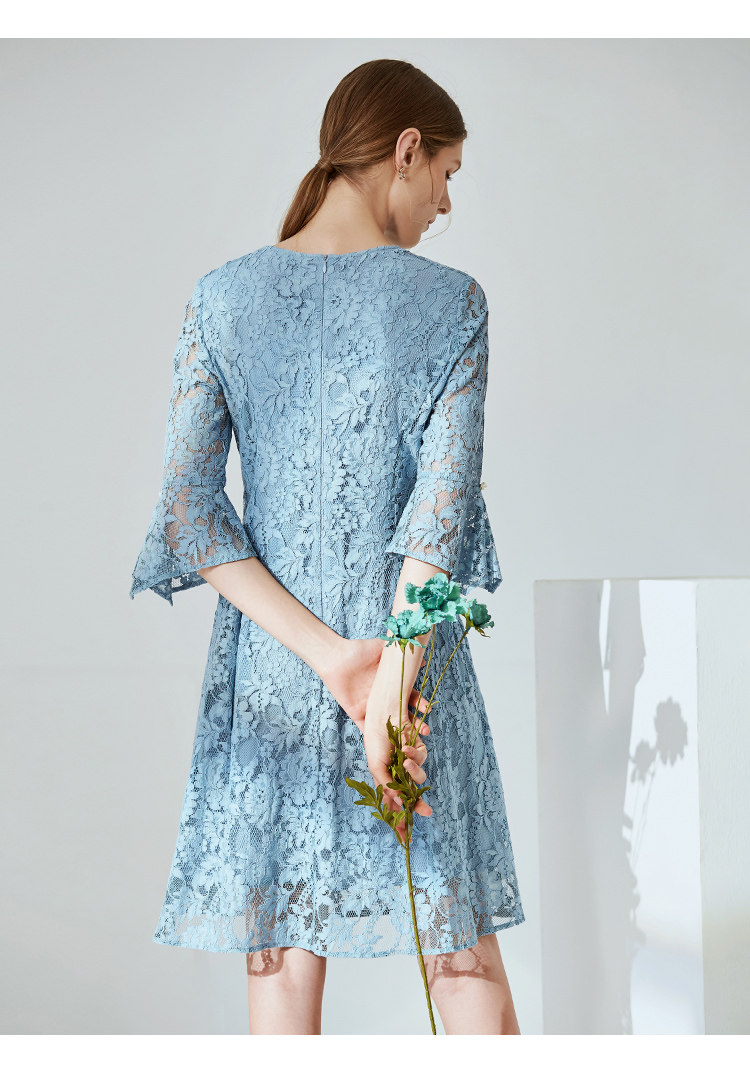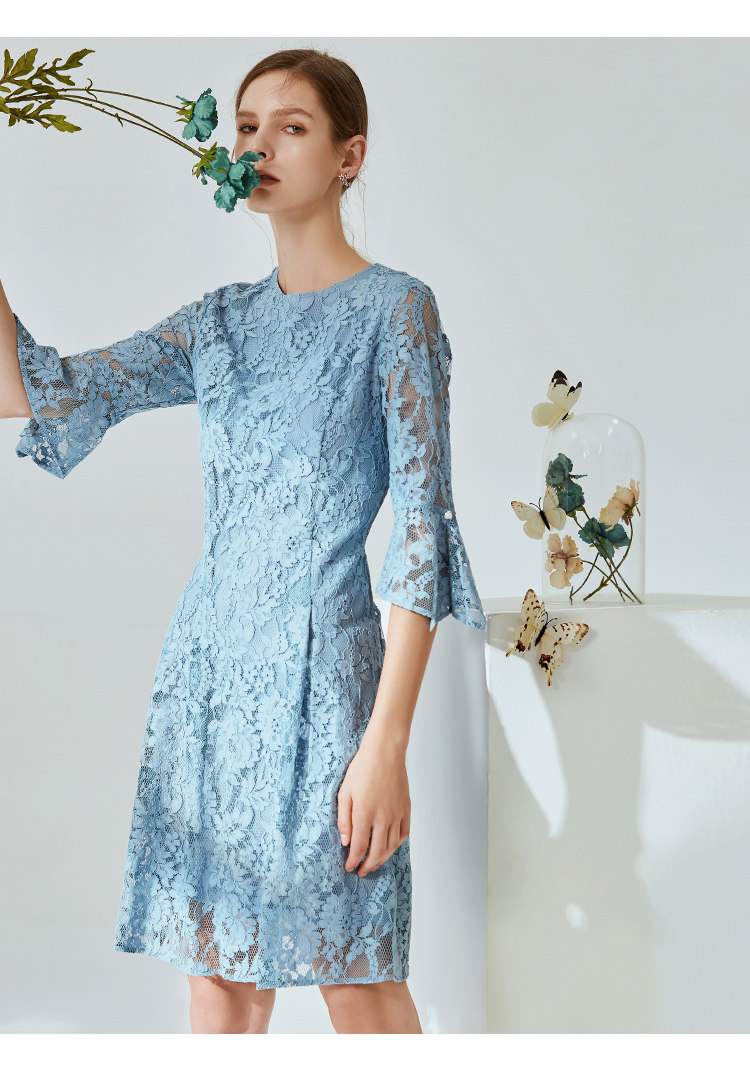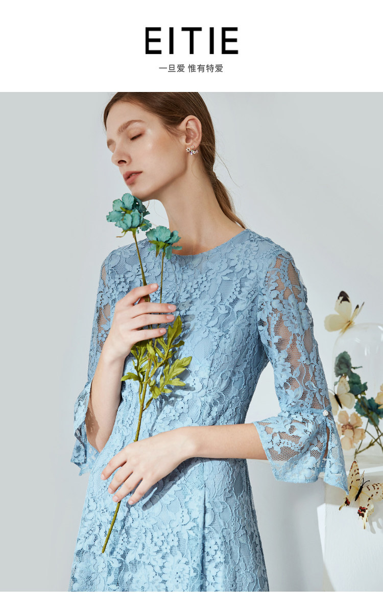 EITIE爱特爱新款优雅气质镂空蕾丝收腰A字喇叭袖连衣裙女A2007411